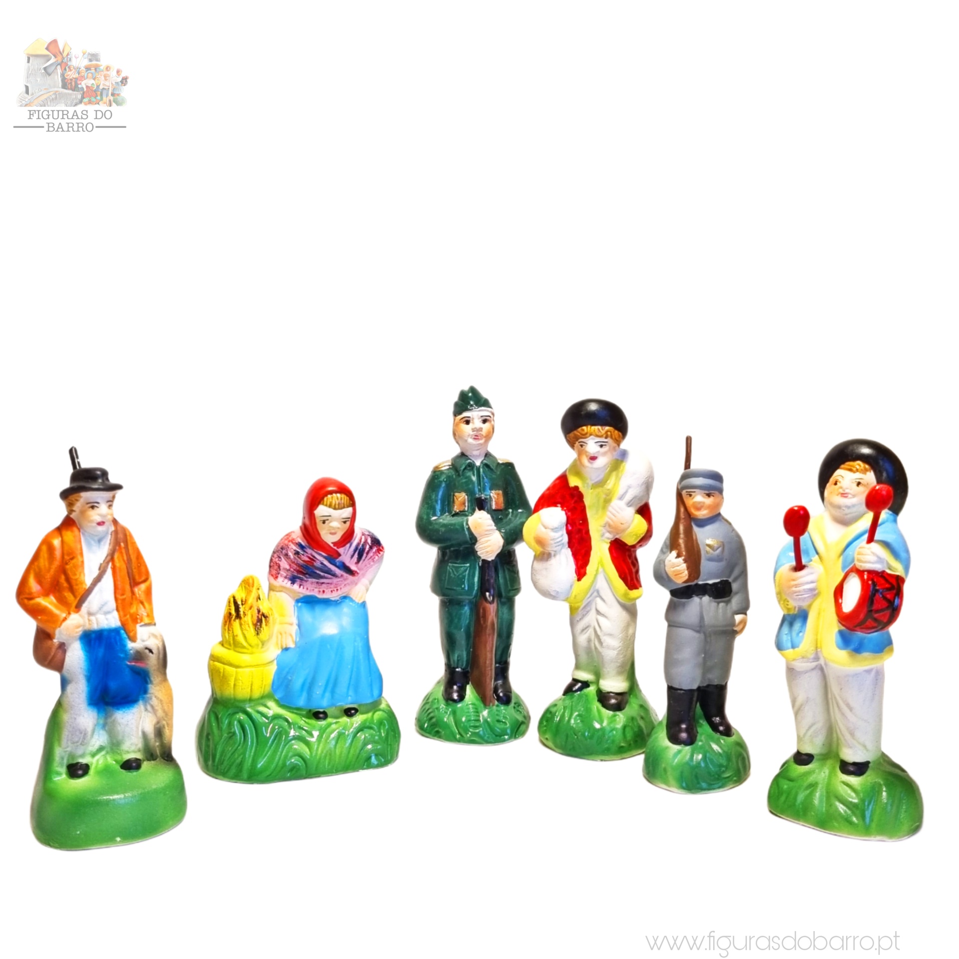 • Figuras em cerâmica pintadas à mão de pessoas em trajes tradicionais e uniformes sobre bases verdes