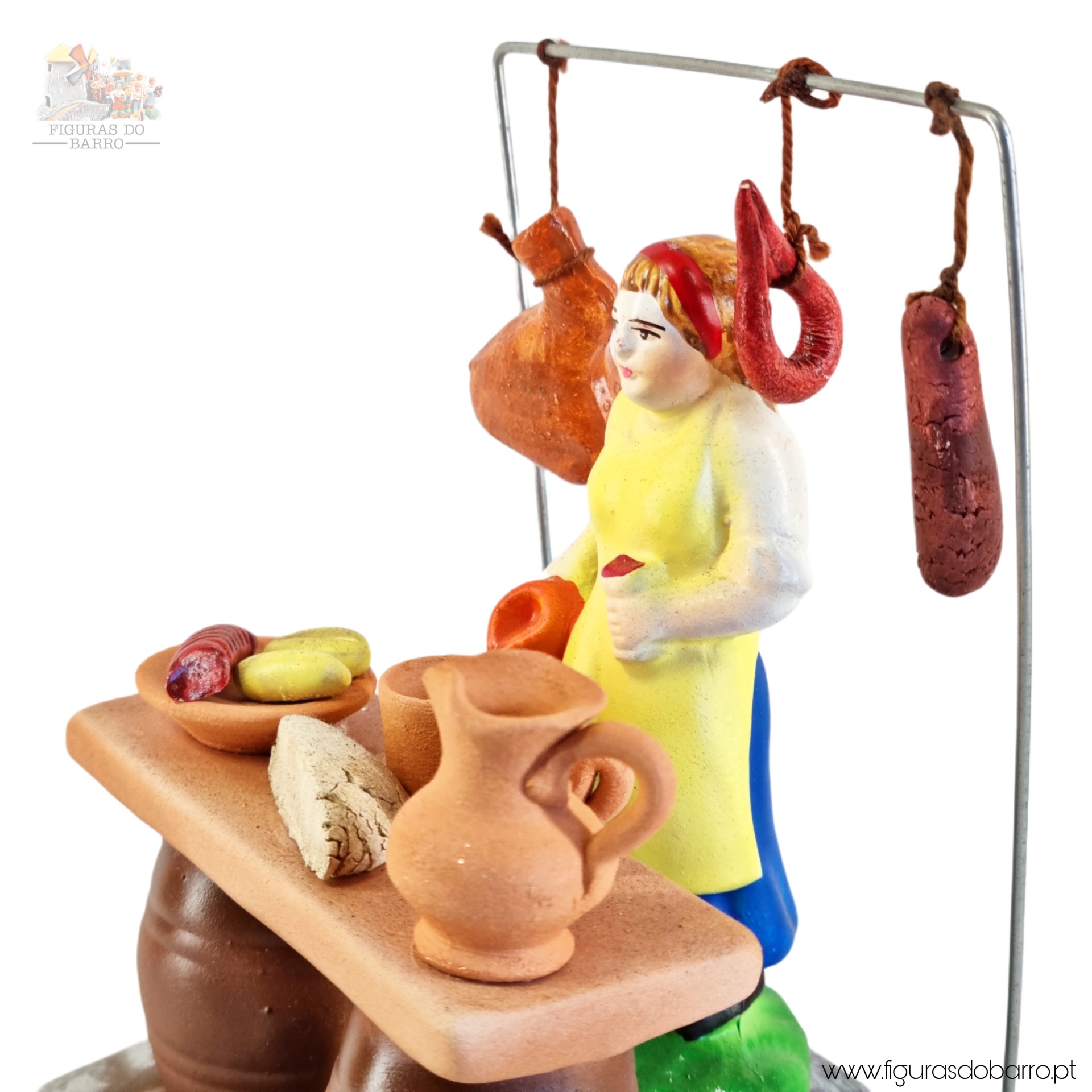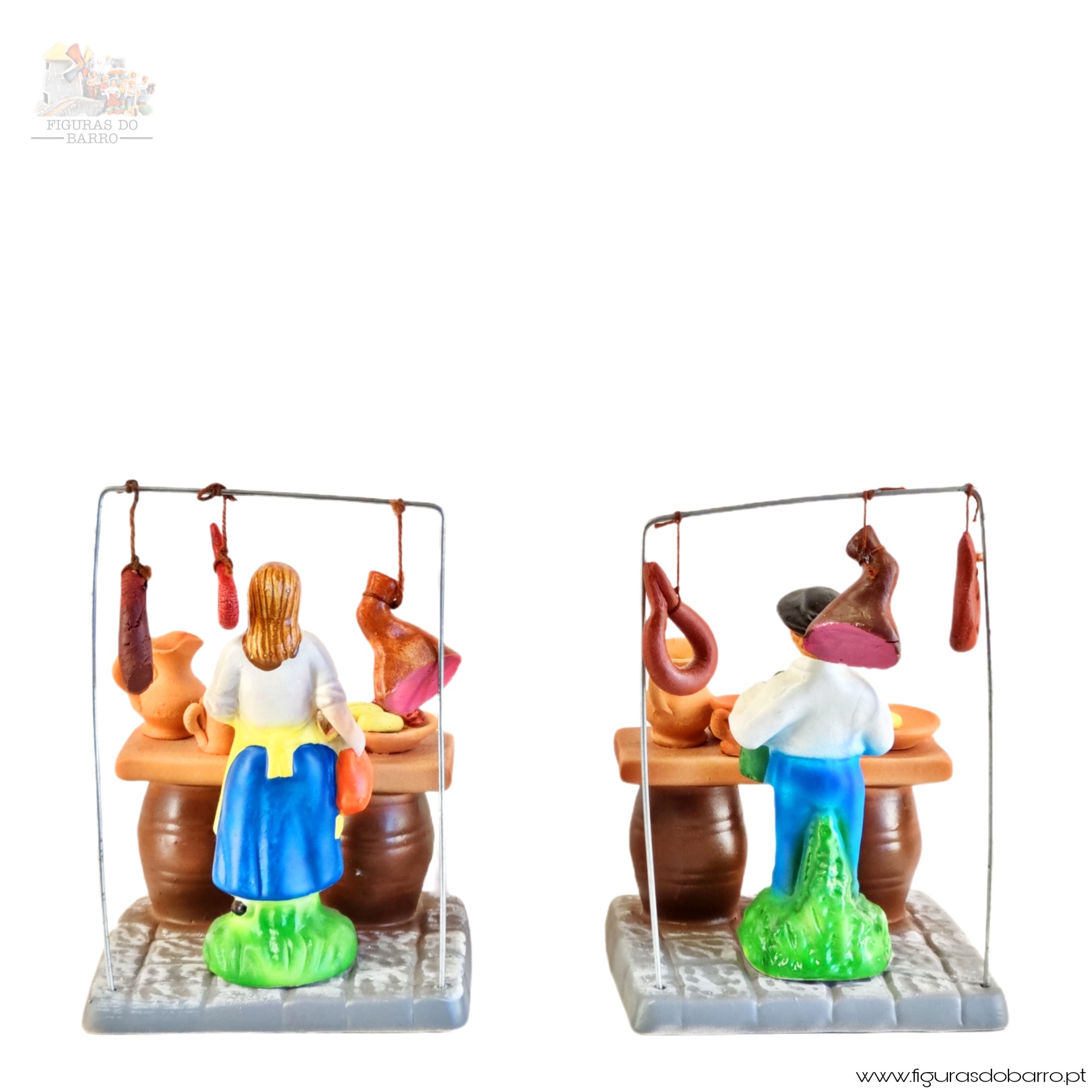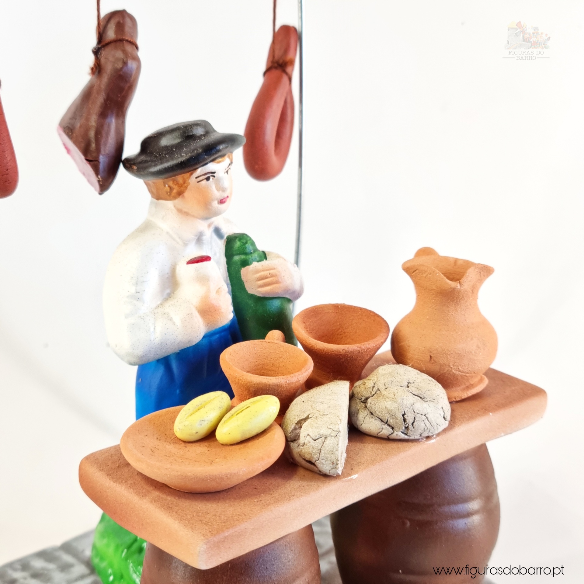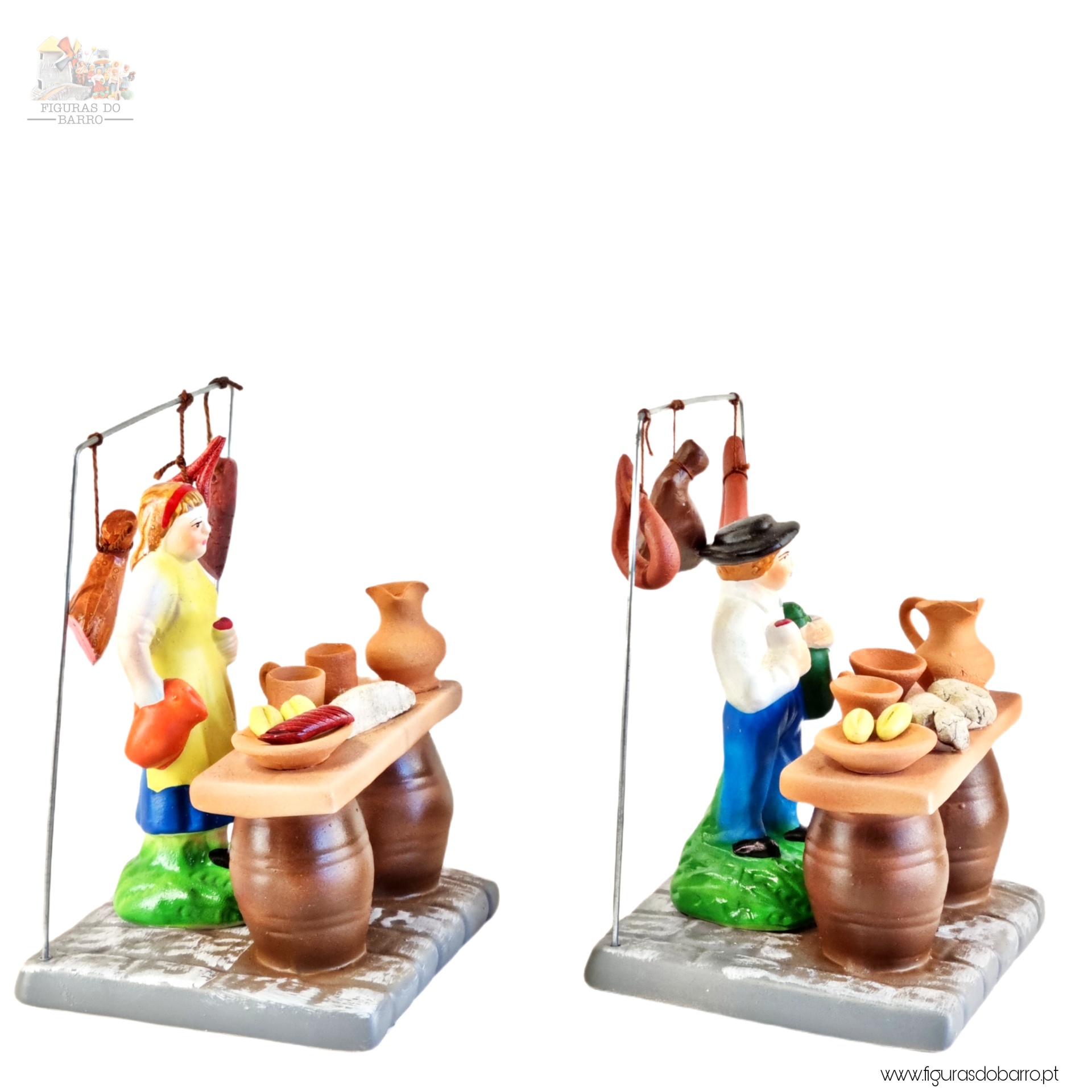 A Tasca 37,50 € Desconto de %. IVA incluído. Partilhar Homem / Mulher Homem Mulher Comprar Contactar 1 unidades em stock Figura do homem e da mulher na tasca, a vender produtos tradicionais (enchidos, pão, etc) em cerâmica, ideal para completar a sua cascata de S. João. ----- (peças em cerâmica feitas de forma artesanal e pintadas à mão) ----- As peças em cerâmica, certificadas, são da autoria do Artesão João Macedo de Barcelos. Medidas: aproximadamente 15cm de altura. Ref. Interna: 360/360B Marca Figuras do Barro® Tags cascatacascata de sao joaohandmadeceramicceramicaceramicartClaybancaPotterysantos popularessao joaofesta do são joãofestas popularestascamulher a venderhomem a venderenchidospaochouriçopresuntobroa de milhoVinhocanecas Características