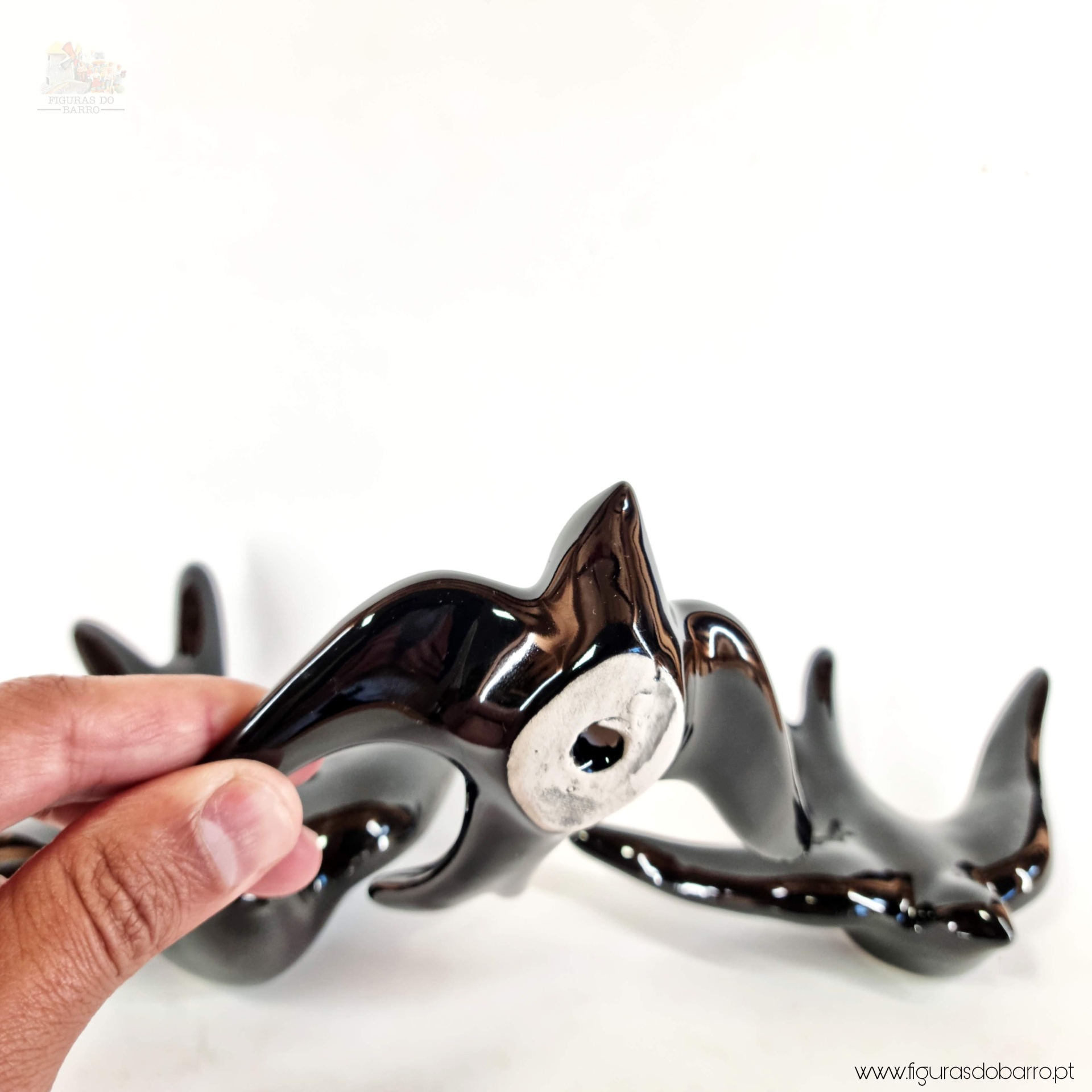 • Figura decorativa preta em forma de tubarão com detalhe branco no olho e buraco central, segurada por mão