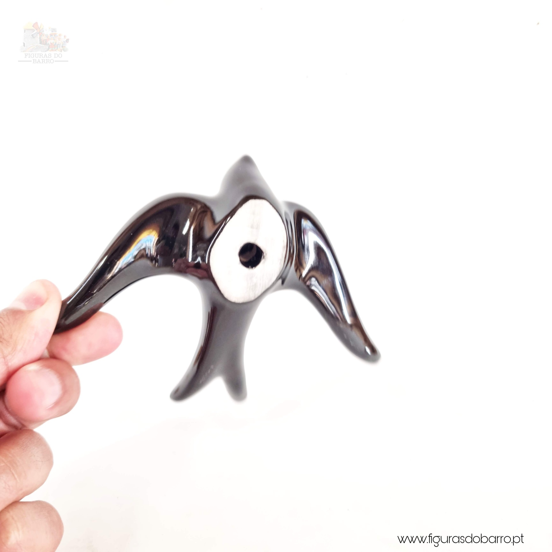 • Escultura de cerâmica preta em forma de pássaro, com acabamento brilhante, segurada por uma mão