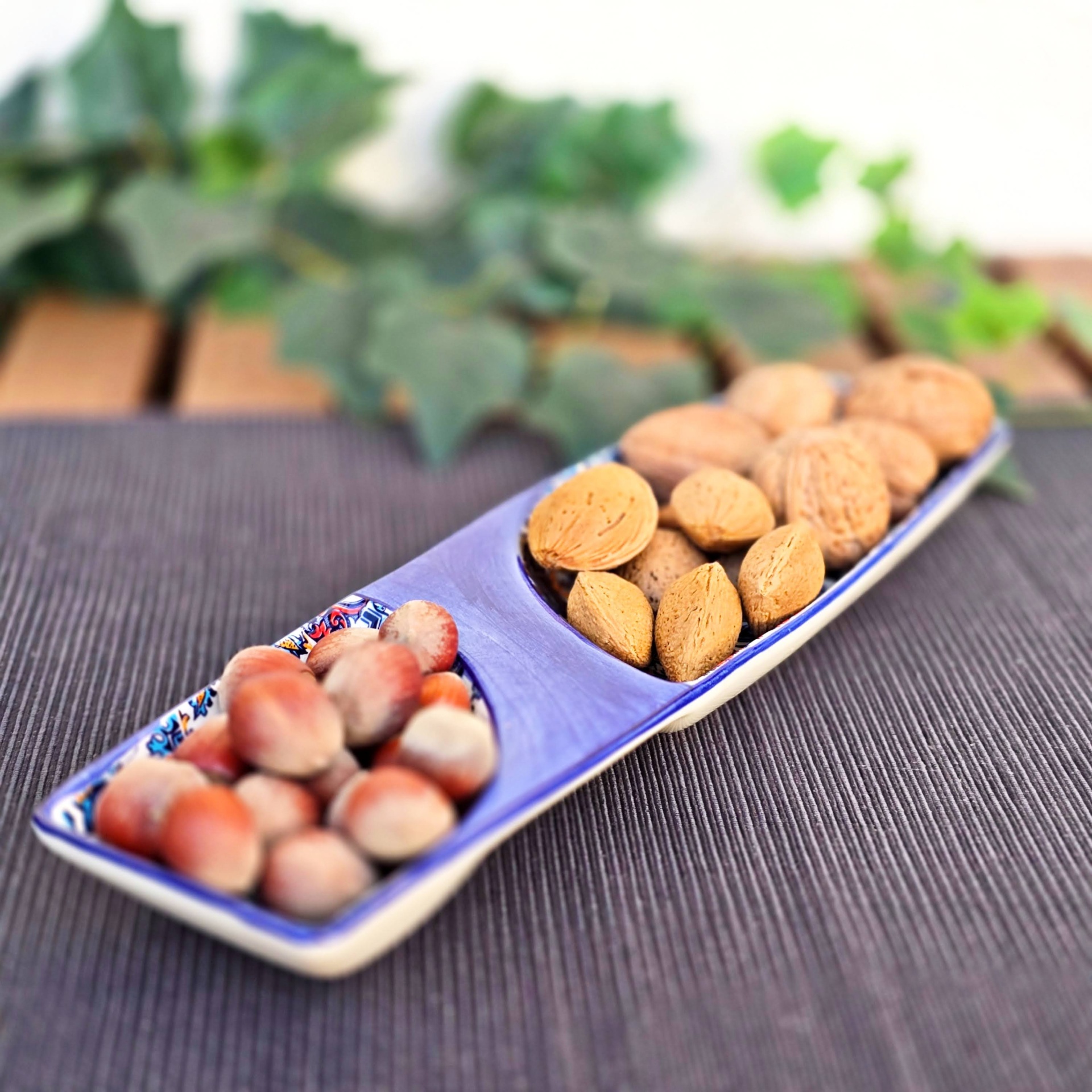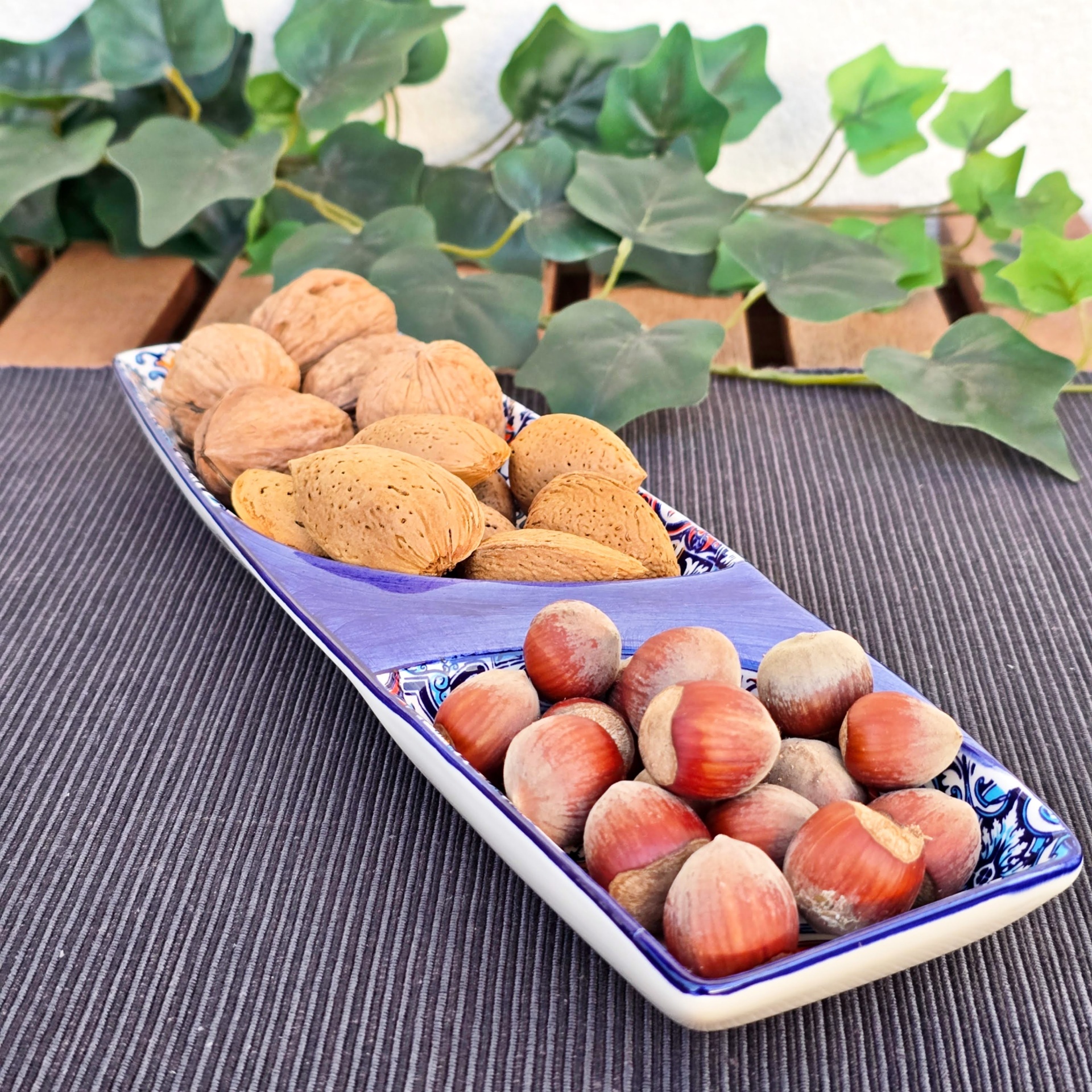 • Travessa azul com amêndoas e avelãs inteiras em toalha cinzenta riscada