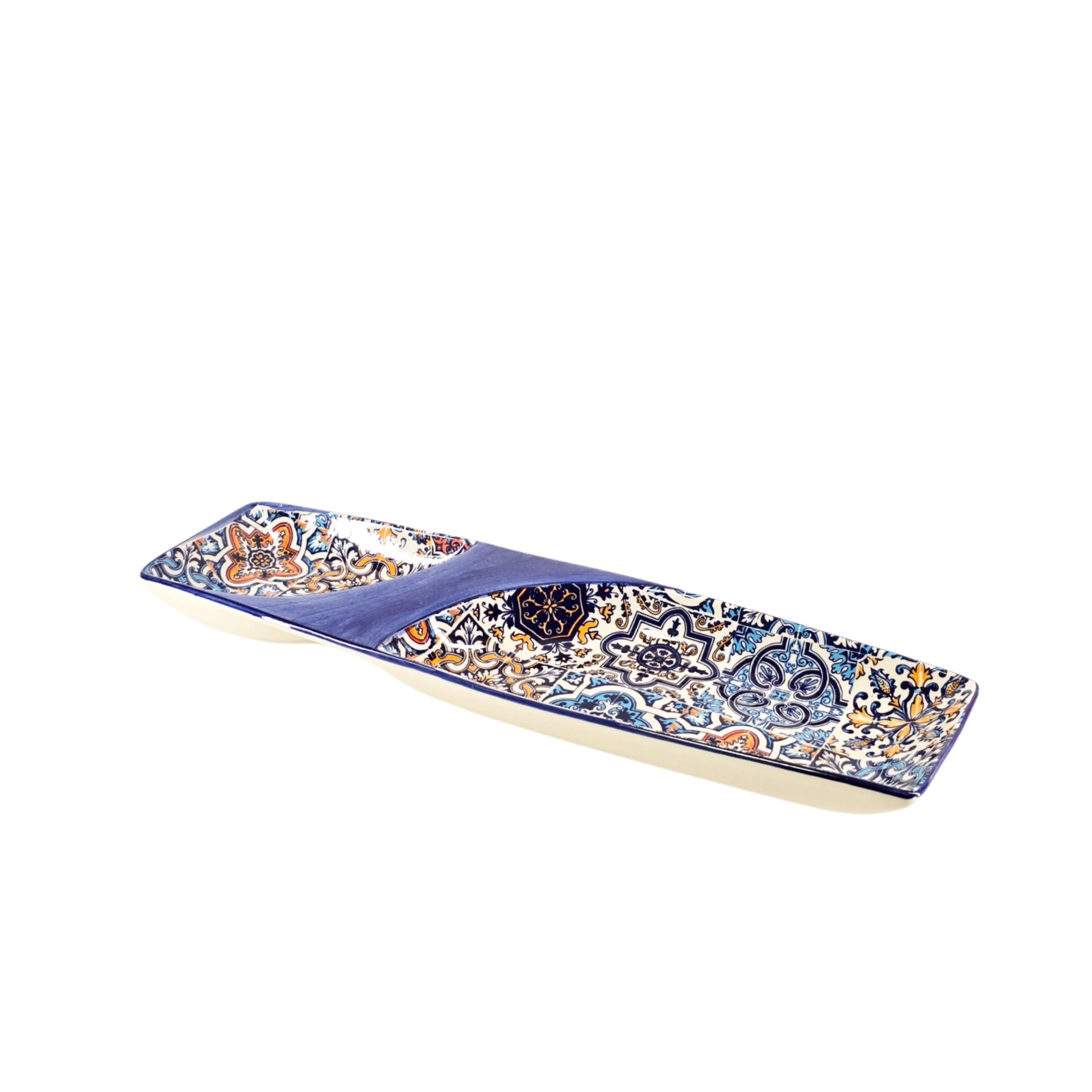 • Prato retangular cerâmico com padrão colorido e detalhe azul