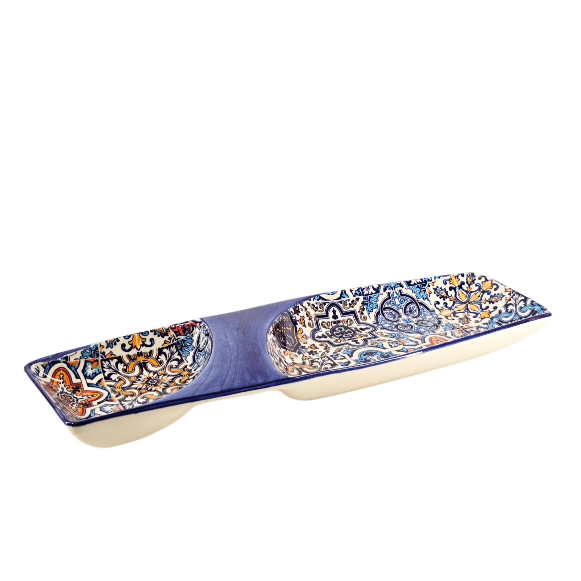 • Petisqueira dupla em cerâmica com padrão colorido inspirado em azulejos
