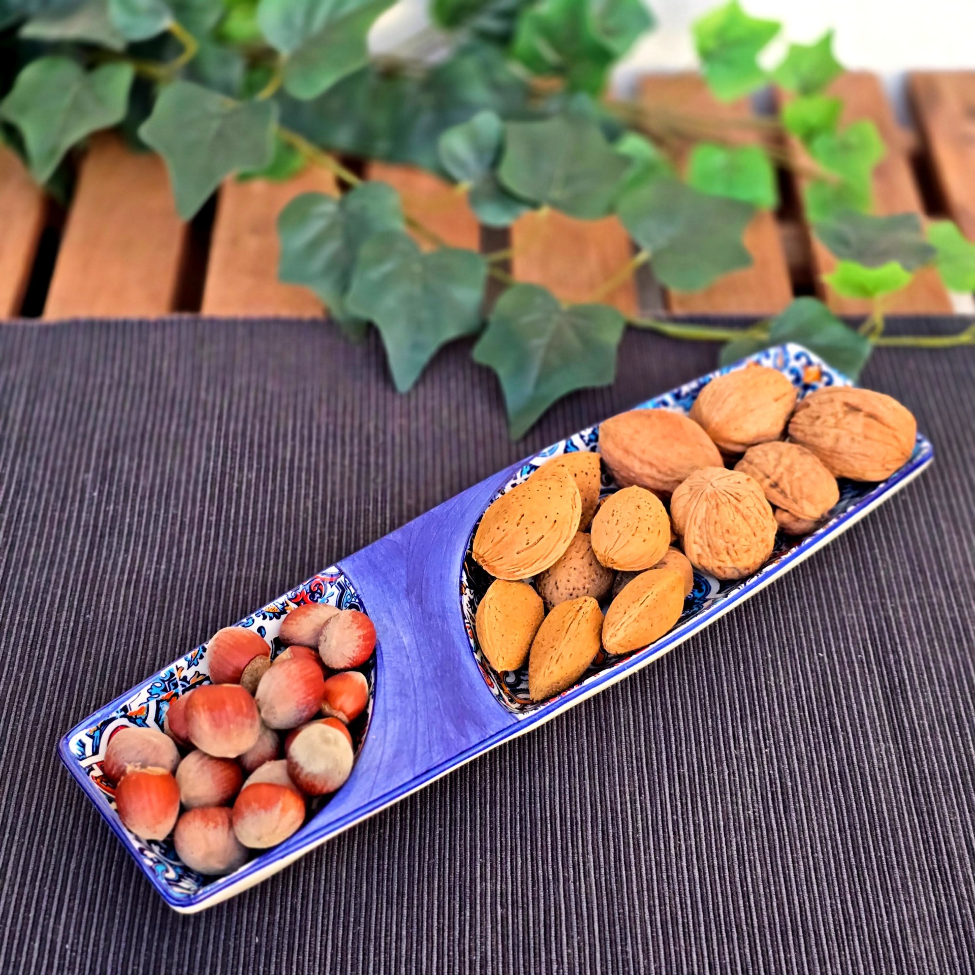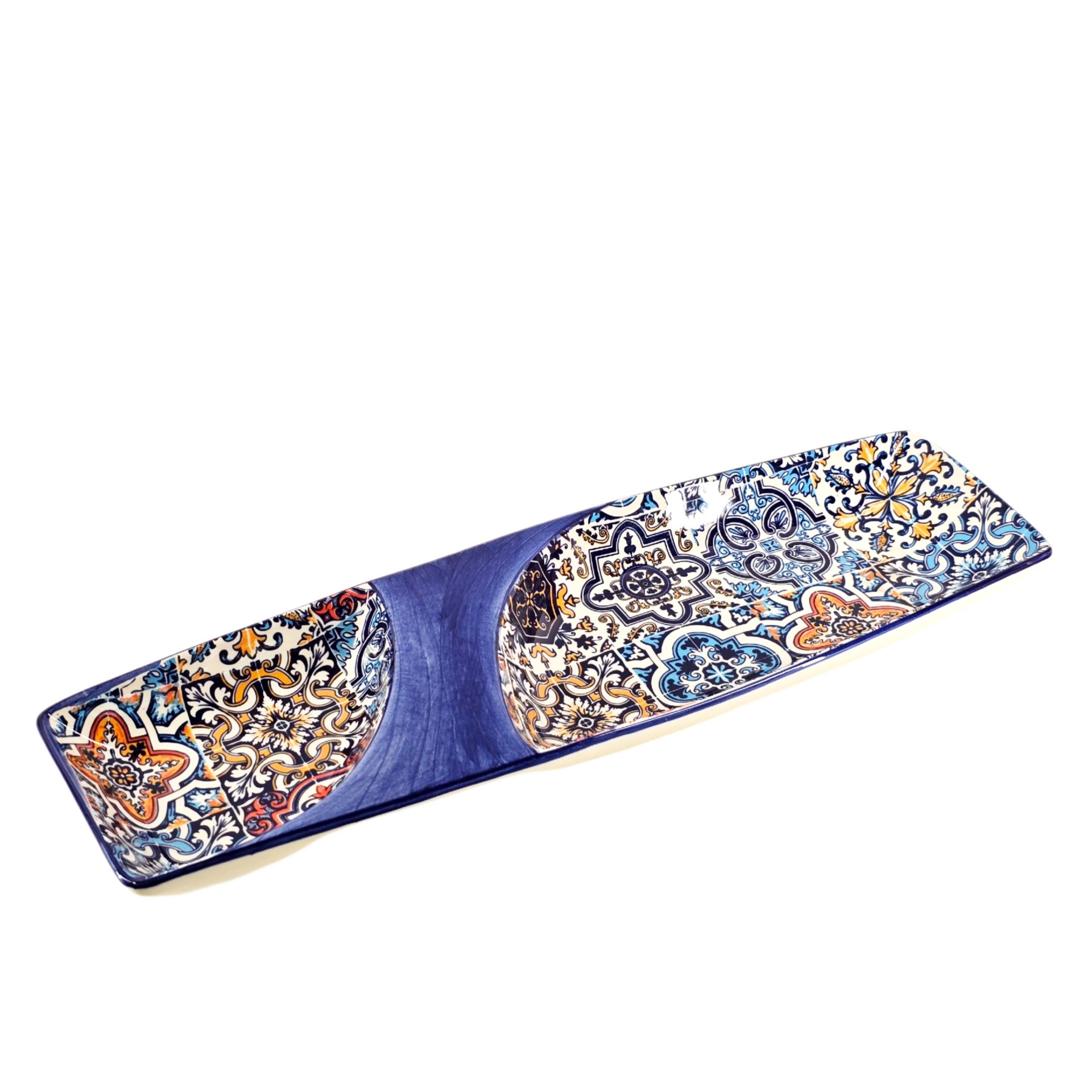 • Prato de cerâmica retangular com padrão de azulejos coloridos e centro azul escuro