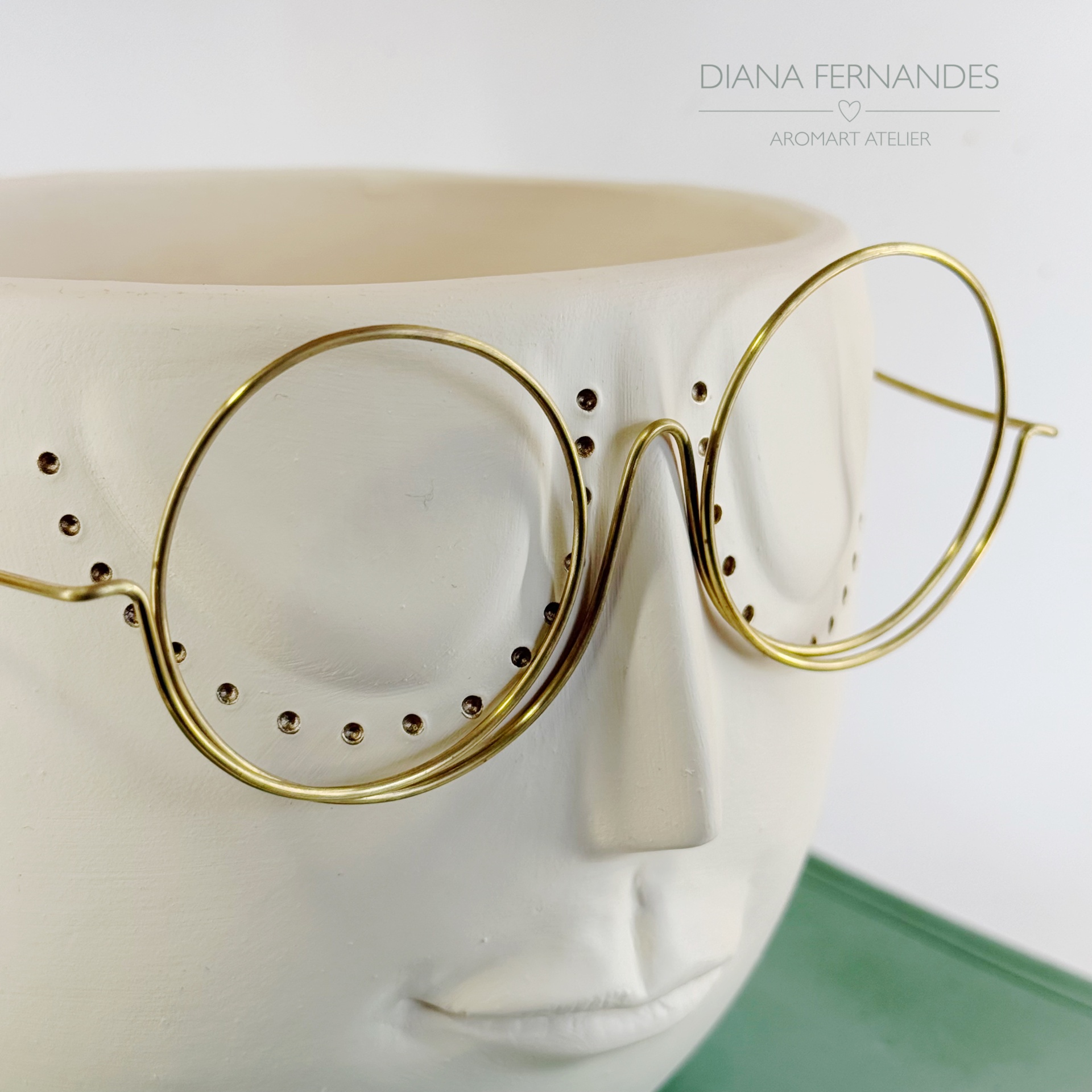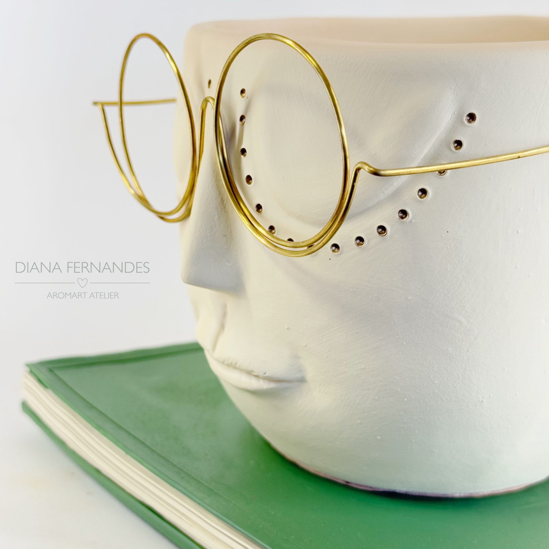 • Vaso branco em forma de rosto com óculos dourados sobre livros