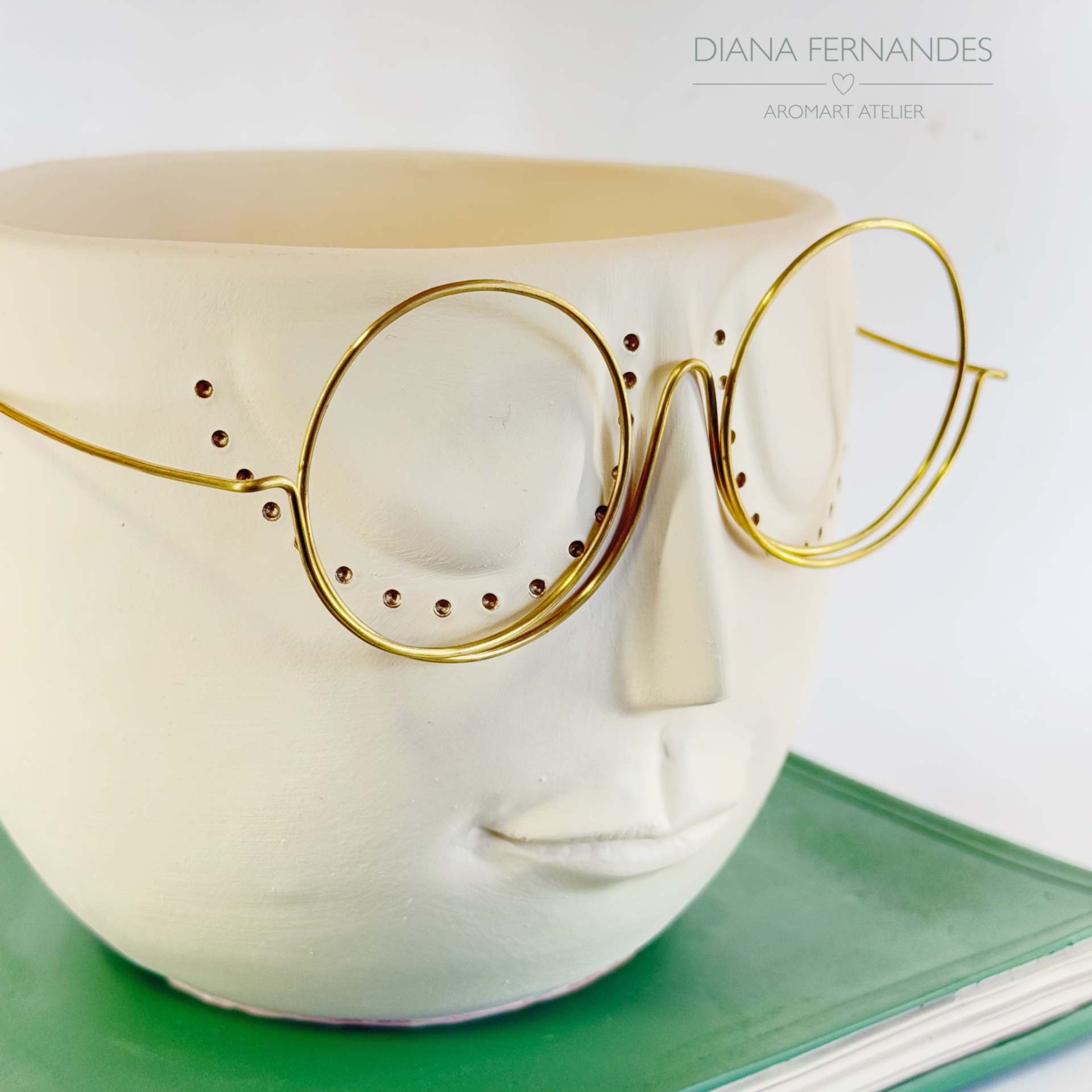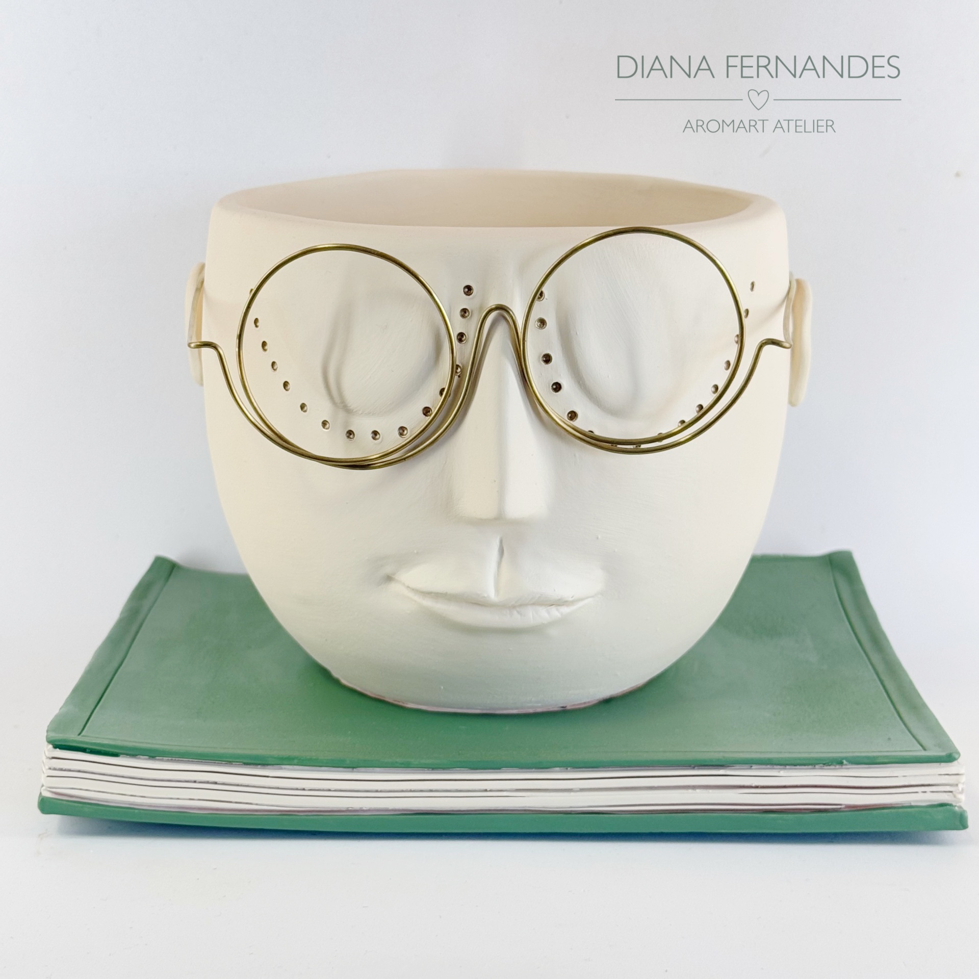Vaso branco em forma de rosto com óculos dourados sobre livros