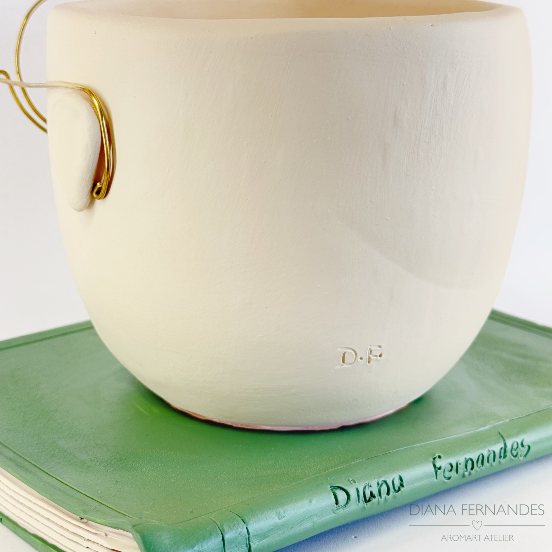 • Vaso branco de cerâmica com inscrições D.F sobre livro verde Diana Fernandes