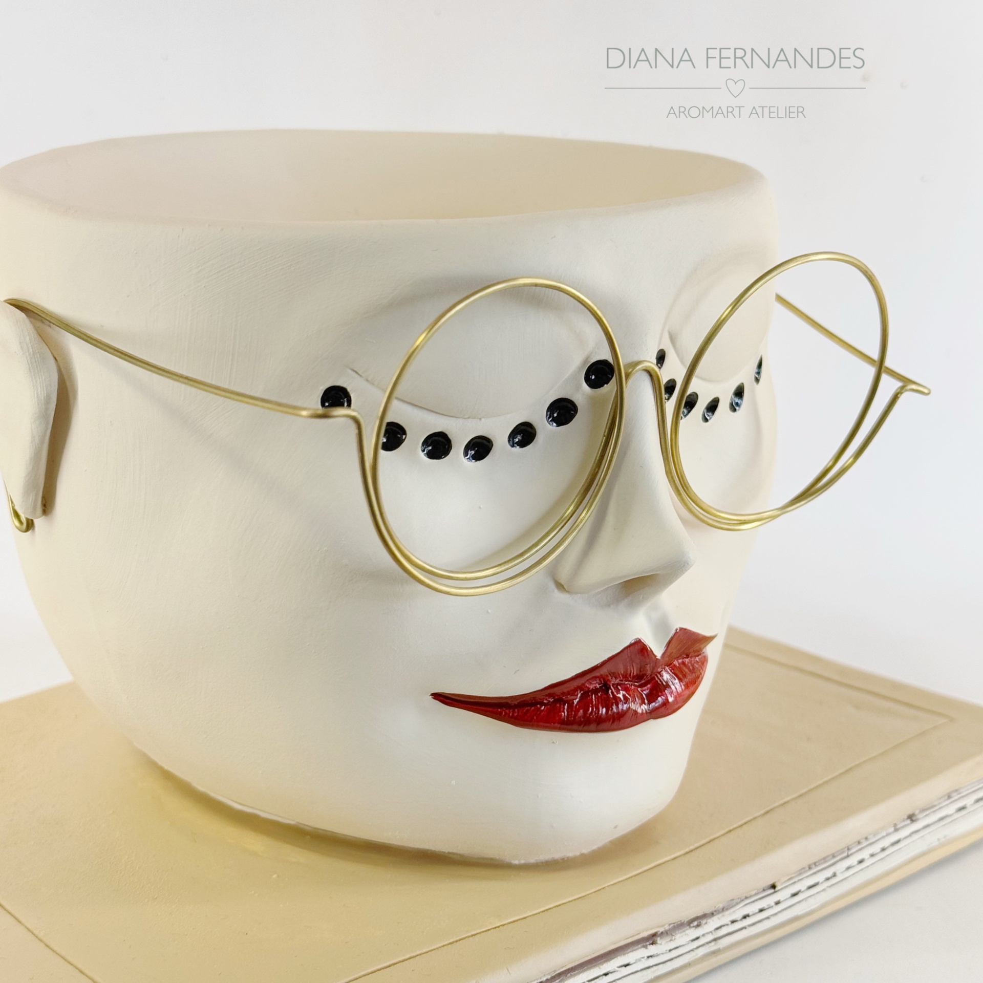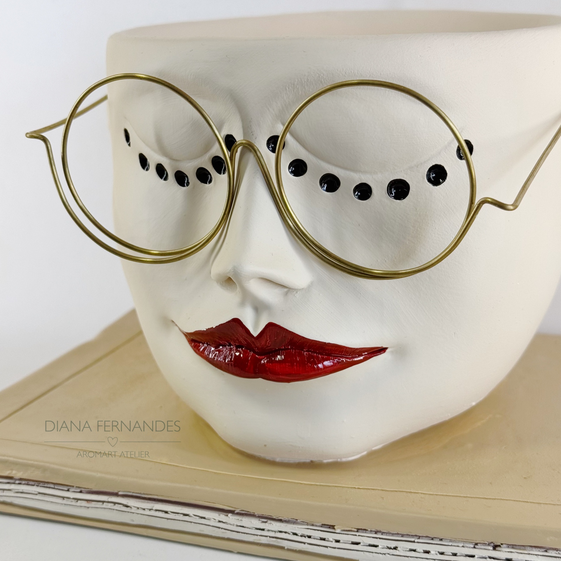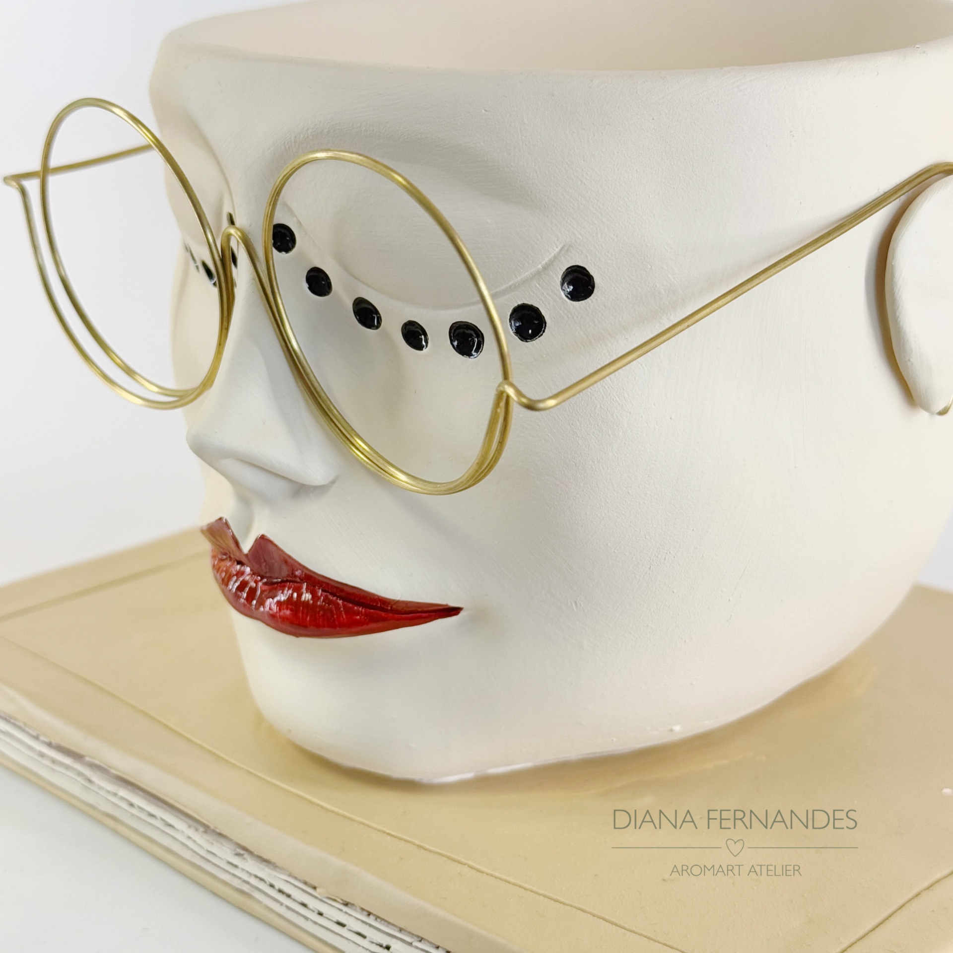 • Escultura facial em cerâmica branca com lábios vermelhos e óculos dourados
