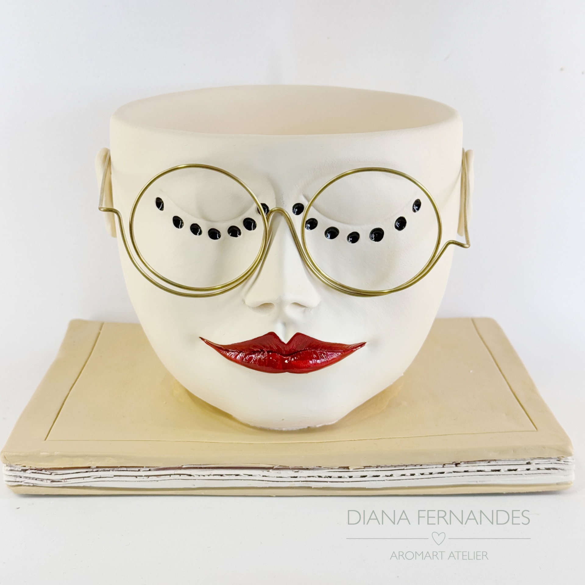 • Vaso decorativo rosto feminino com óculos e base de livro