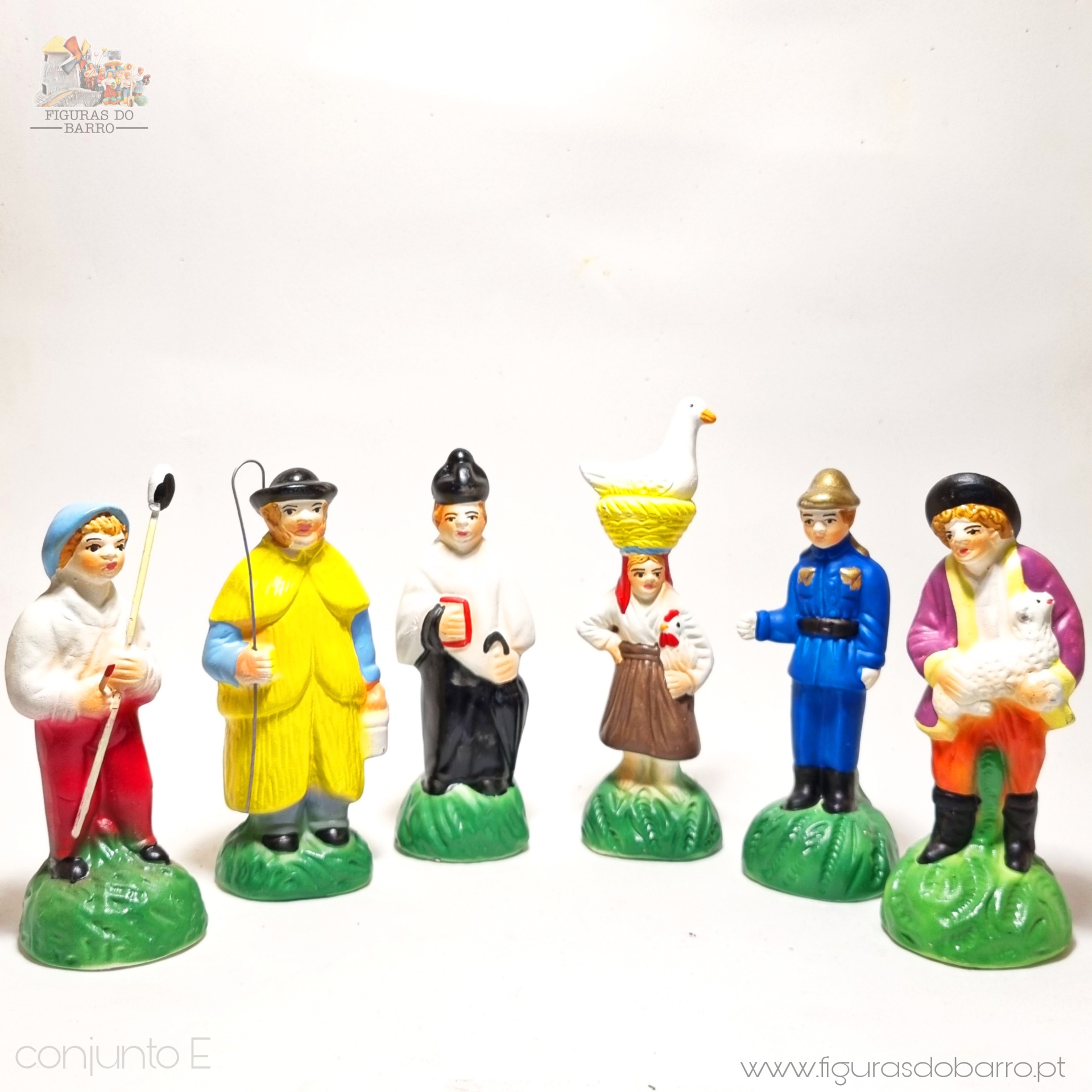 • Seis figuras cerâmicas pintadas à mão de personagens rurais com roupas coloridas