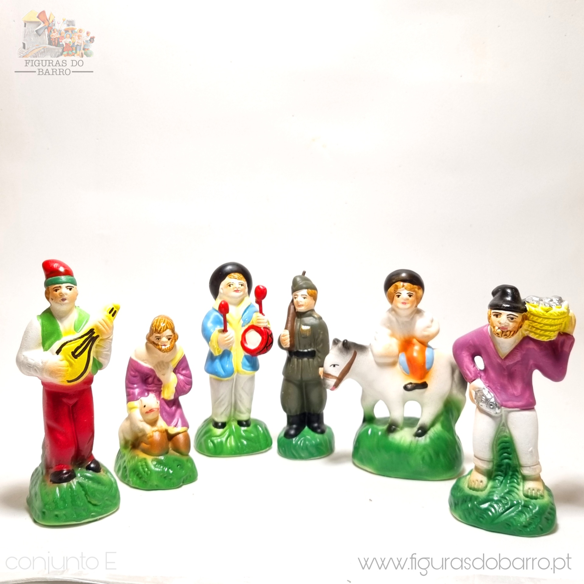 • Figuras de barro coloridas de personagens tradicionais com instrumentos e criança em burro sobre base verde