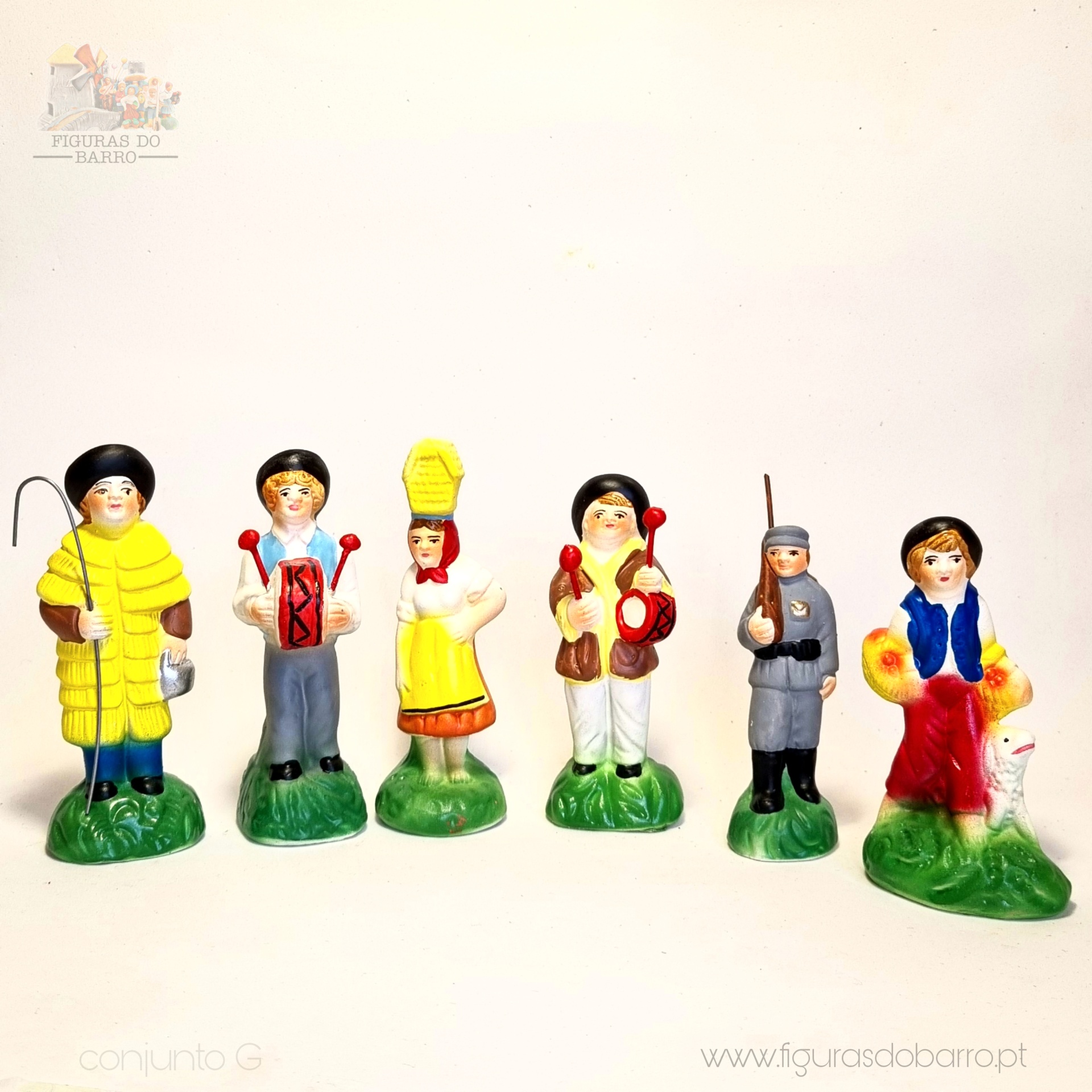 • Seis figuras de barro pintadas à mão com roupas tradicionais e bases verdes