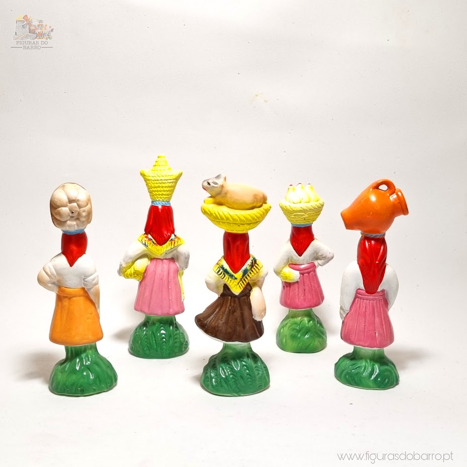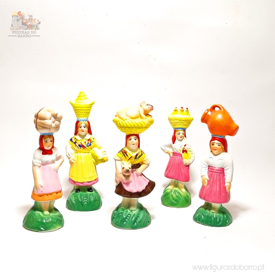 O conjunto é composto por 5 peças individuais em cerâmica (mulheres que levam na cabeça os mais variados objectos, utensílios, frutas, animais, etc.), ideal para completar o seu presépio ou as cascatas de São João.