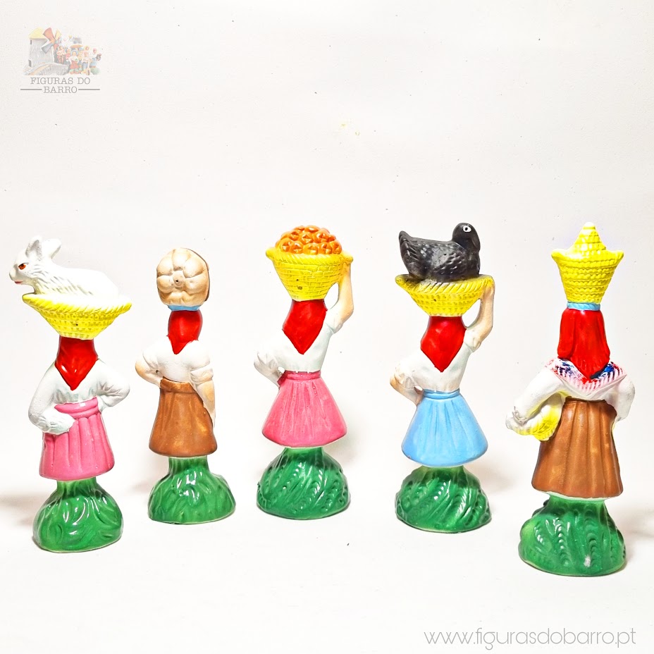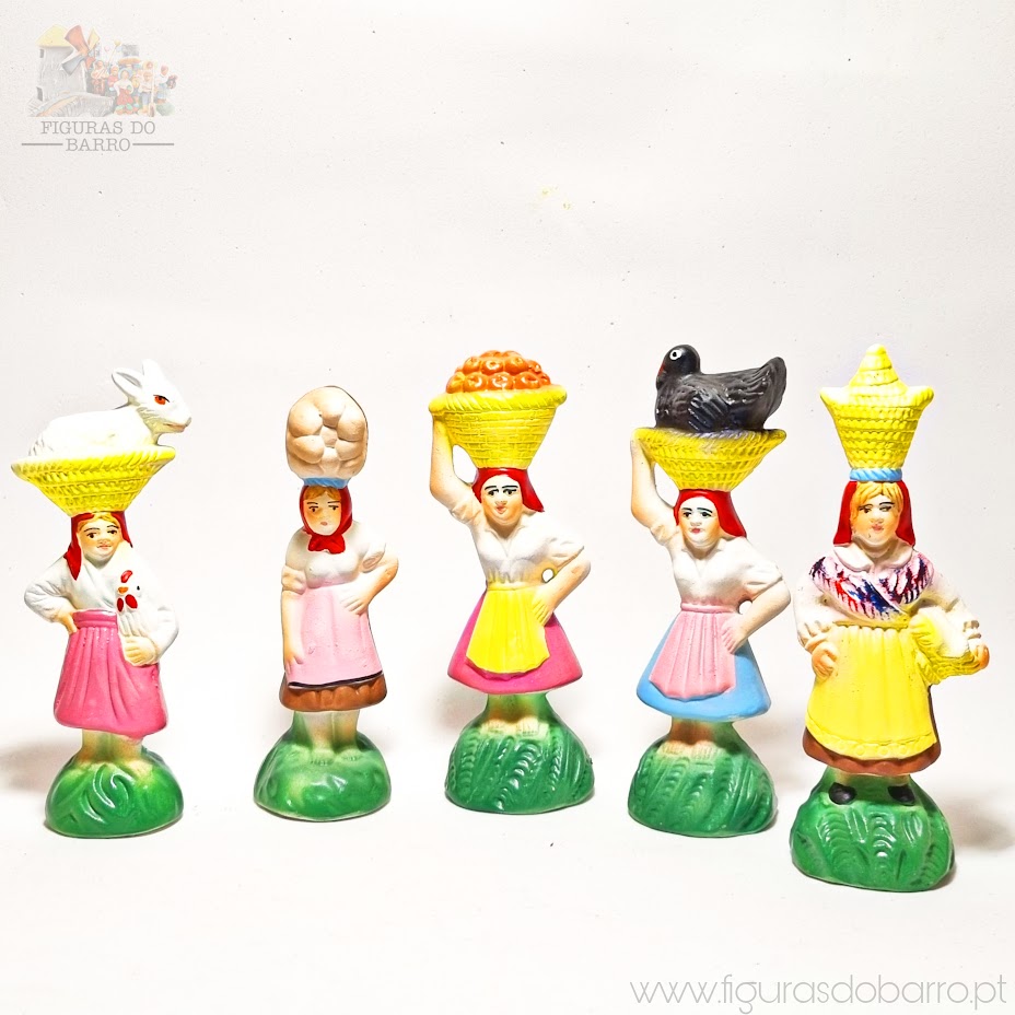 O conjunto é composto por 5 peças individuais em cerâmica (mulheres que levam na cabeça os mais variados objectos, utensílios, frutas, animais, etc.), ideal para completar o seu presépio ou as cascatas de São João.