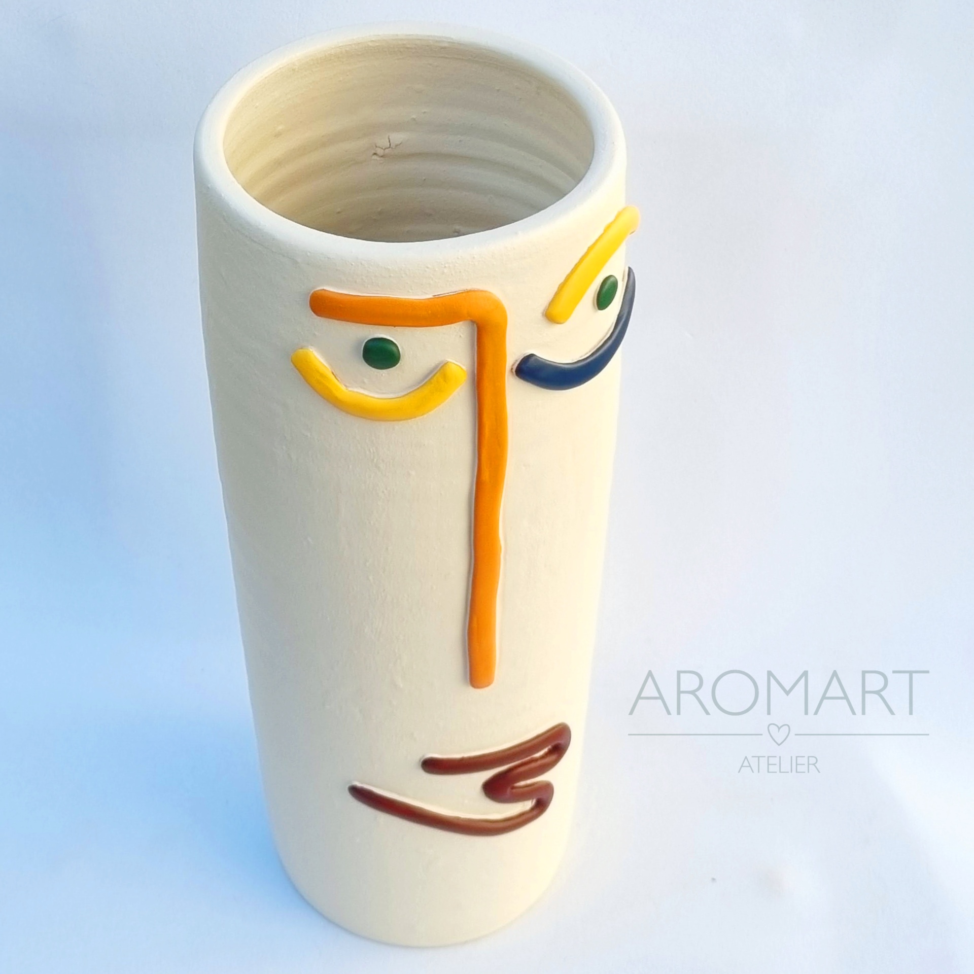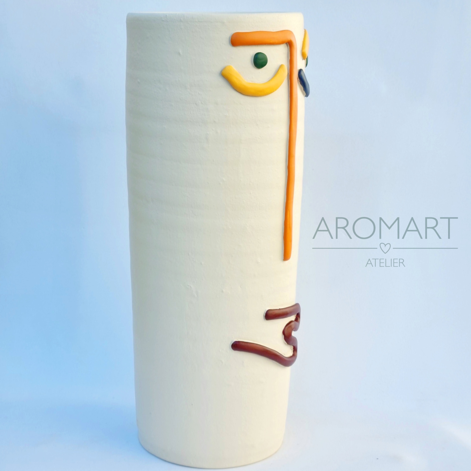 • Vaso cerâmico branco com rosto estilizado colorido em relevo e texto AROMART ATELIER ao lado