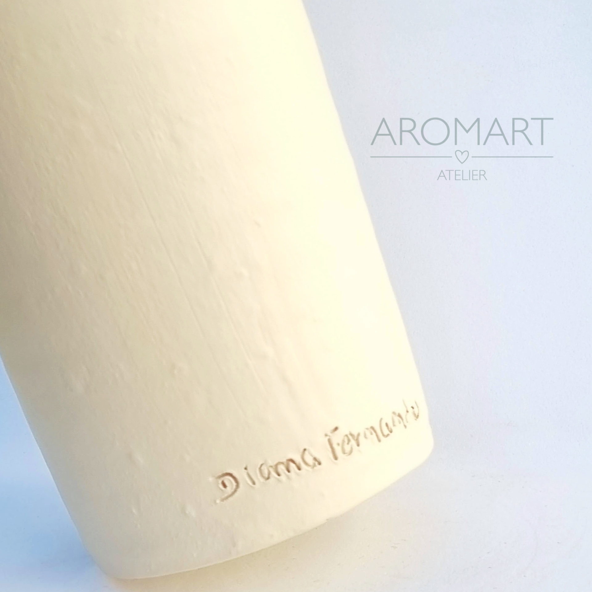 • Vaso decorativo branco com relevos coloridos e texto Aromart Atelier