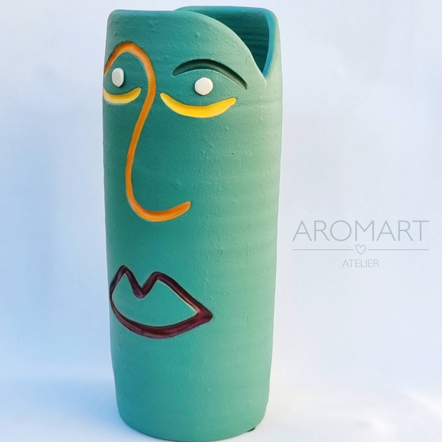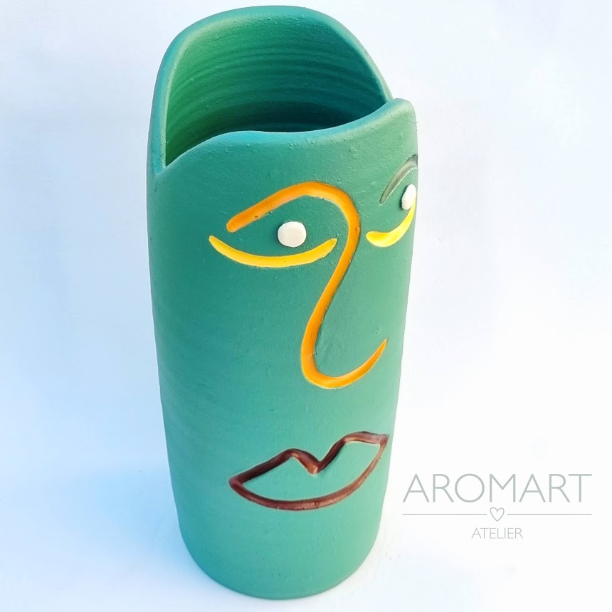 • Vaso cilíndrico verde com rosto pintado e texto 'AROMART ATELIER' ao fundo