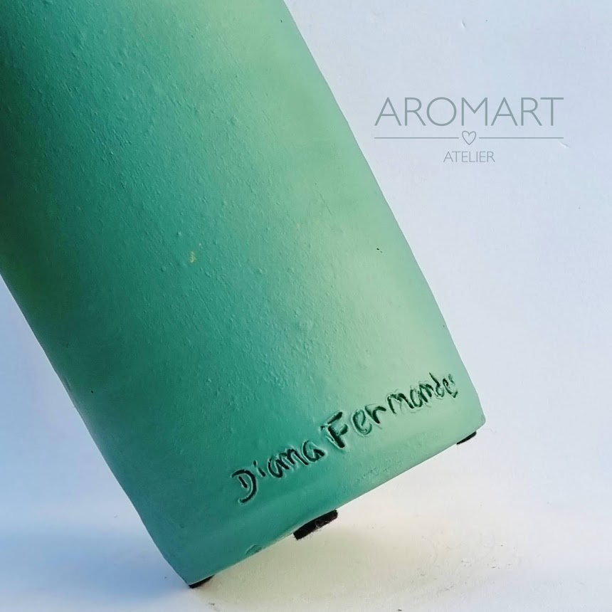 • Vaso de cerâmica verde com nome gravado e texto AROMART ATELIER ao fundo