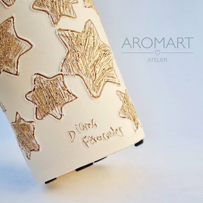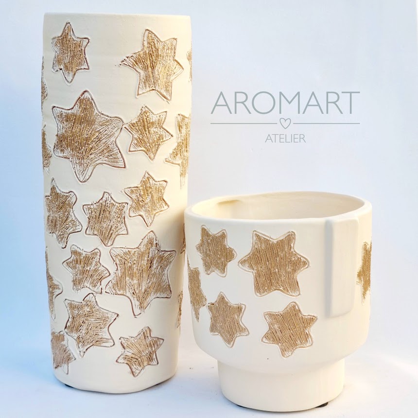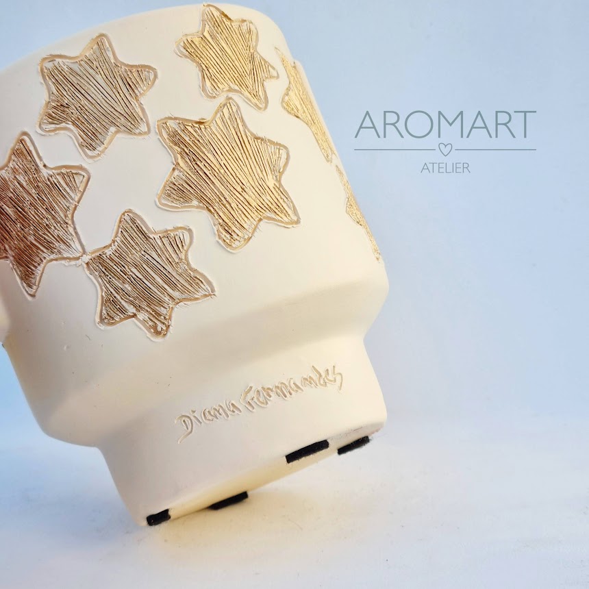 Vasos cerâmicos brancos com estrelas castanhas e texto Aromart Atelier
