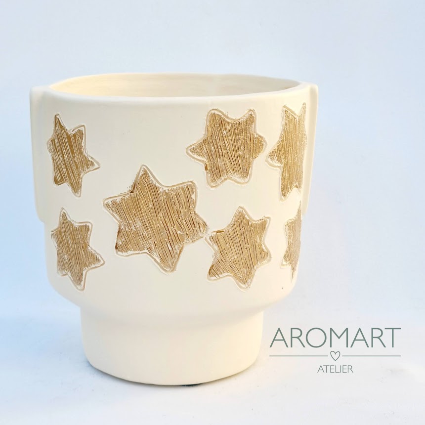• Vasos cerâmicos brancos com estrelas castanhas e texto Aromart Atelier