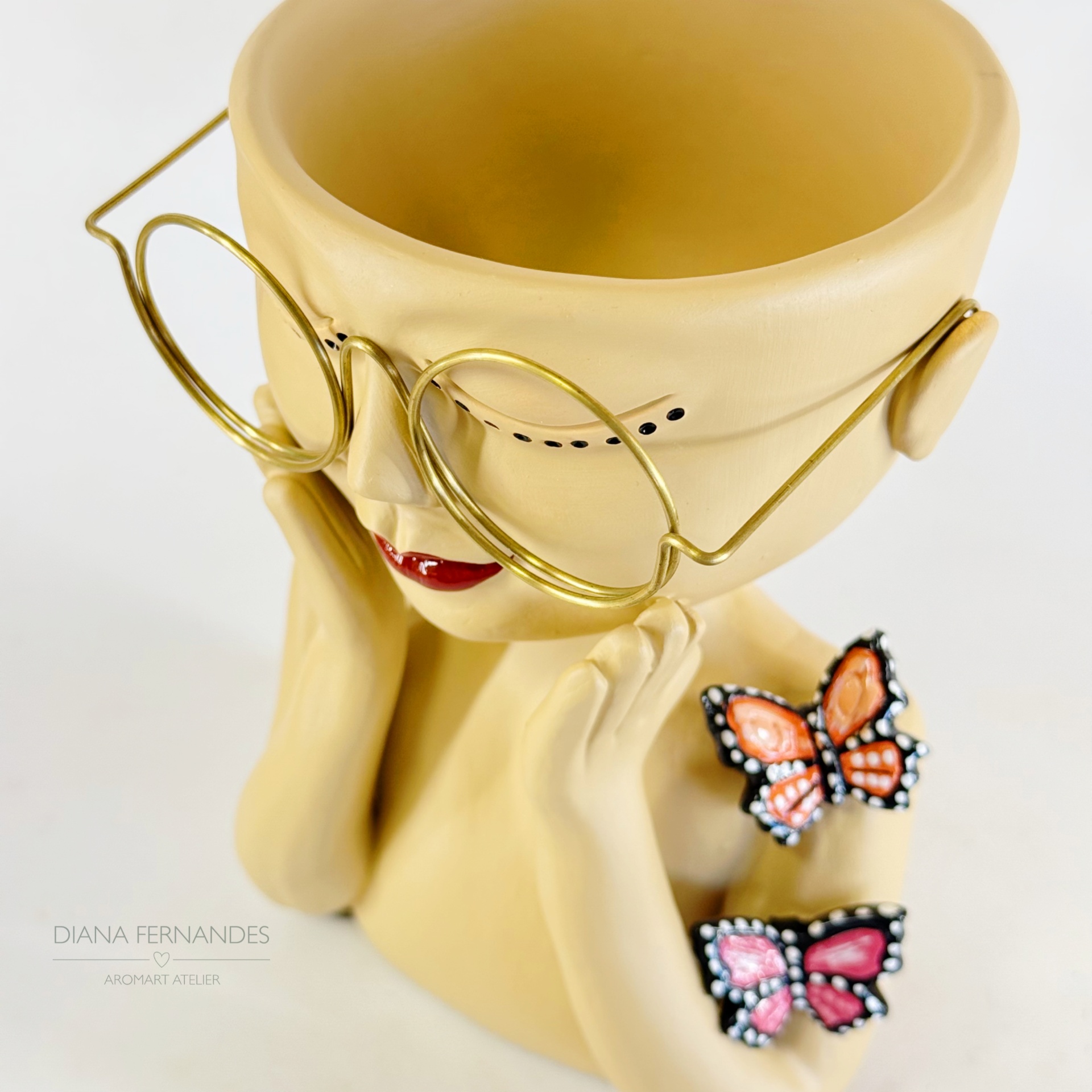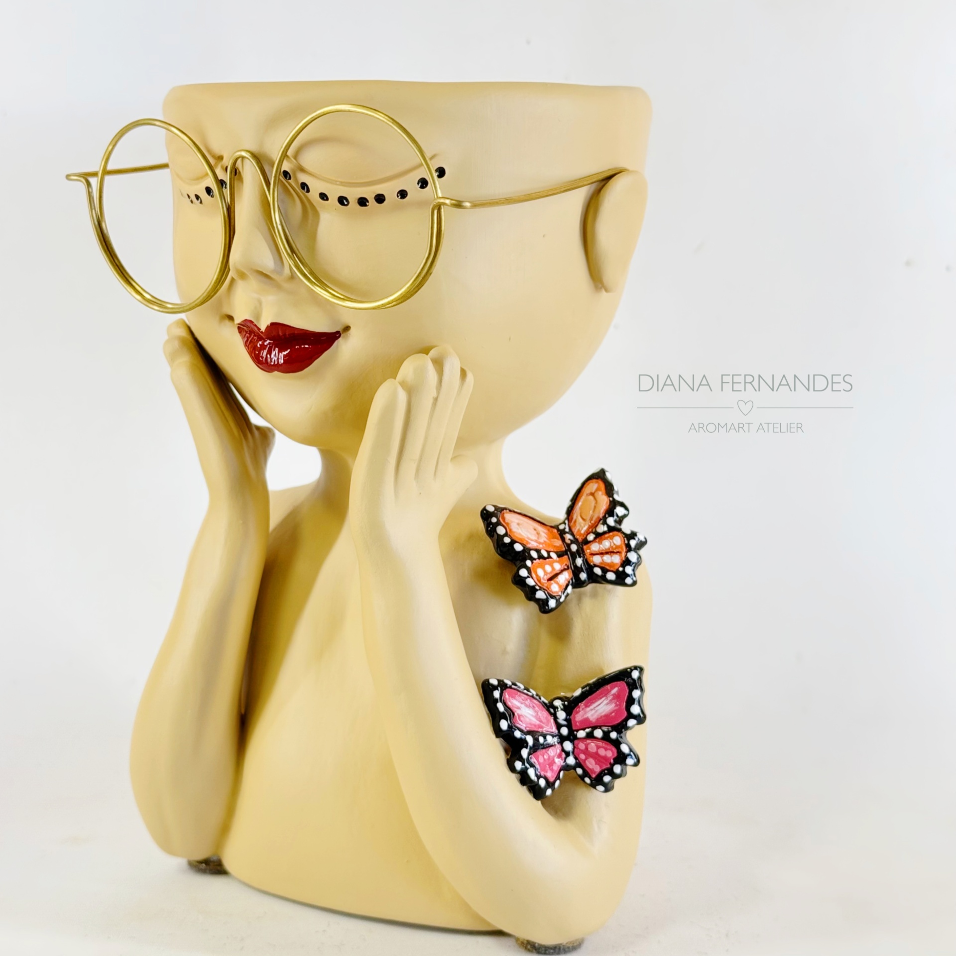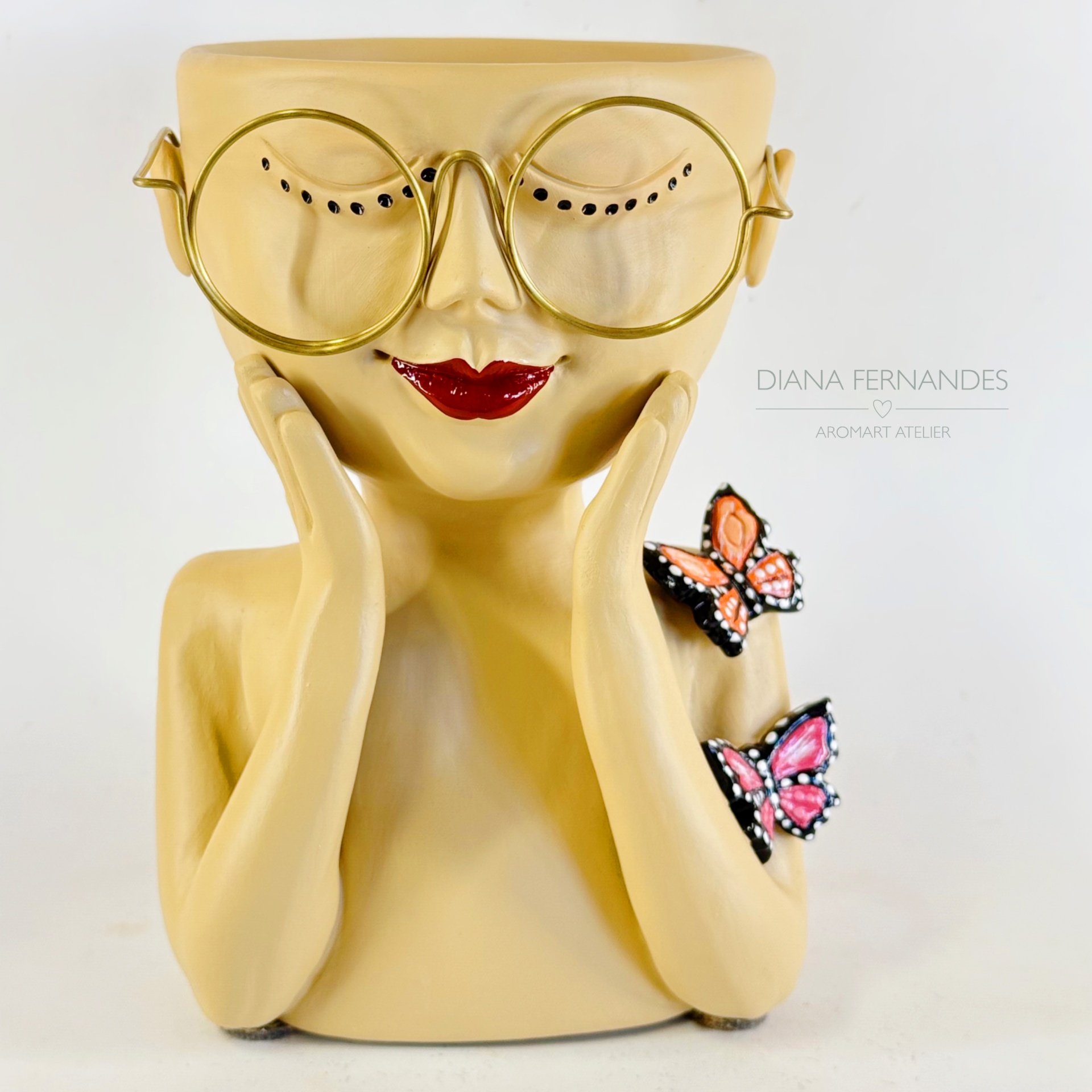 • Vaso decorativo formato rosto com óculos dourados e borboletas coloridas aplicadas