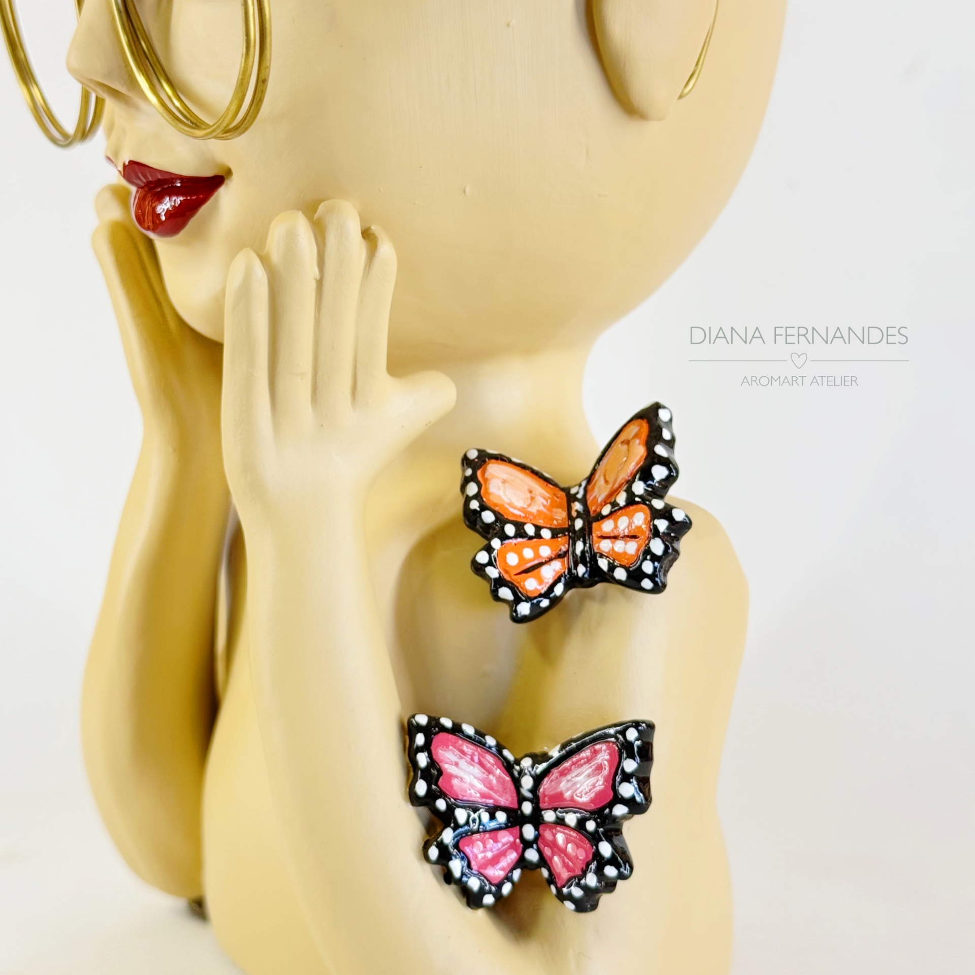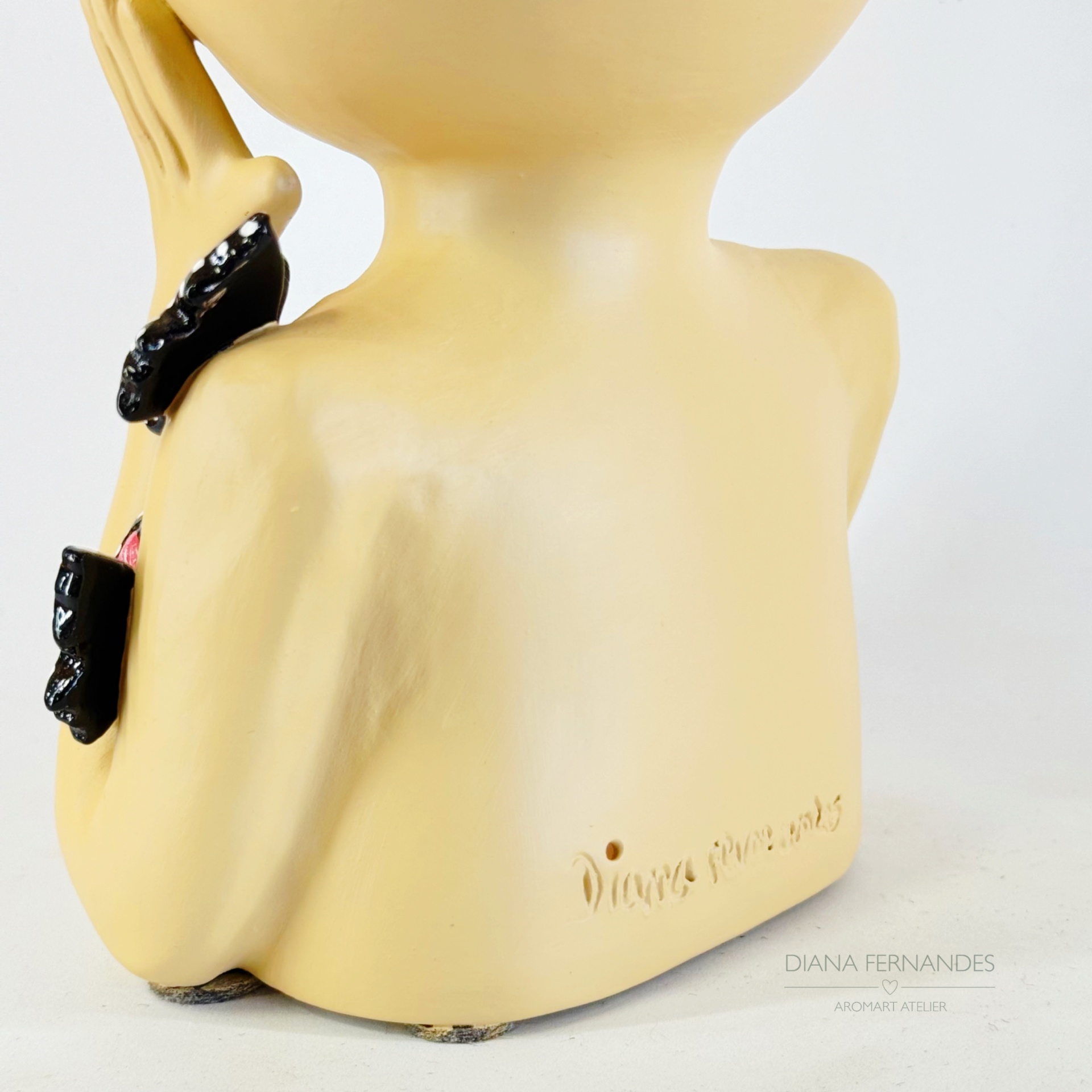 • Escultura de rosto feminino com argolas douradas e borboletas decorativas no braço