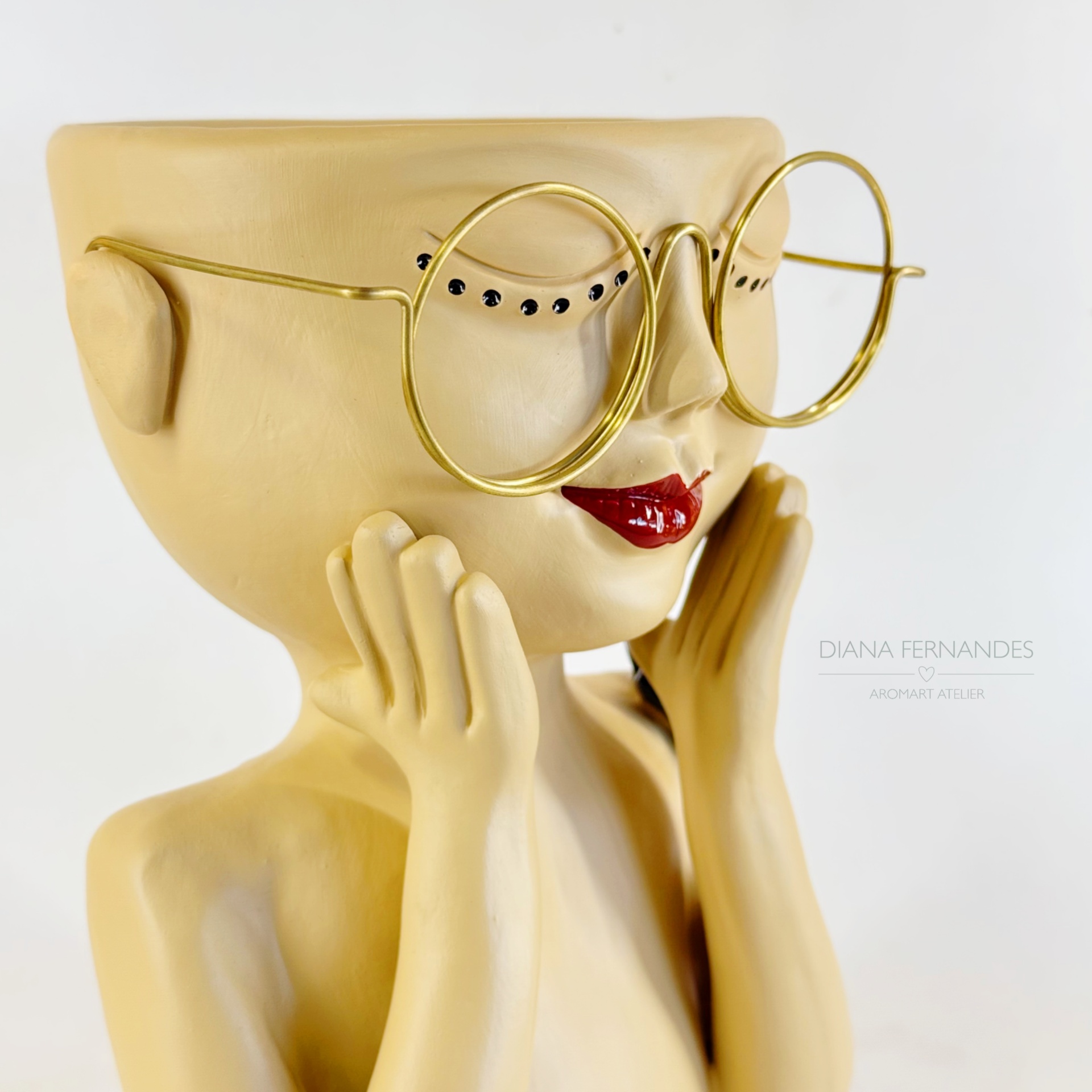 • Estatueta decorativa estilizada de figura humana com óculos dourados e lábios vermelhos