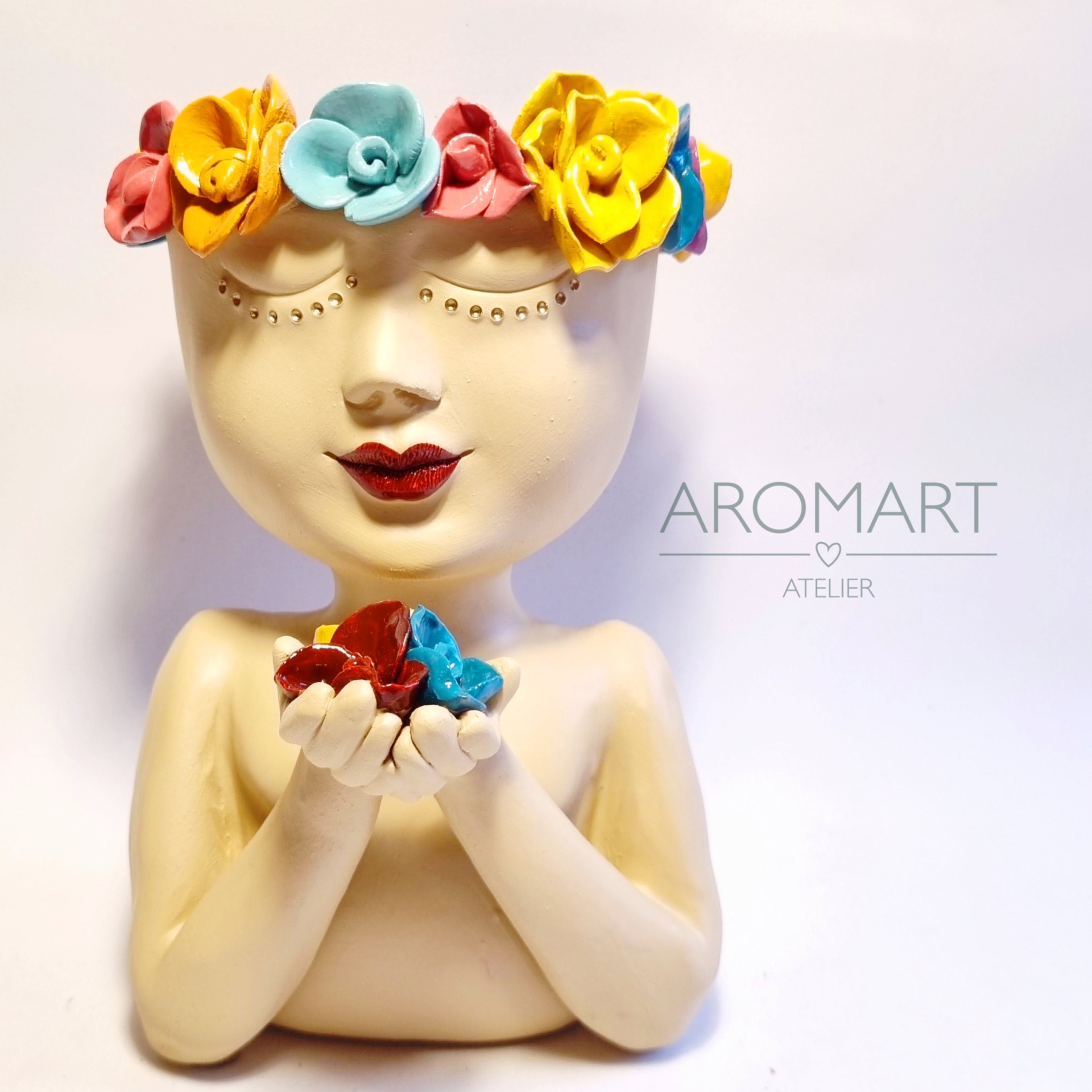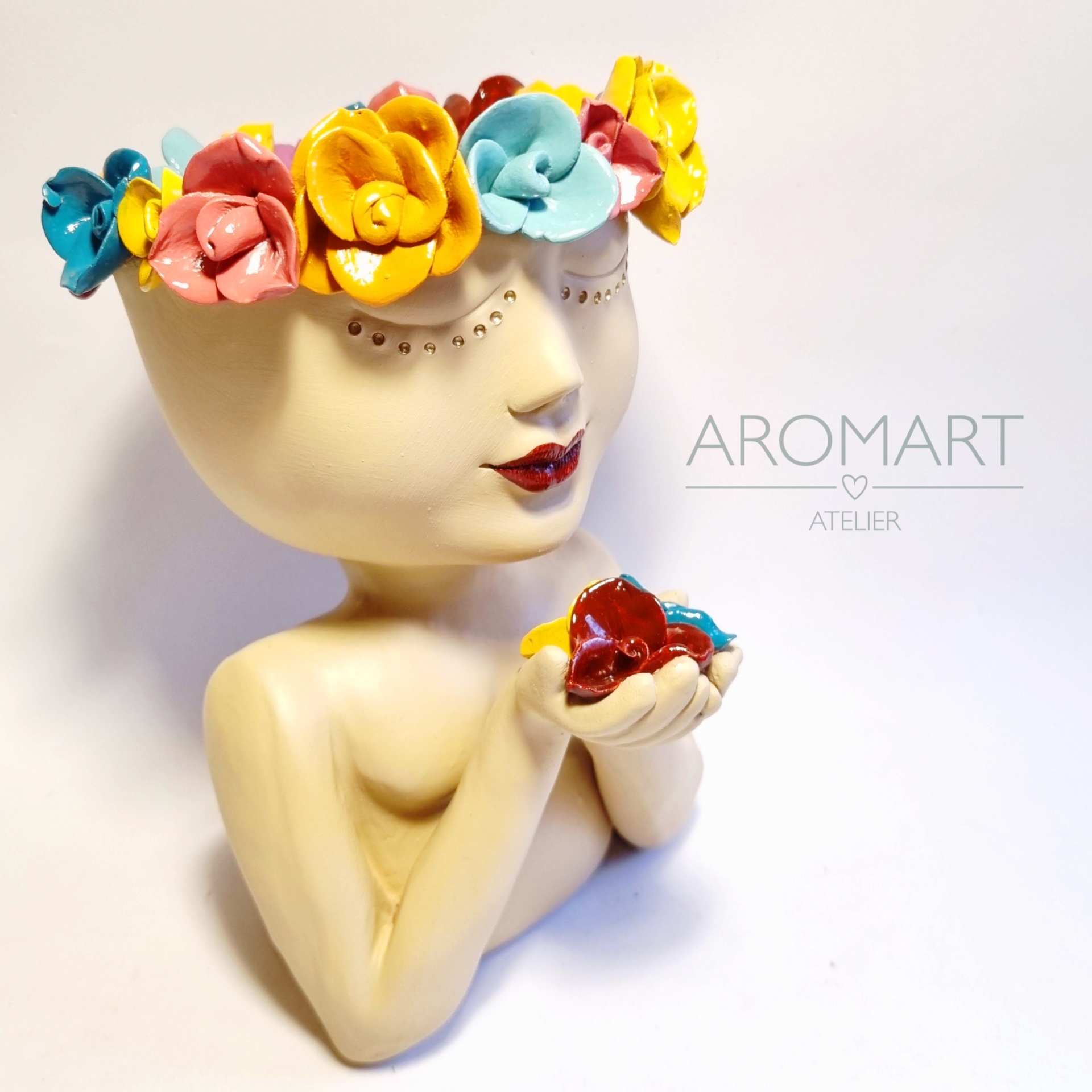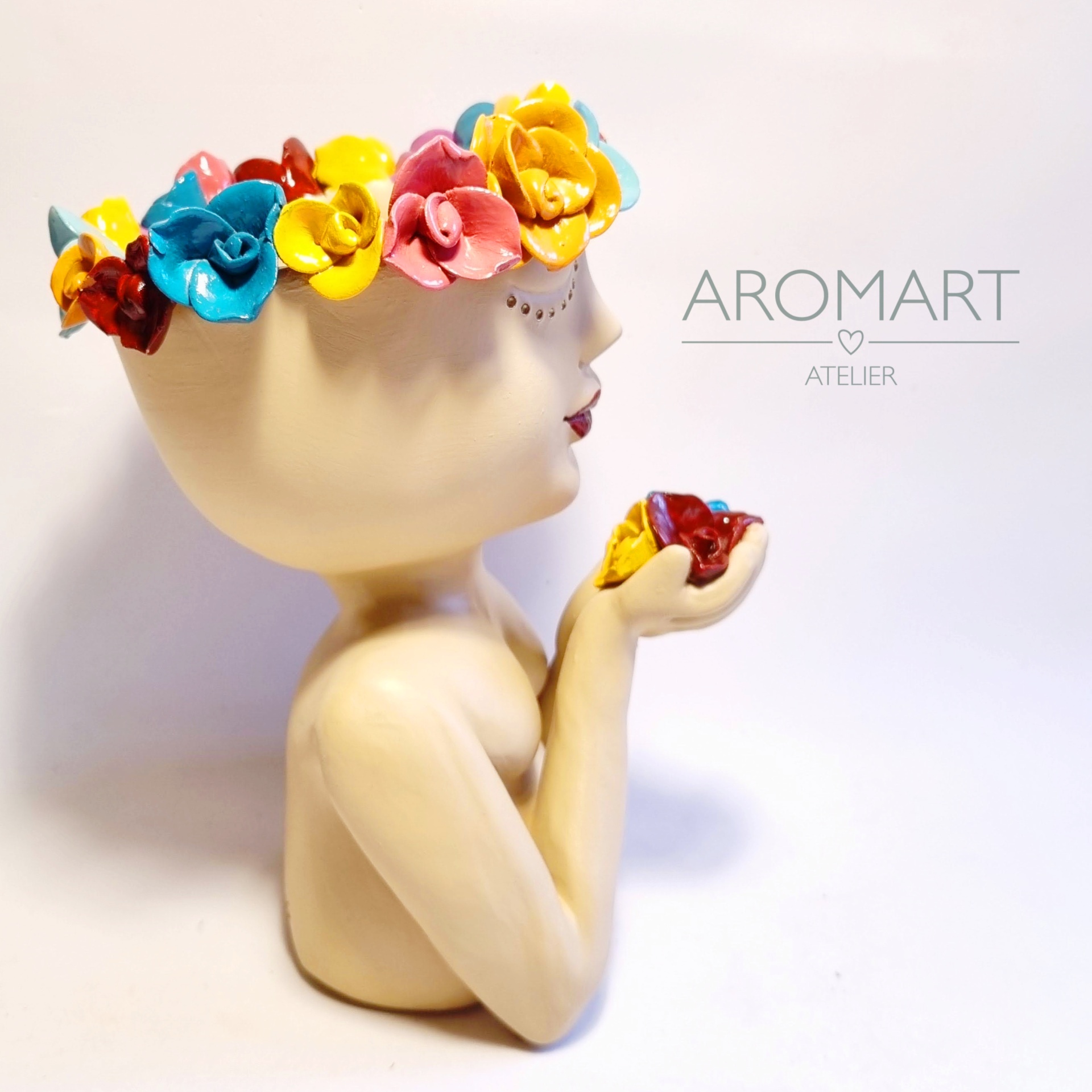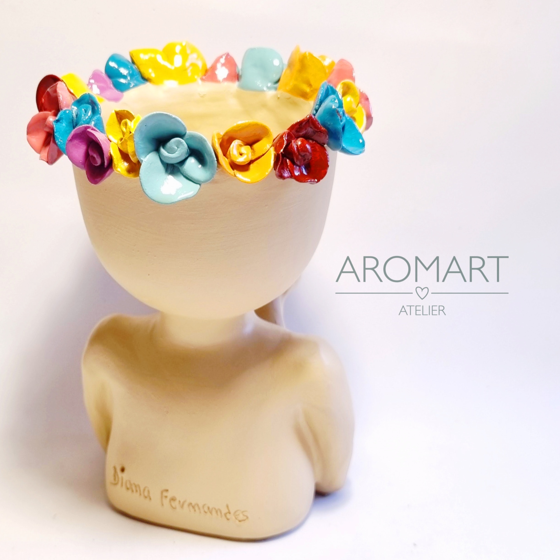 • Busto de cerâmica bege com flores coloridas na cabeça e texto 'AROMART ATELIER' ao lado