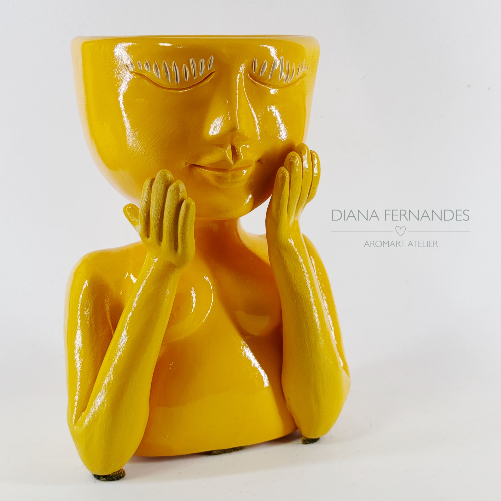 • Vaso decorativo amarelo em cerâmica formato rosto humano com mãos nas bochechas
