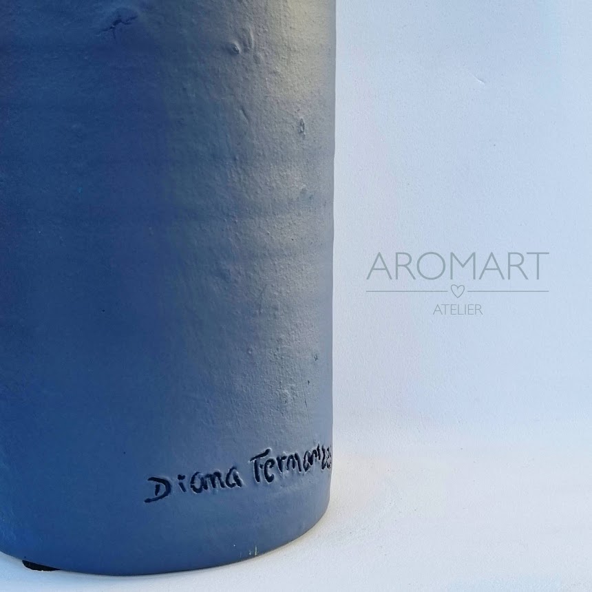• Vaso cilíndrico azul de cerâmica com assinatura e fundo branco com texto Aromart Atelier