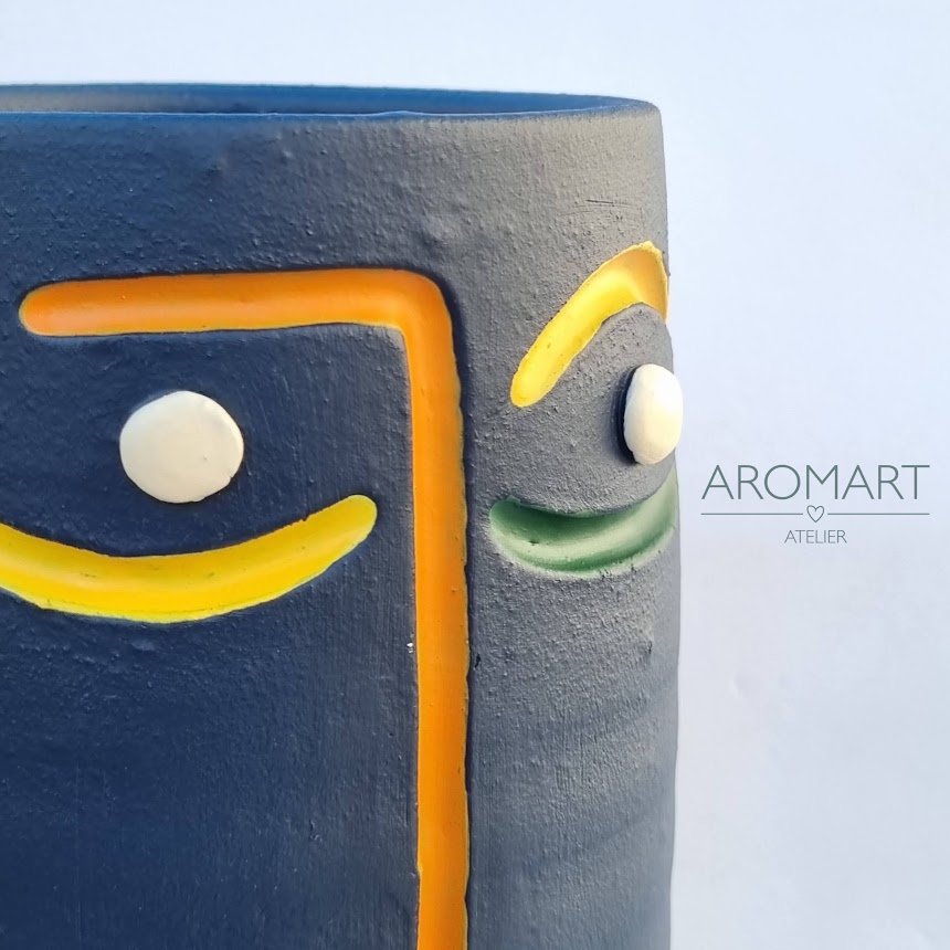 Vaso azul com rosto colorido e texto AROMART ATELIER