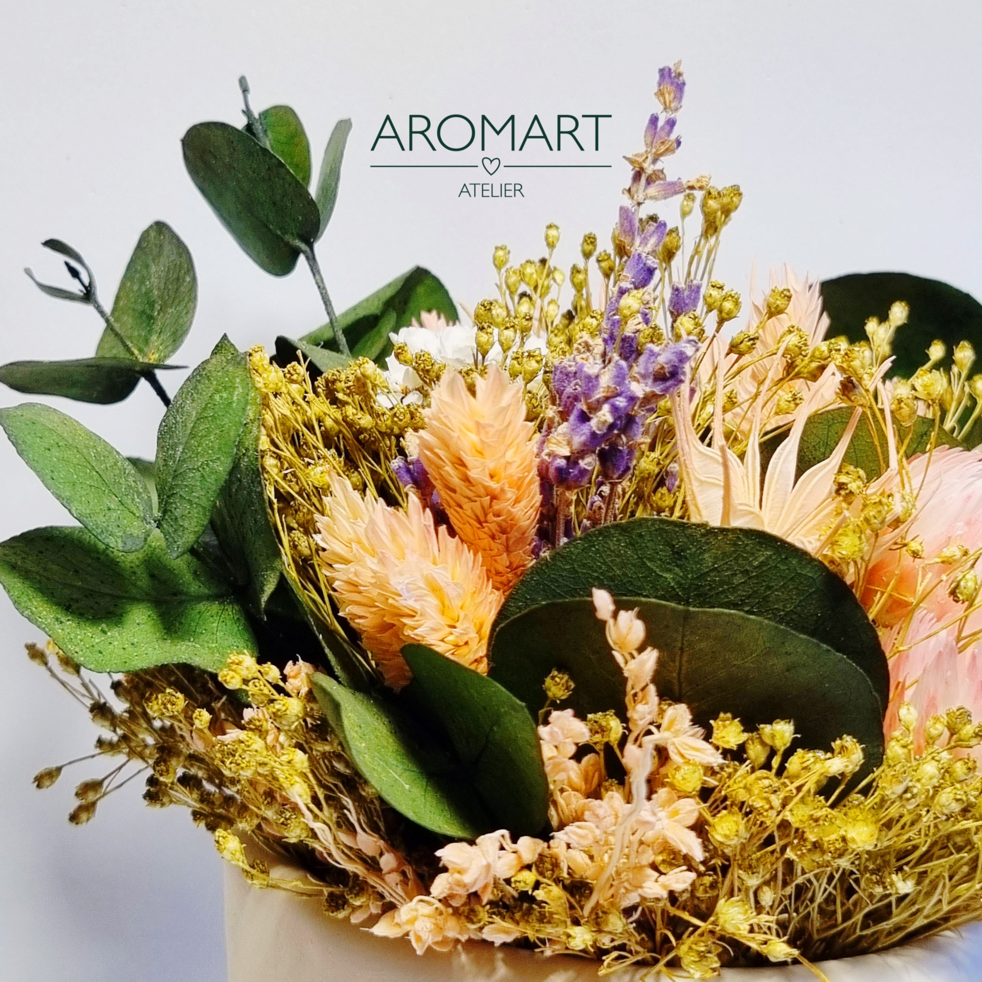 • Ramo de flores secas coloridas com folhas verdes e logotipo AROMART ATELIER