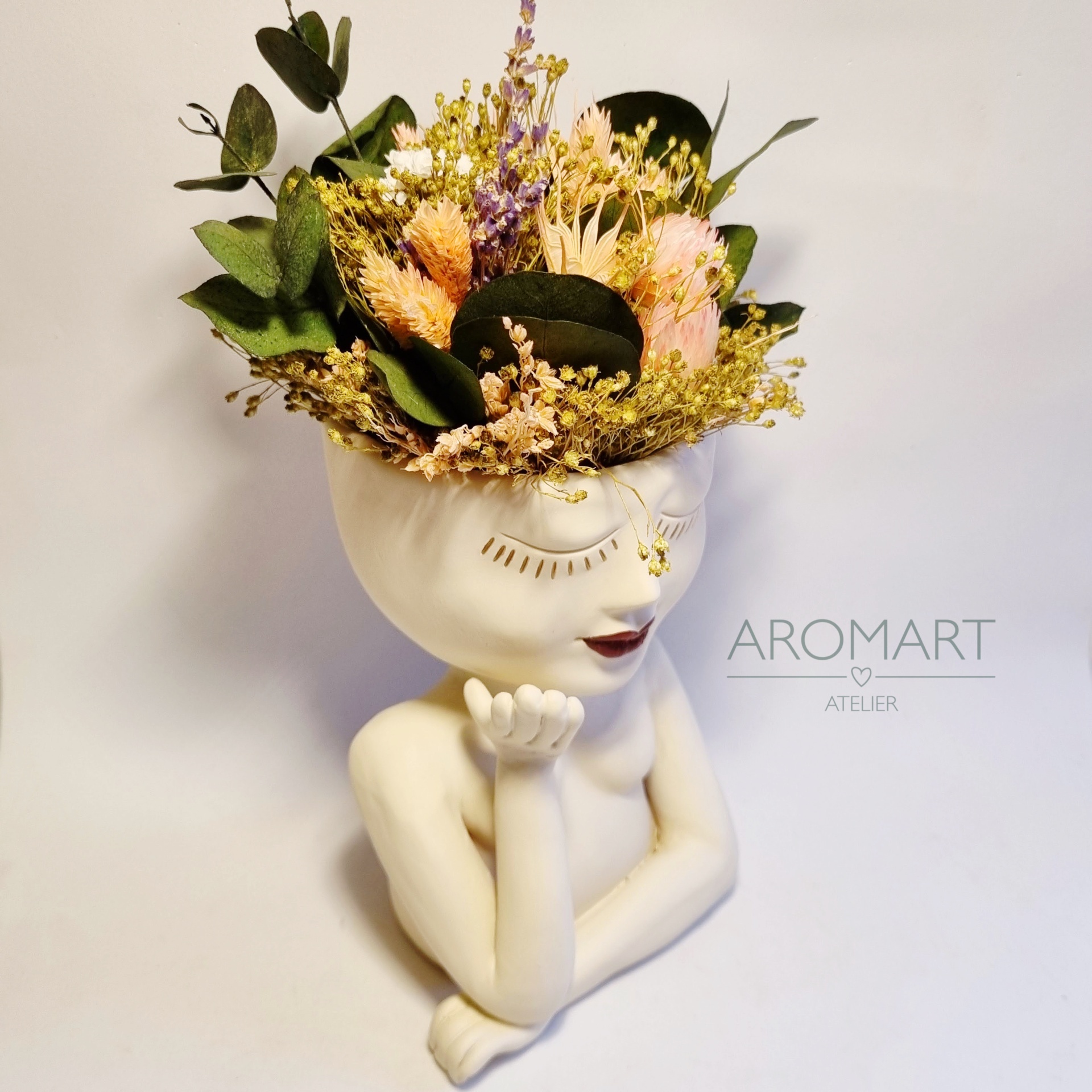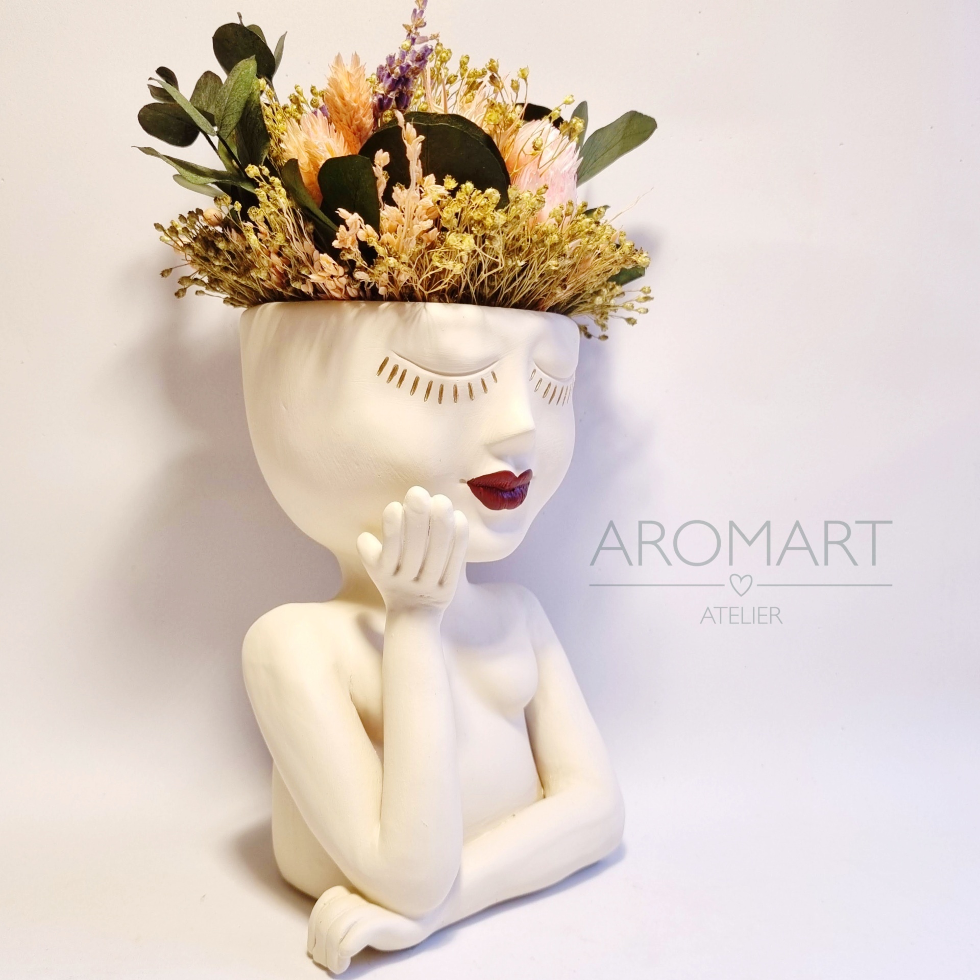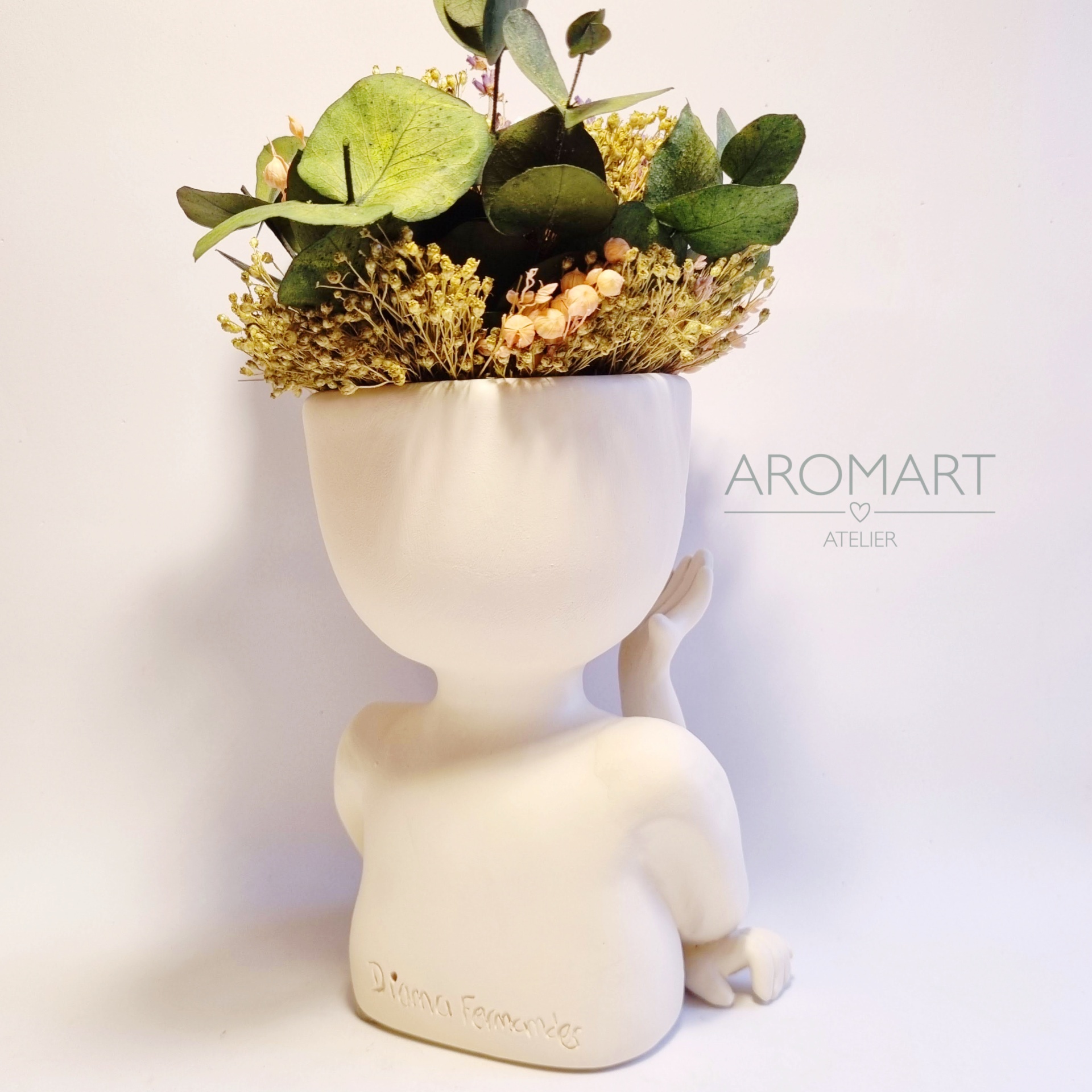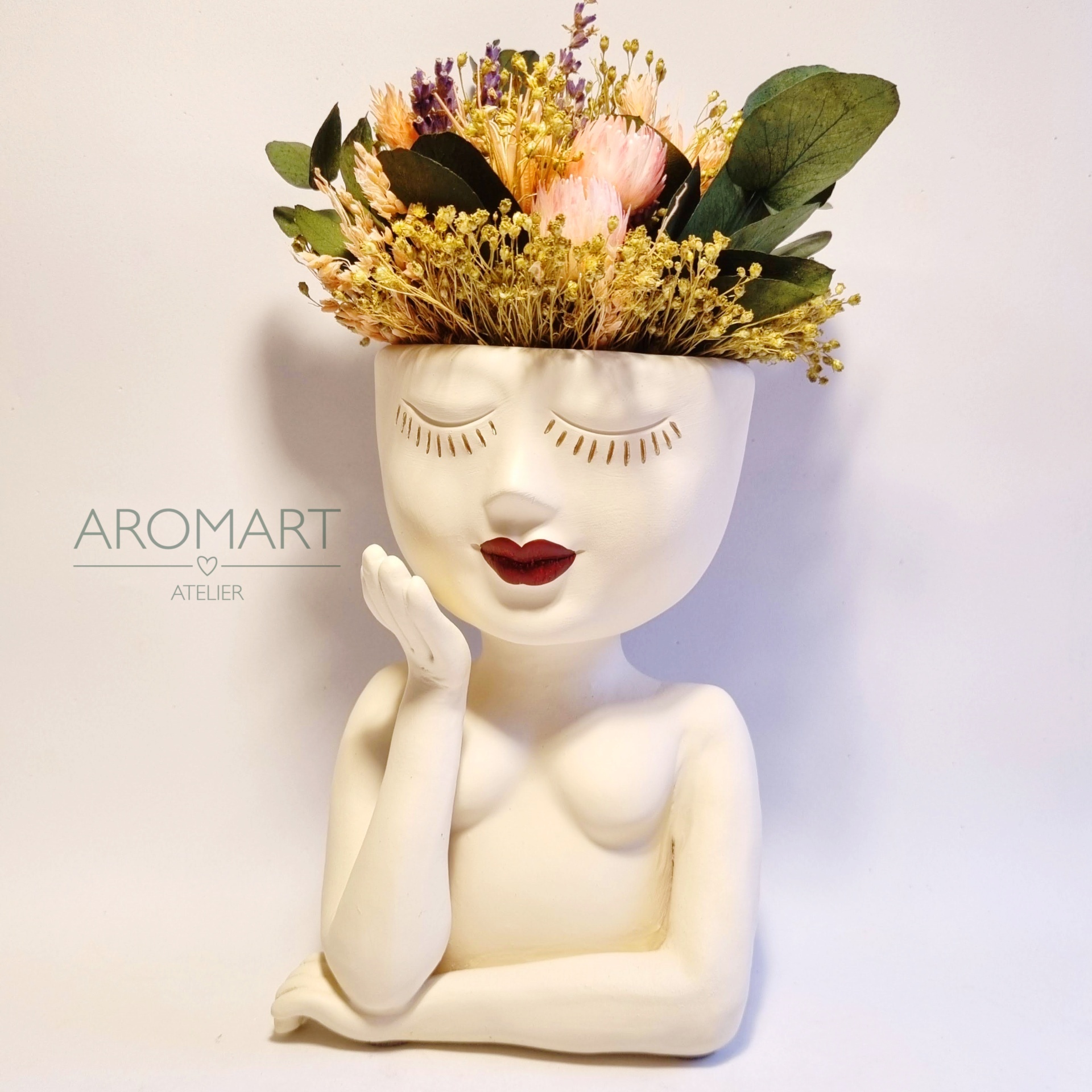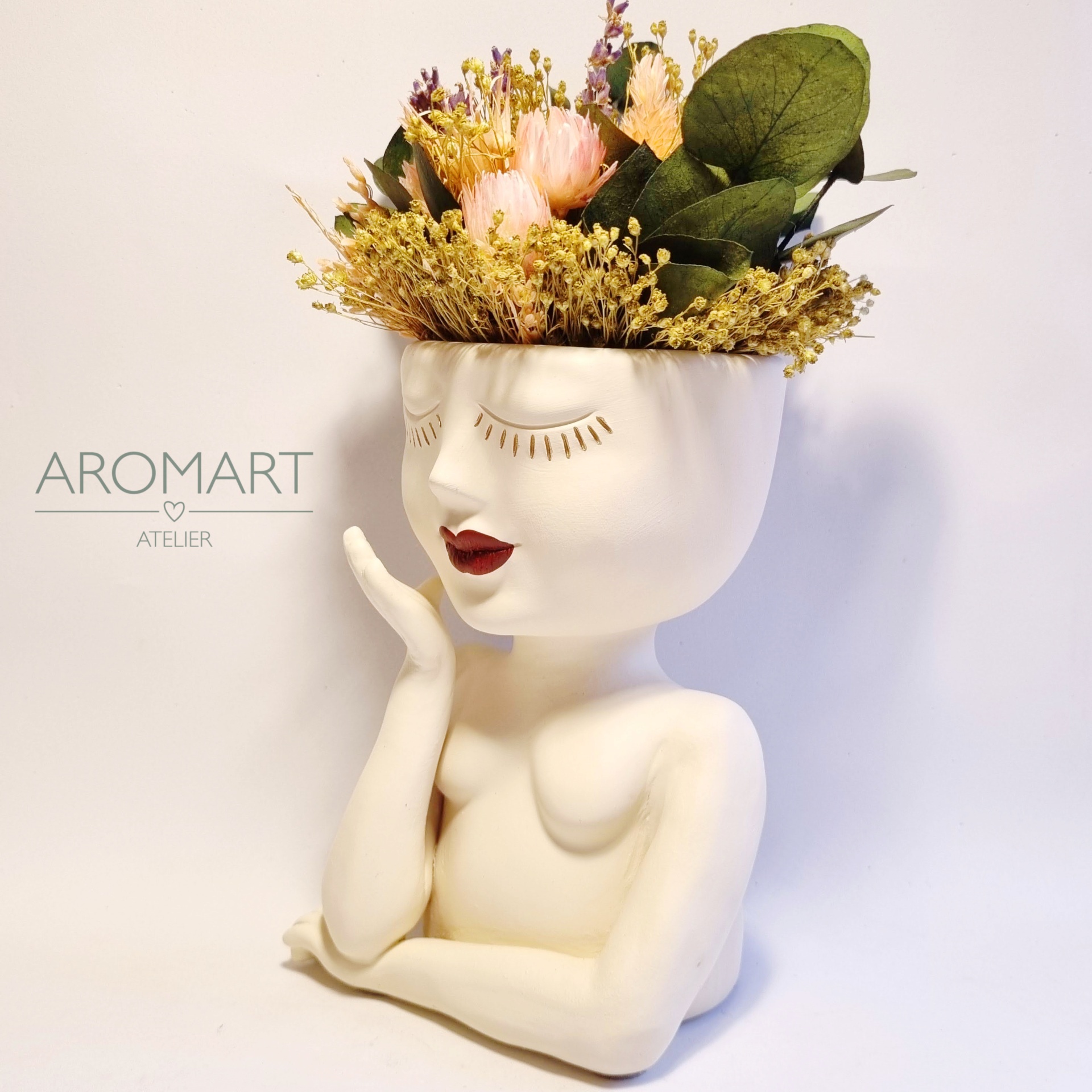 • Vaso de cerâmica formato rosto feminino com flores secas e texto AROMART ATELIER