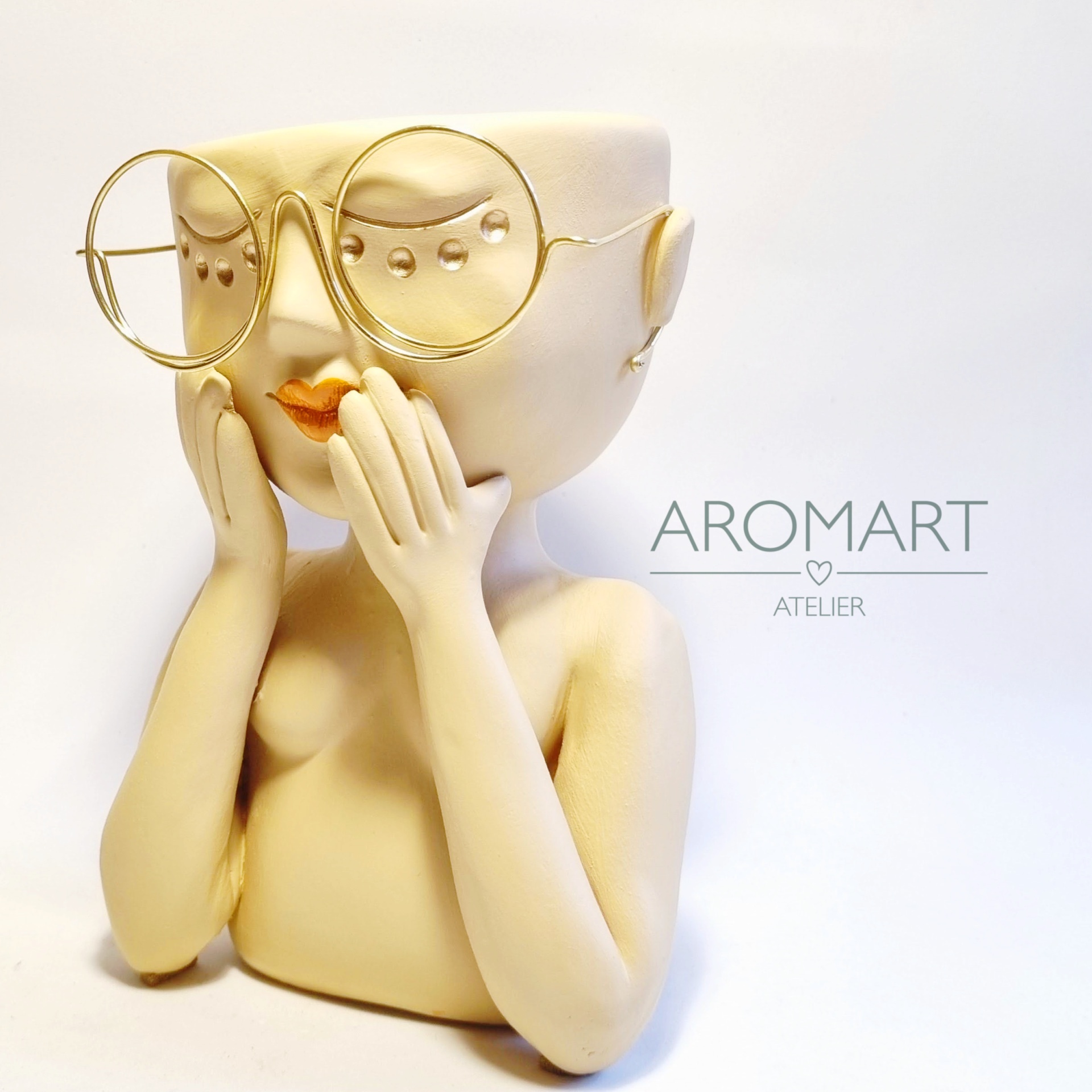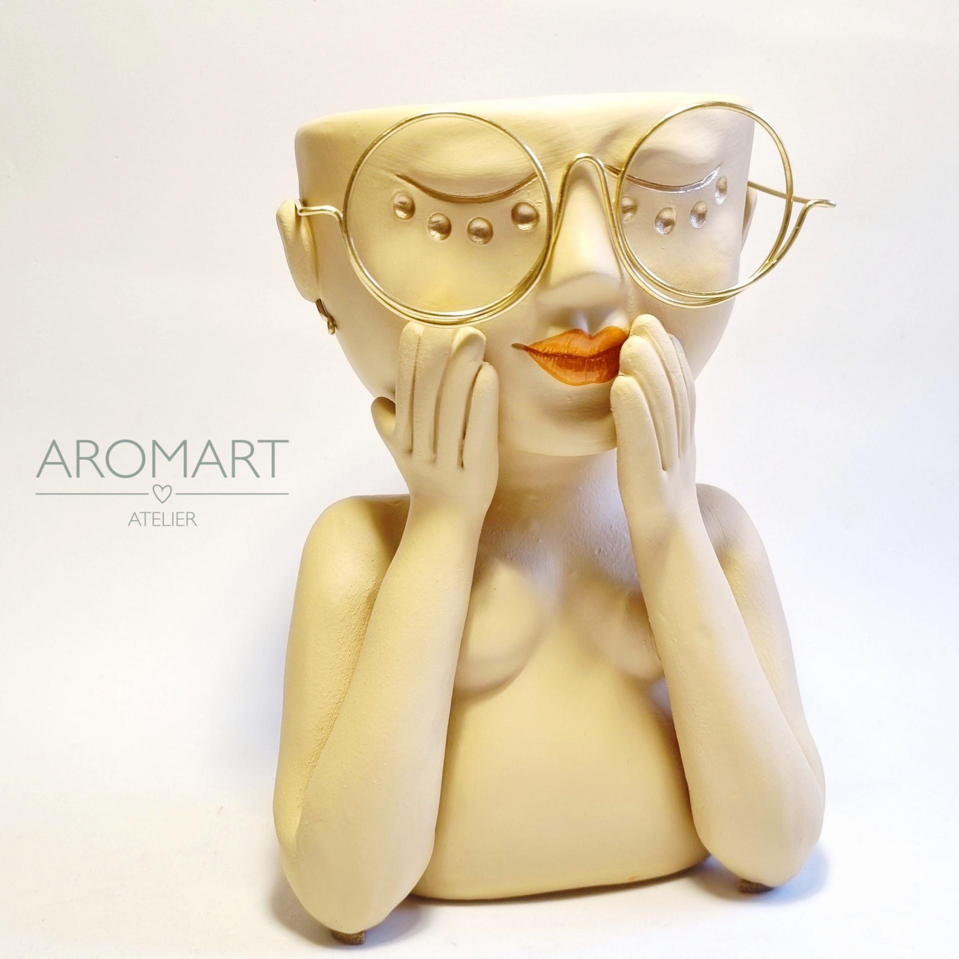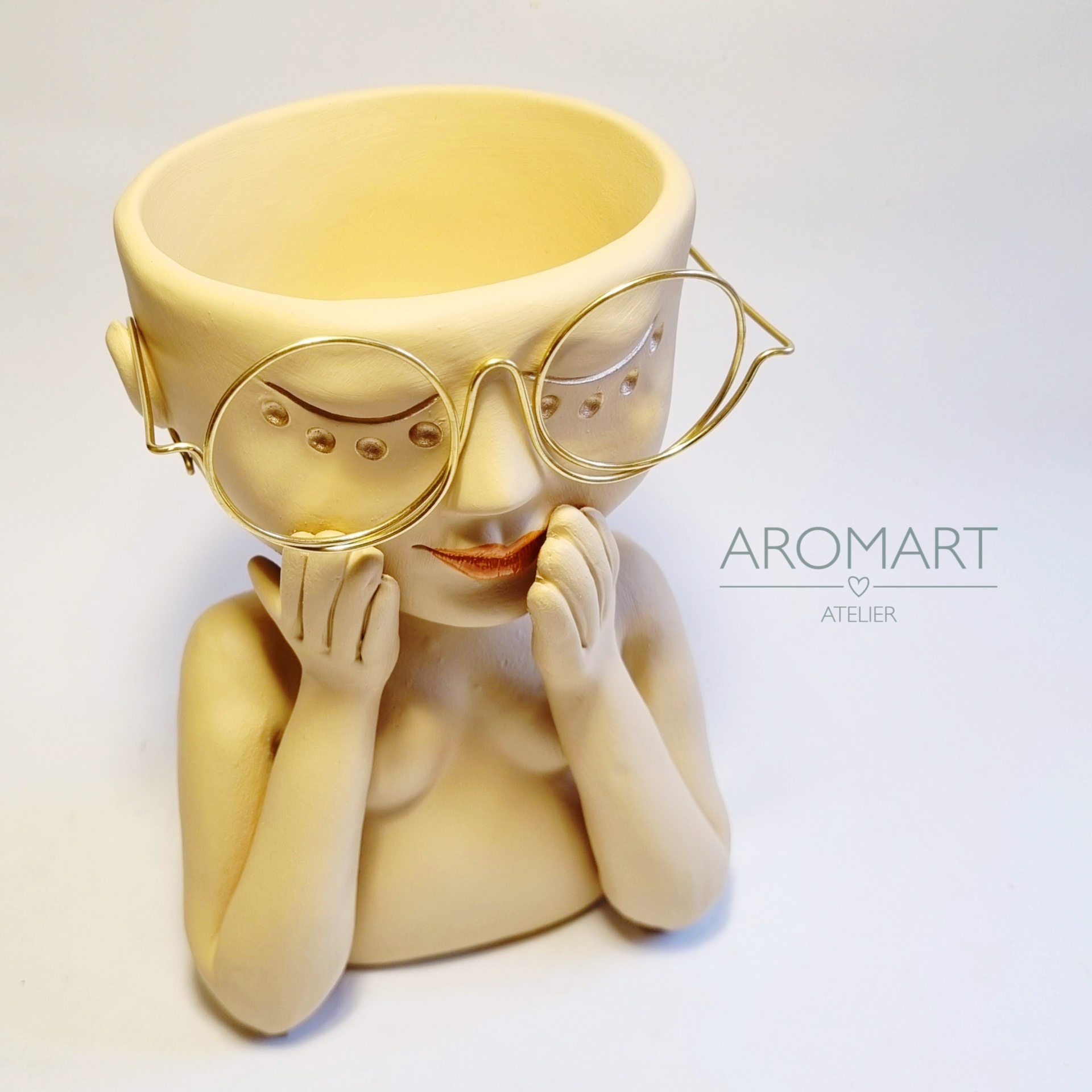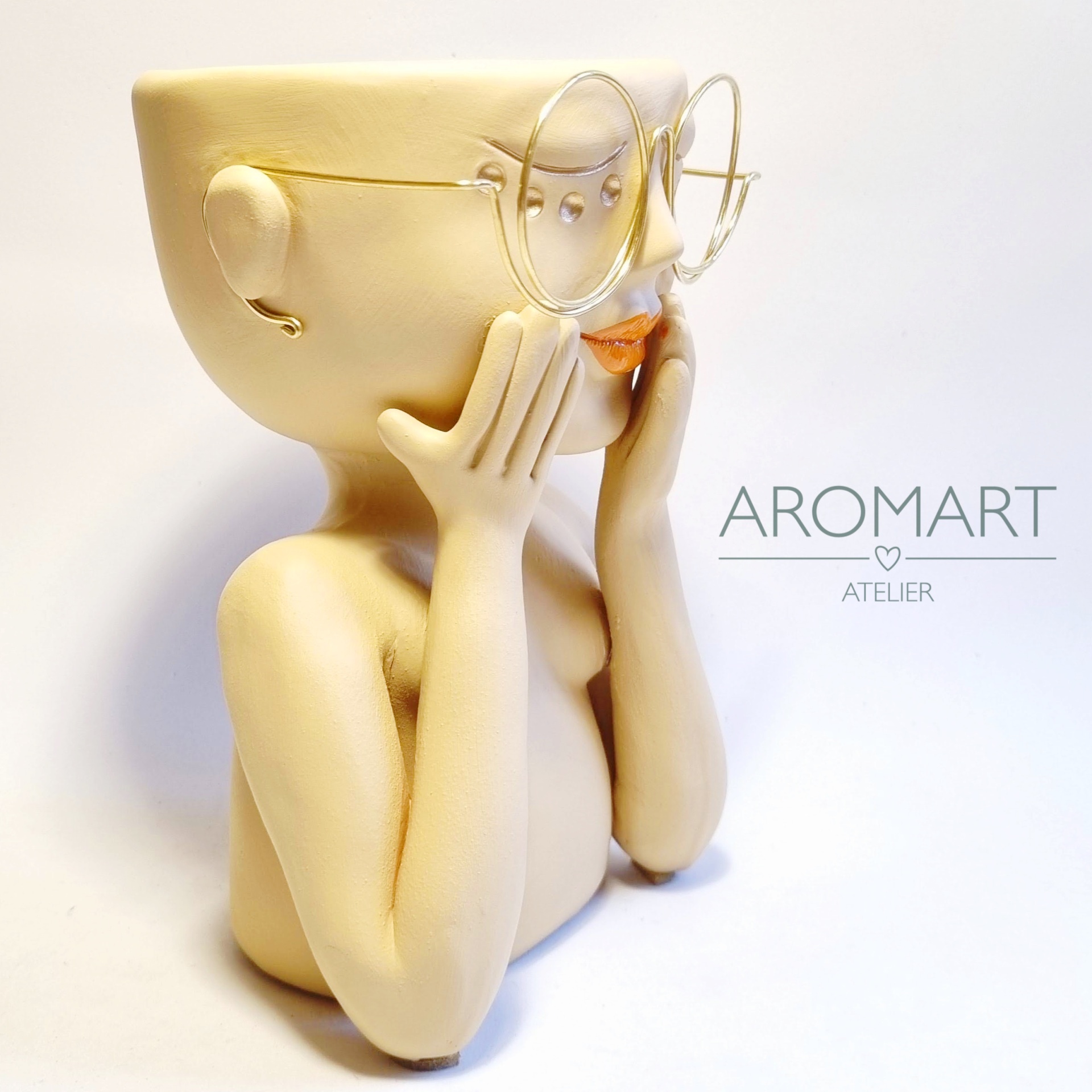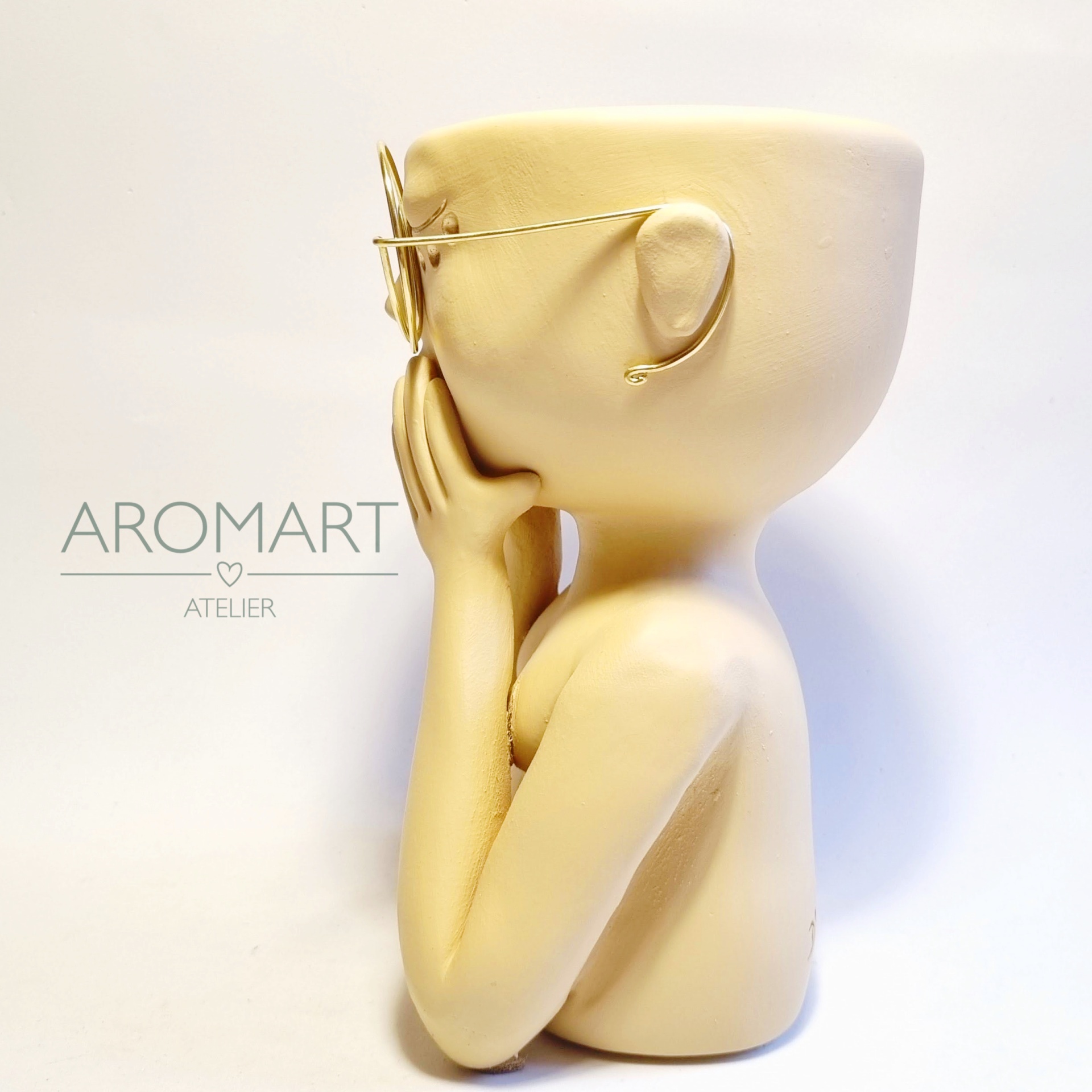 • Vaso decorativo amarelo com formato de figura humana usando óculos e mãos na face, fundo branco com texto AROMART ATELIER