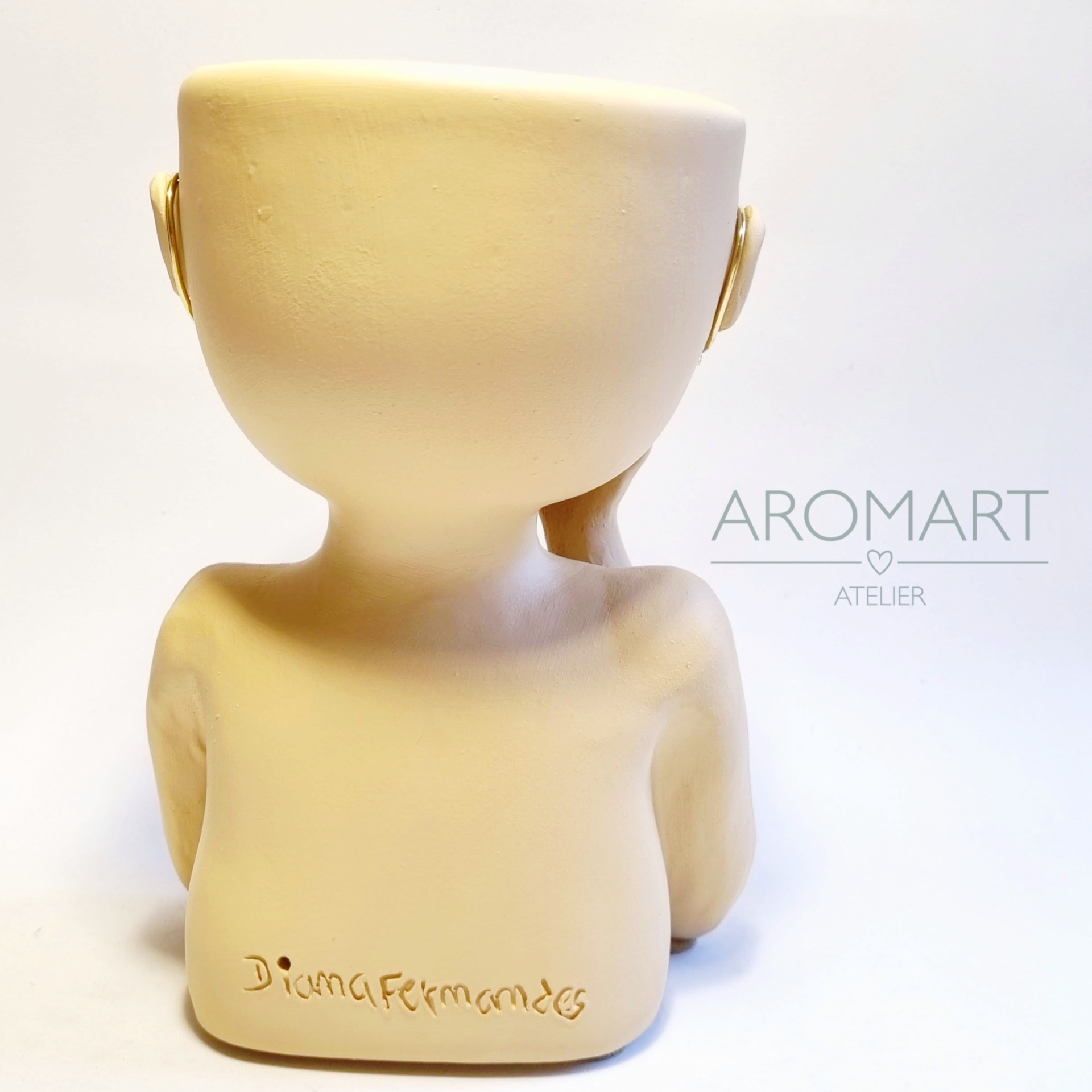 • Vaso decorativo creme em forma de figura humana estilizada visto de costas com assinatura e logotipo