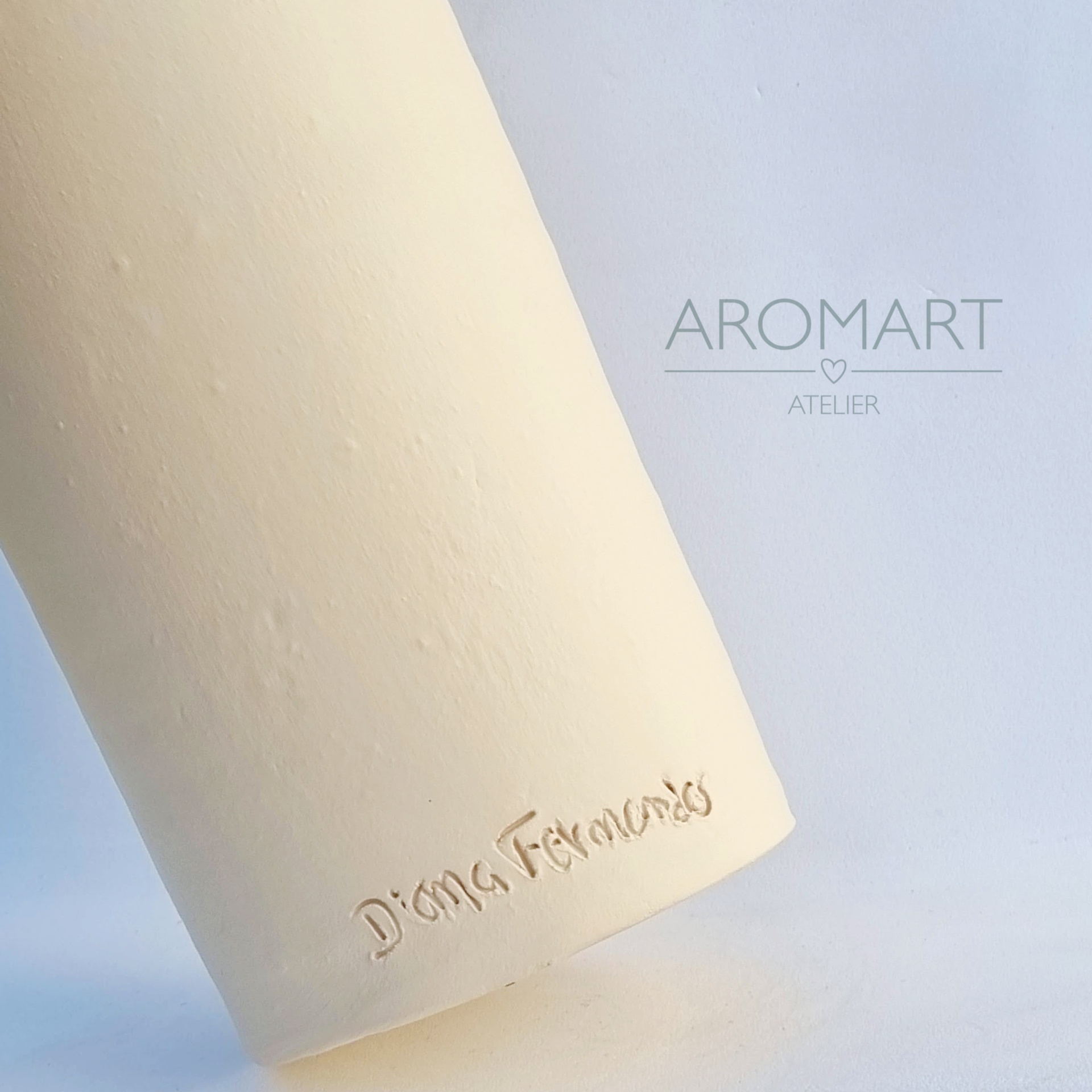 • Vaso cilíndrico de cerâmica bege com gravação e texto 'AROMART ATELIER' no fundo