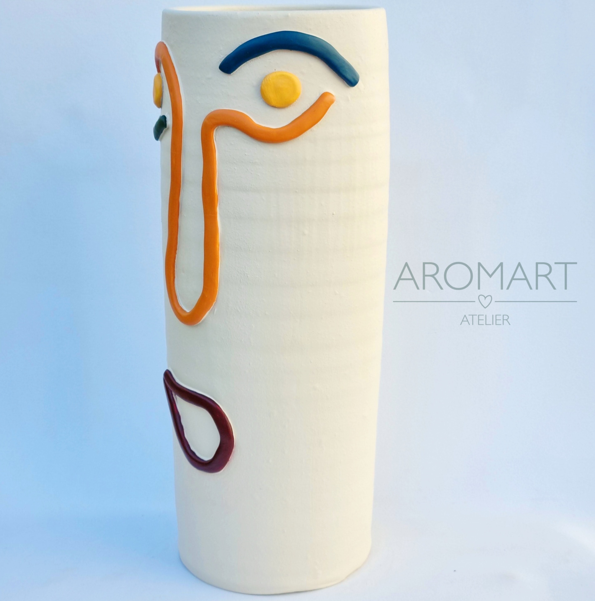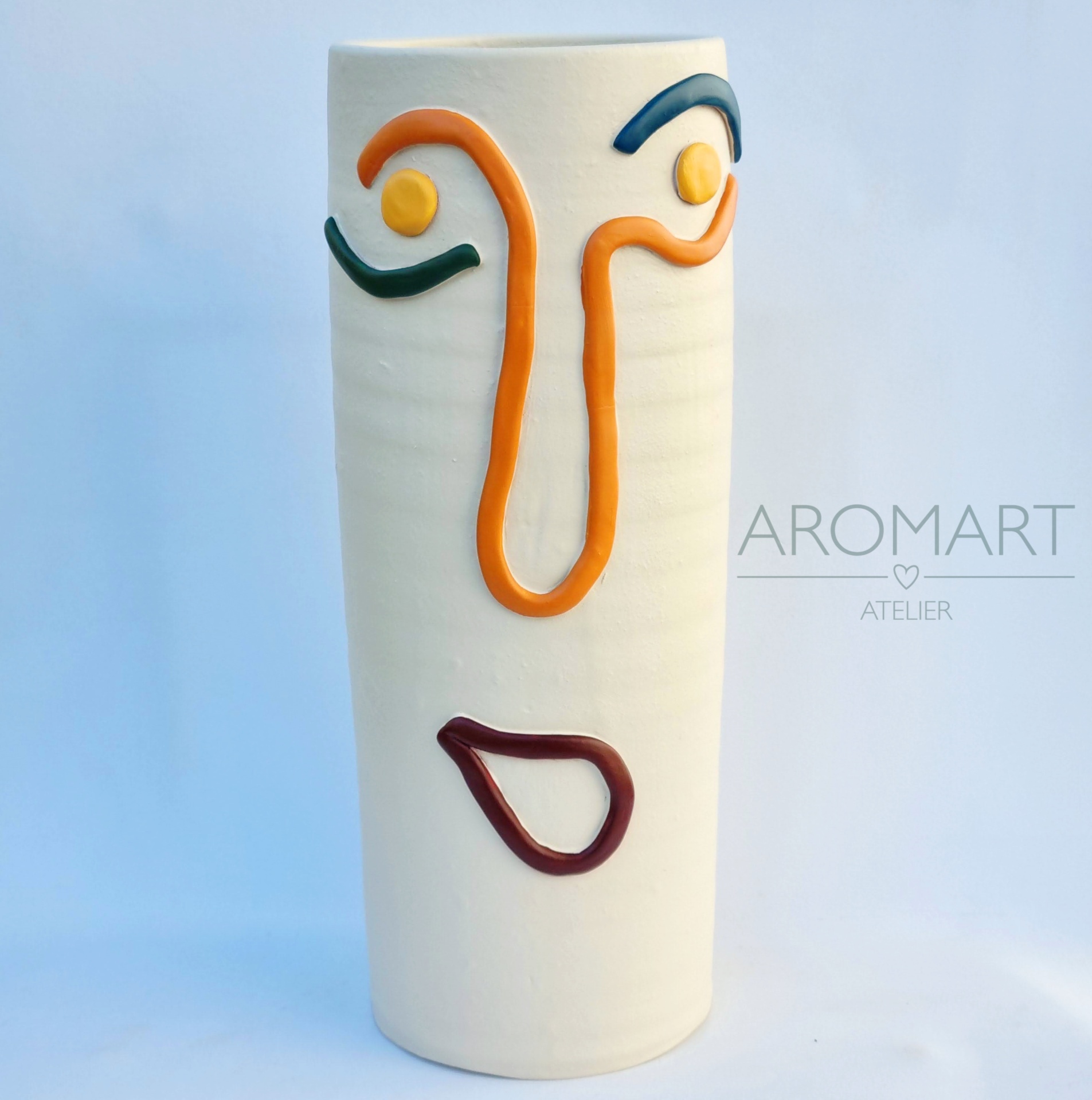 Vaso cerâmico alto com rosto minimalista colorido e assinatura AROMART ATELIER