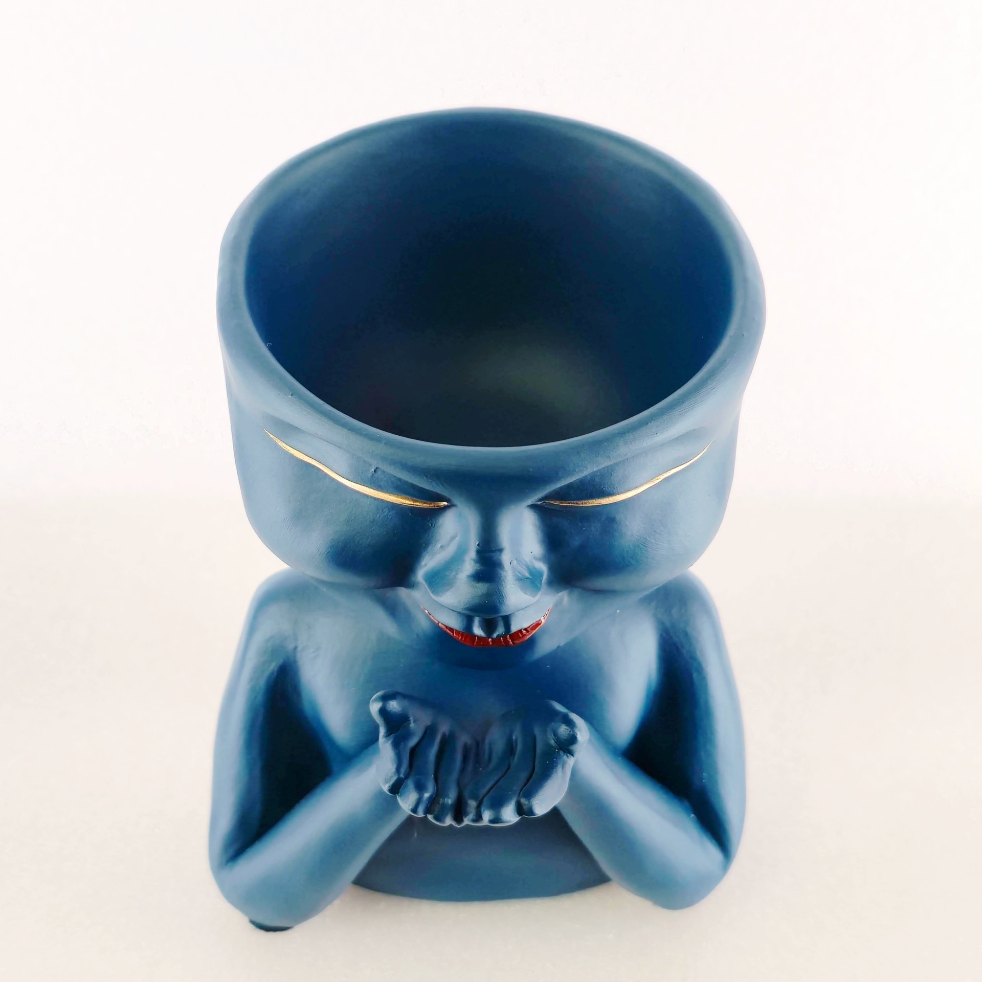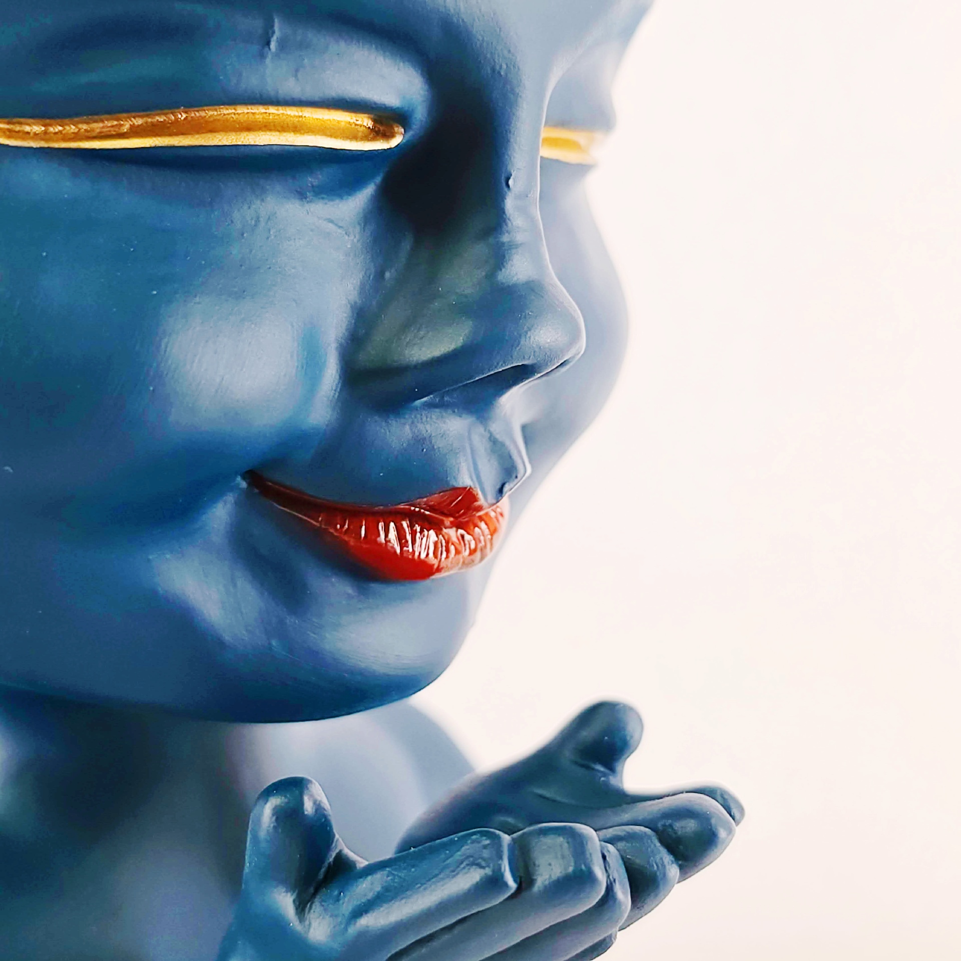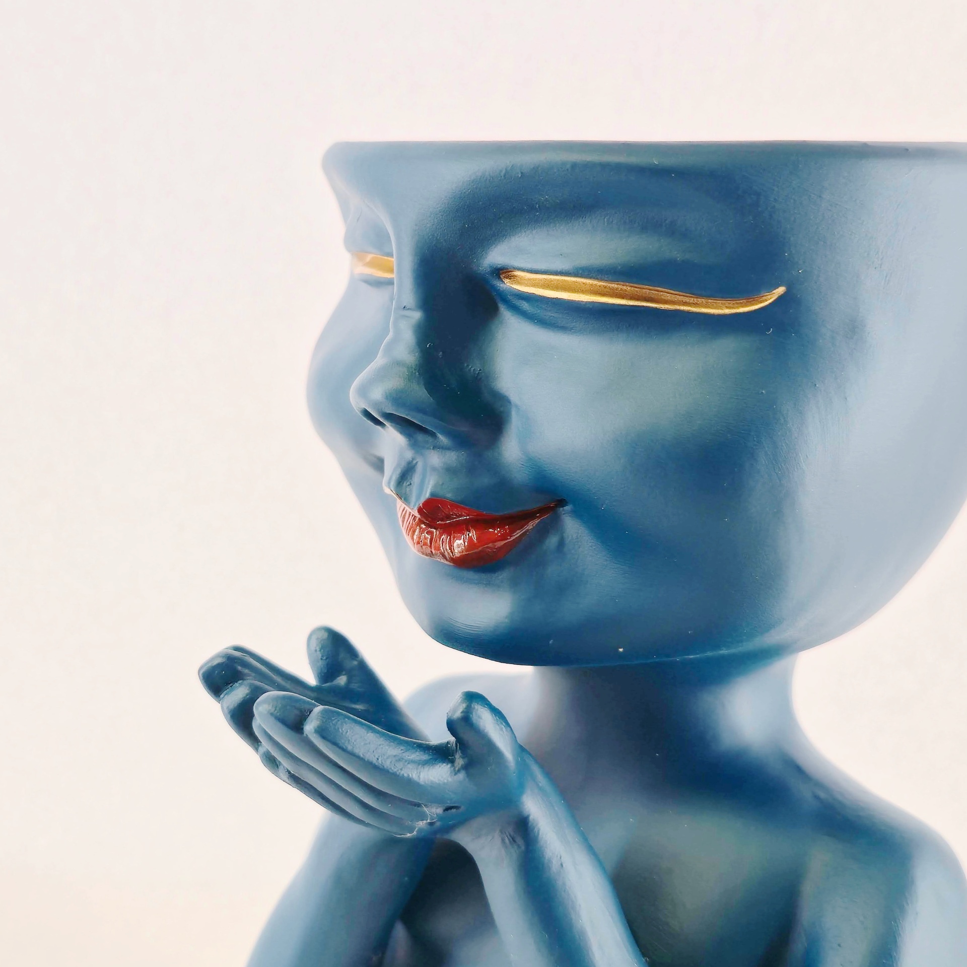 Uma peça que transmite calma e ternura à primeira vista. Com um rosto sereno, olhos dourados fechados e um sorriso delicado, esta jarra inspira tranquilidade e doçura em qualquer espaço.