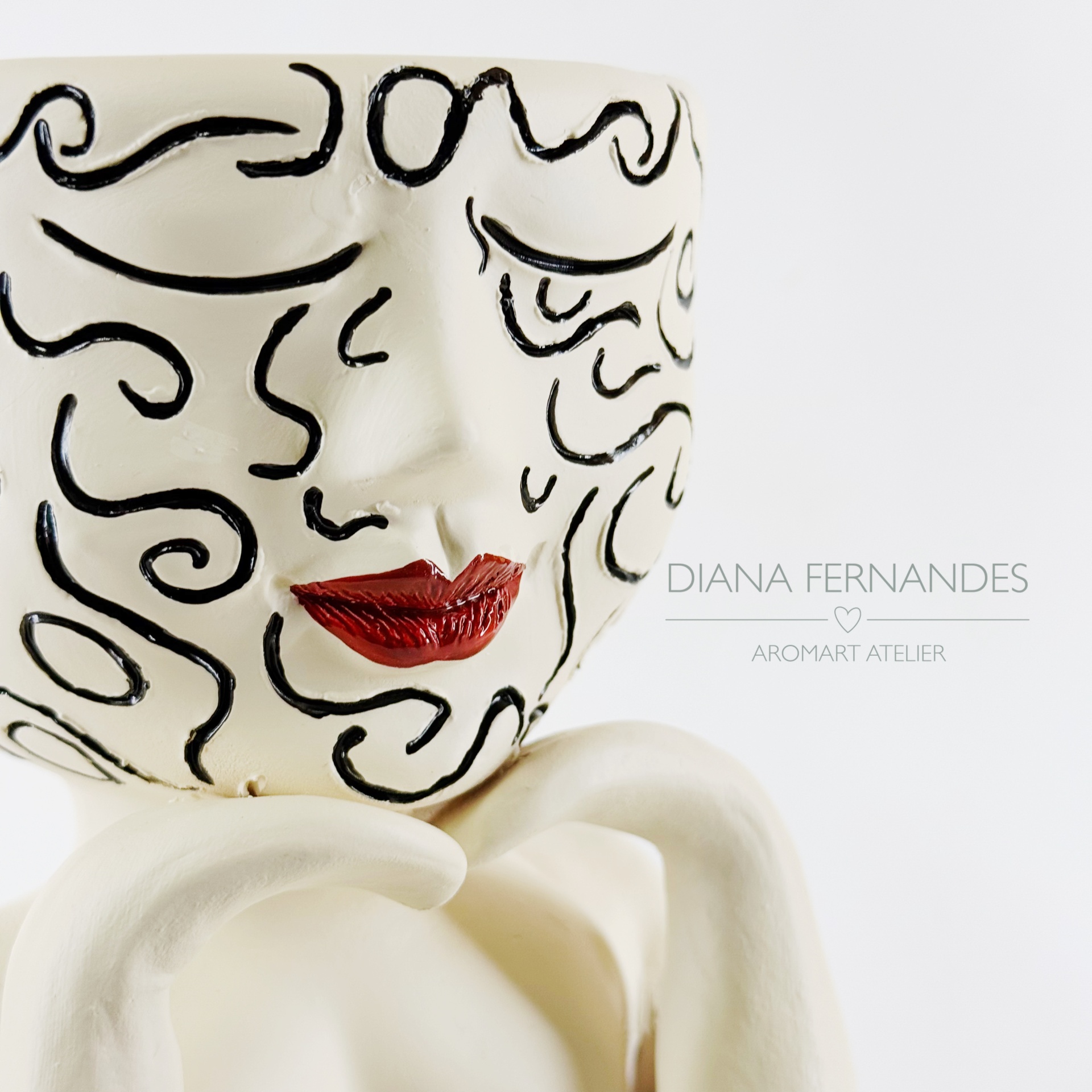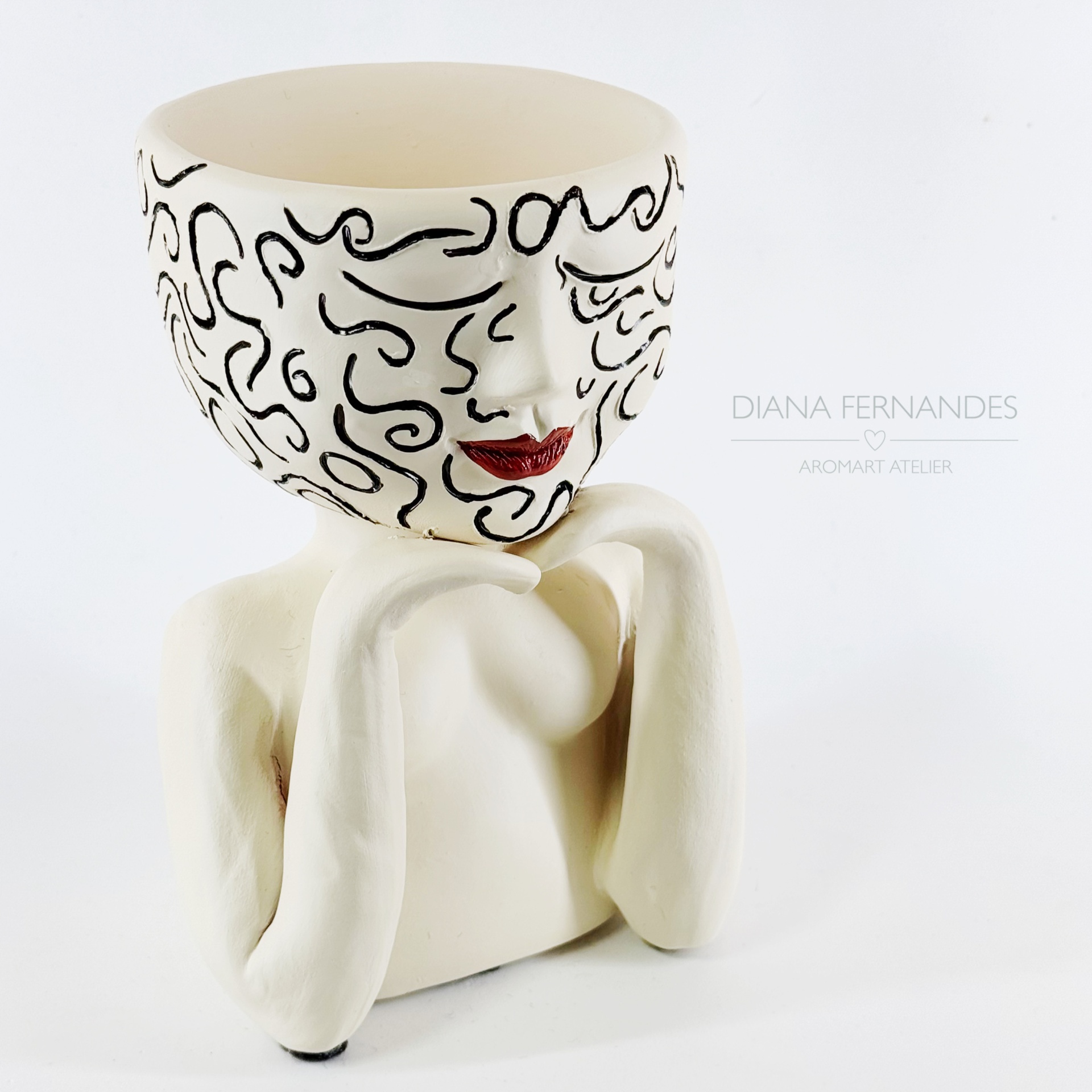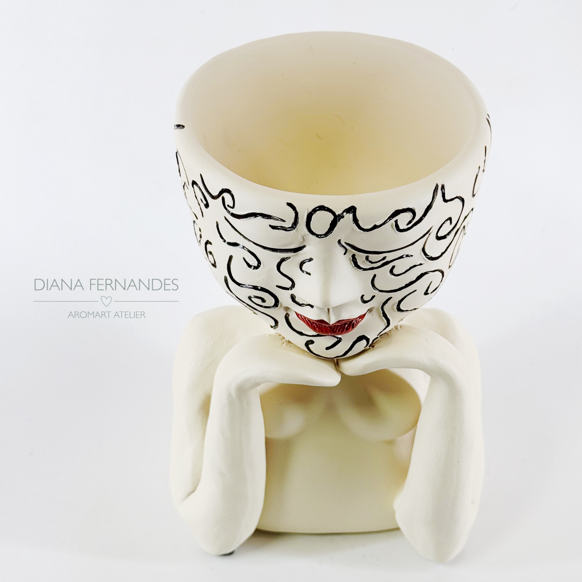 • Vaso decorativo em cerâmica branca com rosto feminino estilizado e cabelo pintado a preto