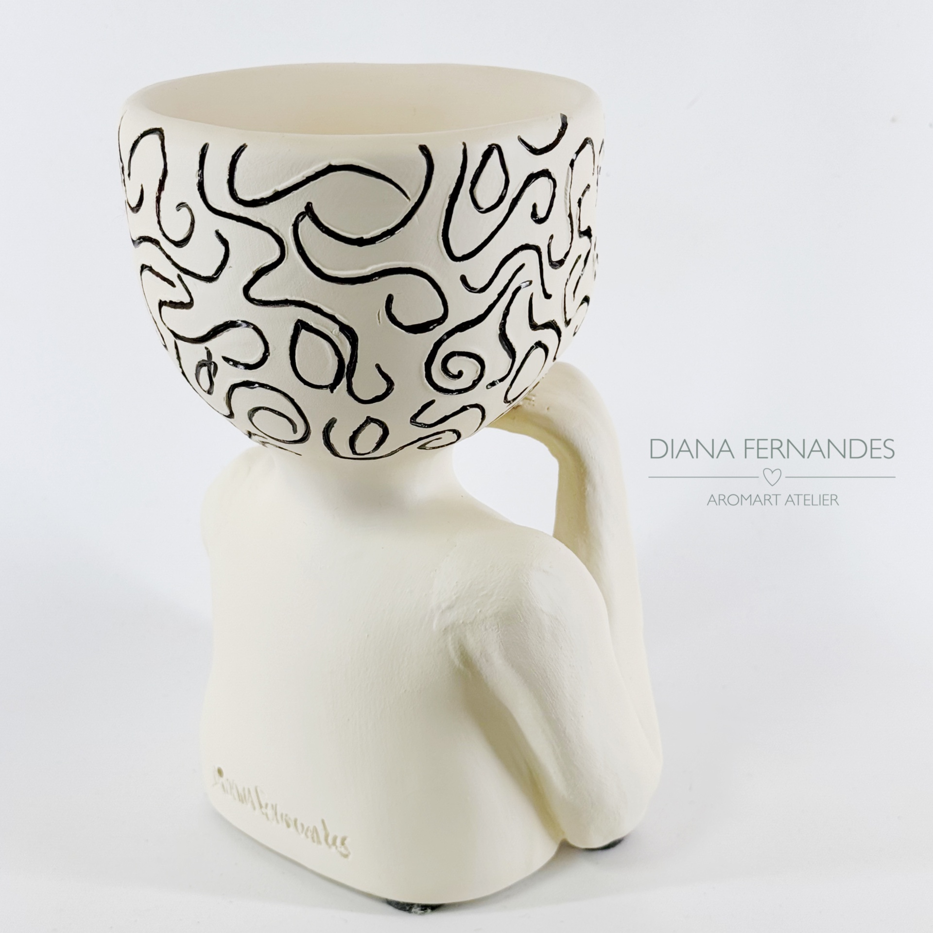 • Vaso cerâmico creme com padrão abstrato preto, forma de cabeça humana com mão apoiando o rosto