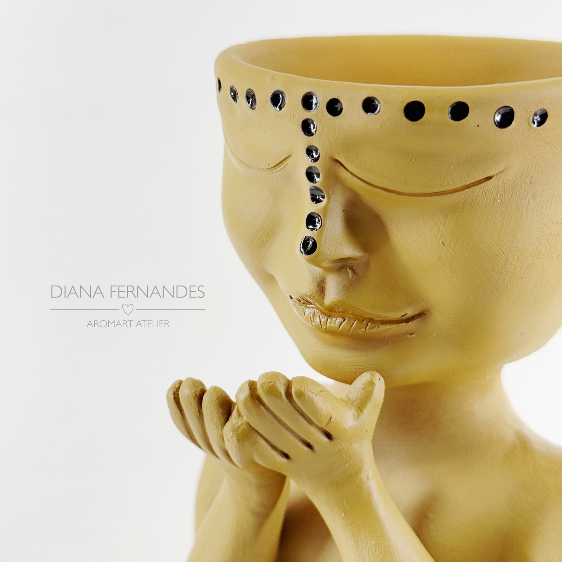 • Vaso decorativo amarelo com formato de rosto e mãos, pintas pretas na testa e sobrancelhas