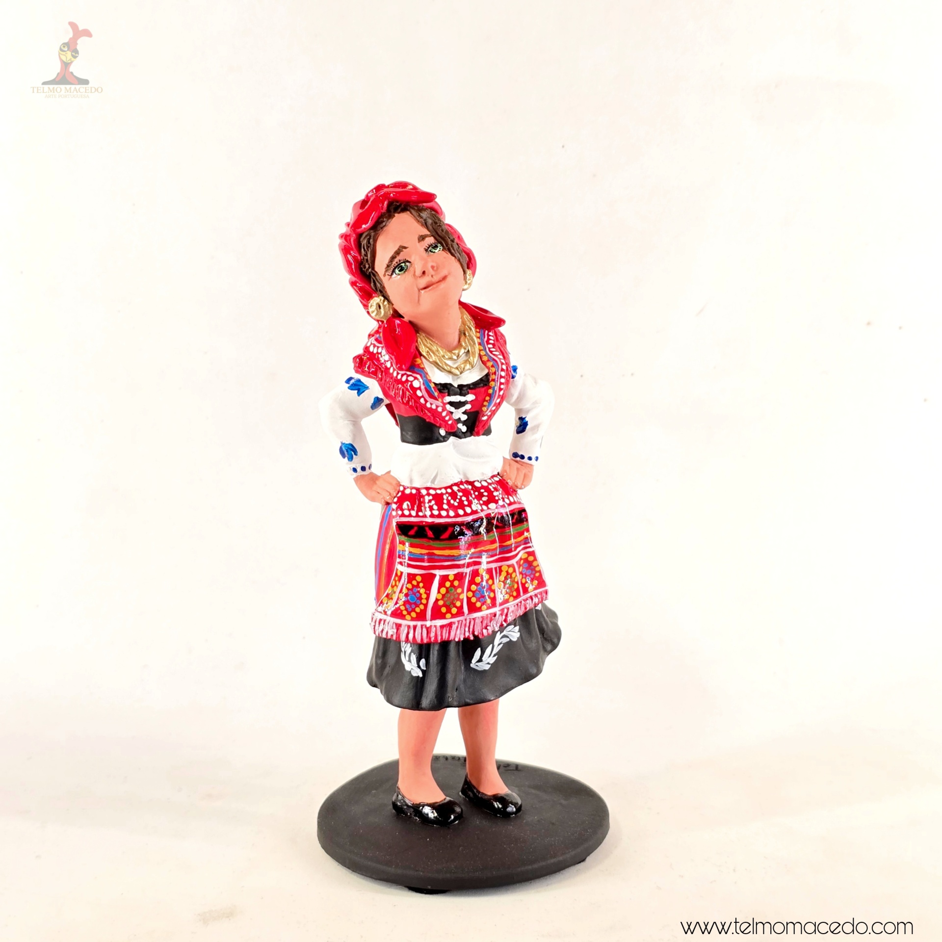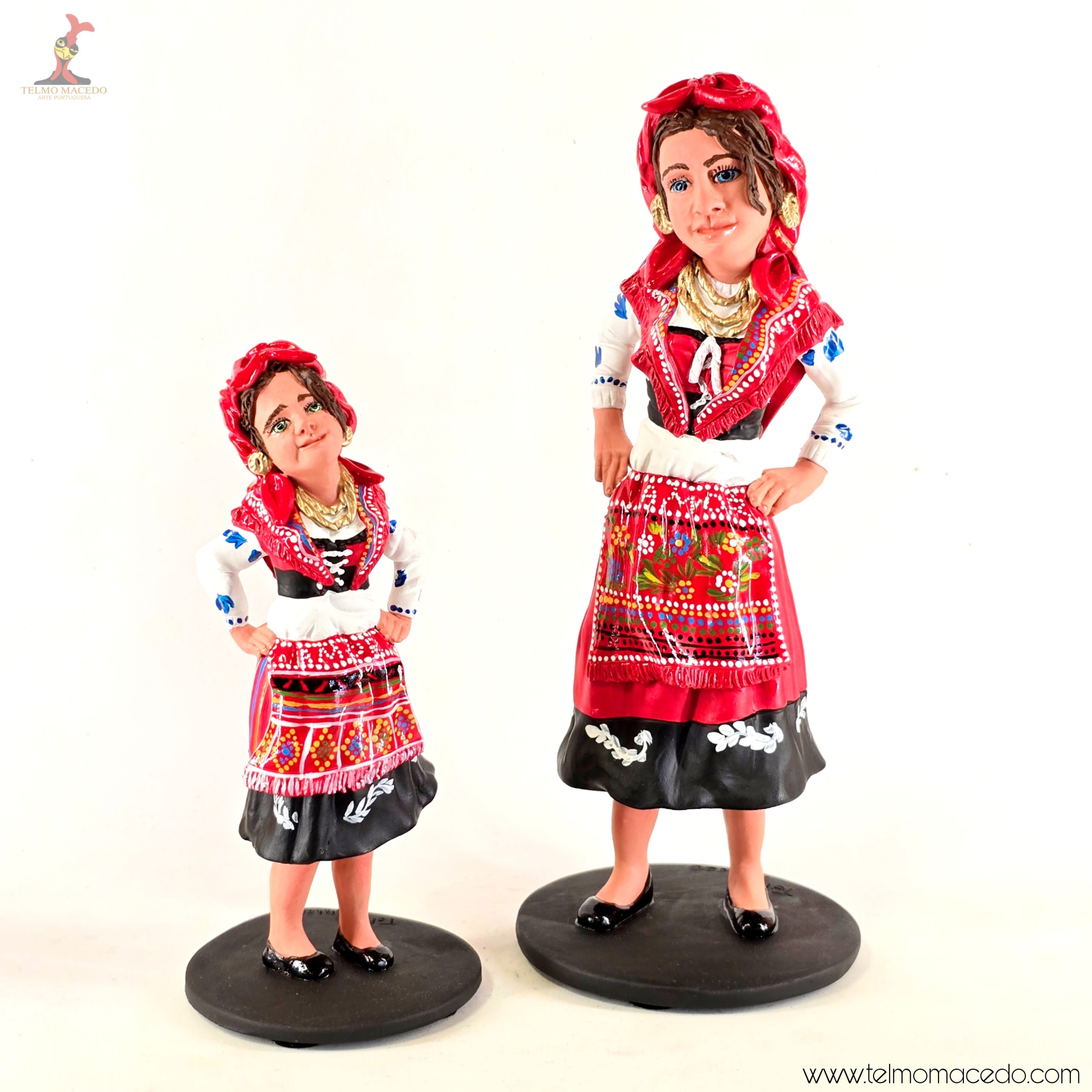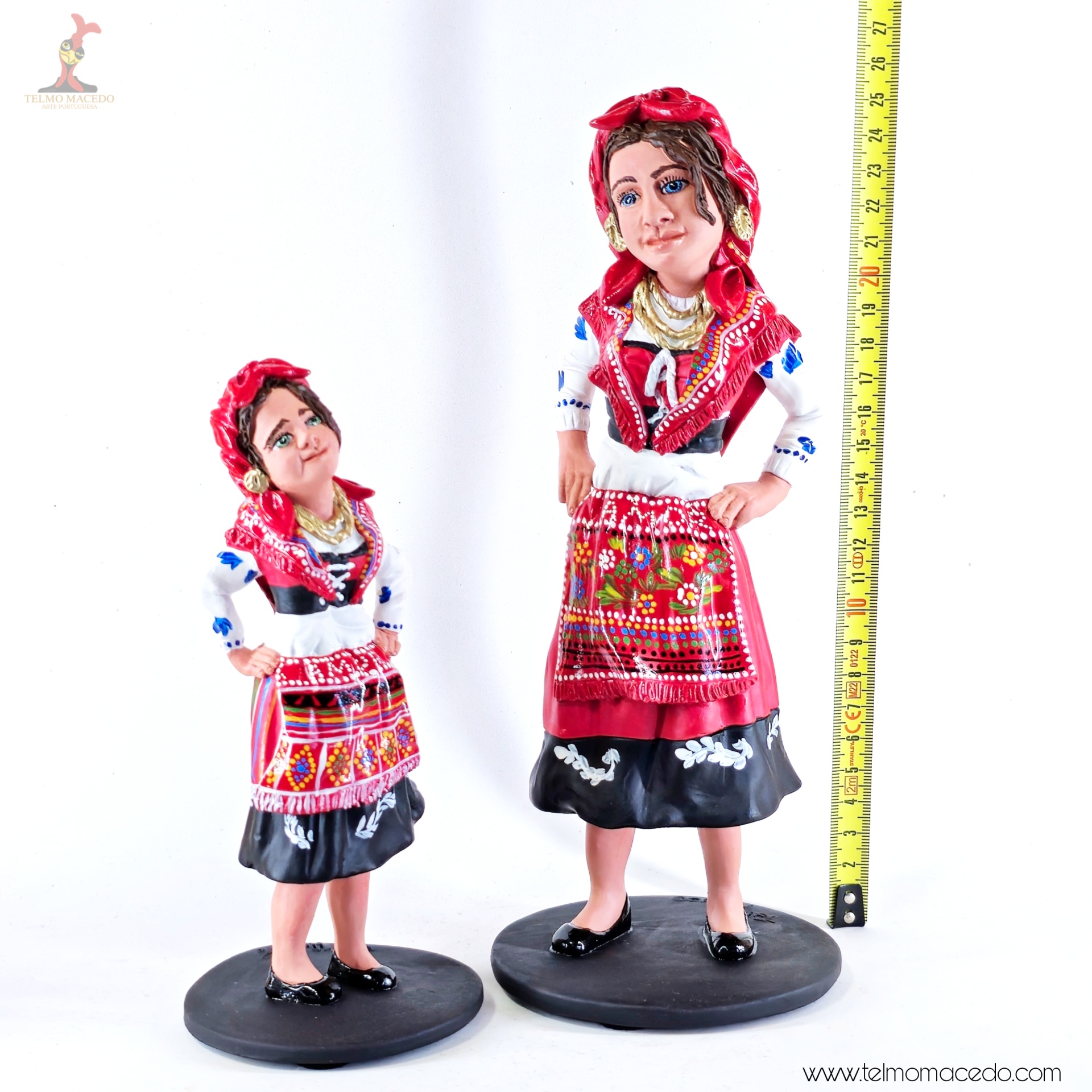 A força e o orgulho da tradição portuguesa, moldados com alma. Estas figuras representam a mulher minhota, vestida com o traje típico, cheia de cor, expressão e identidade. Cada detalhe é feito à mão com amor pelo nosso património.