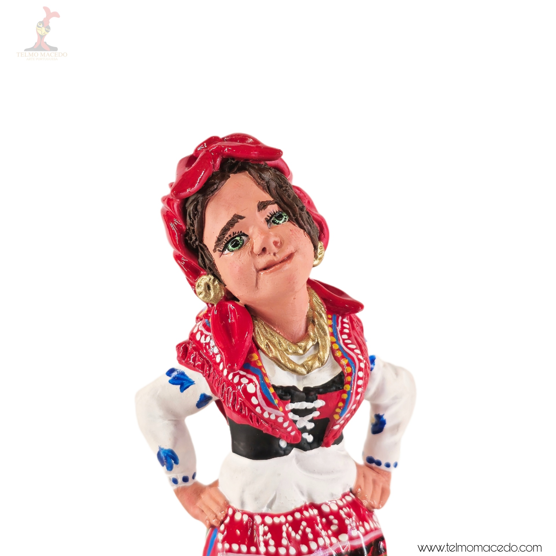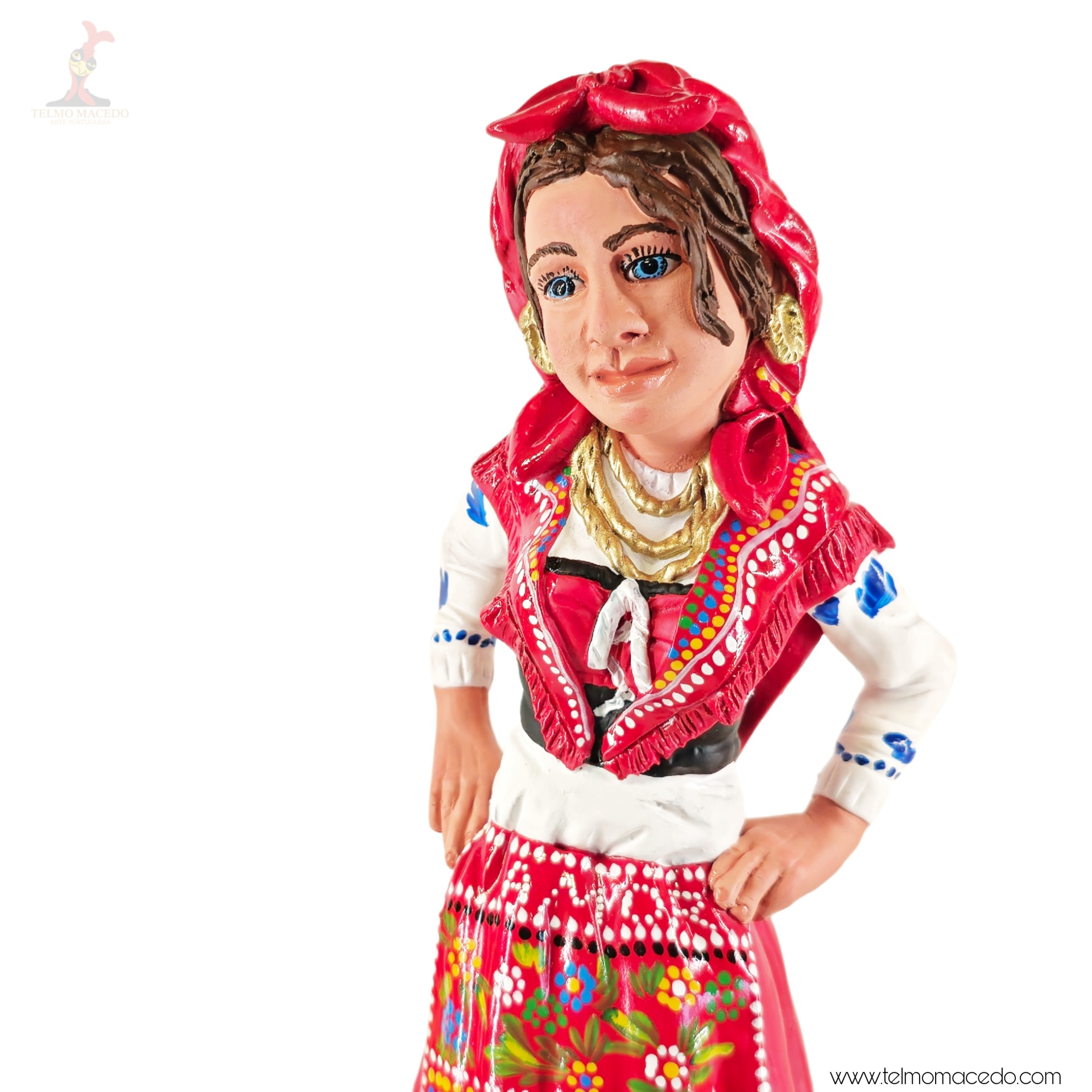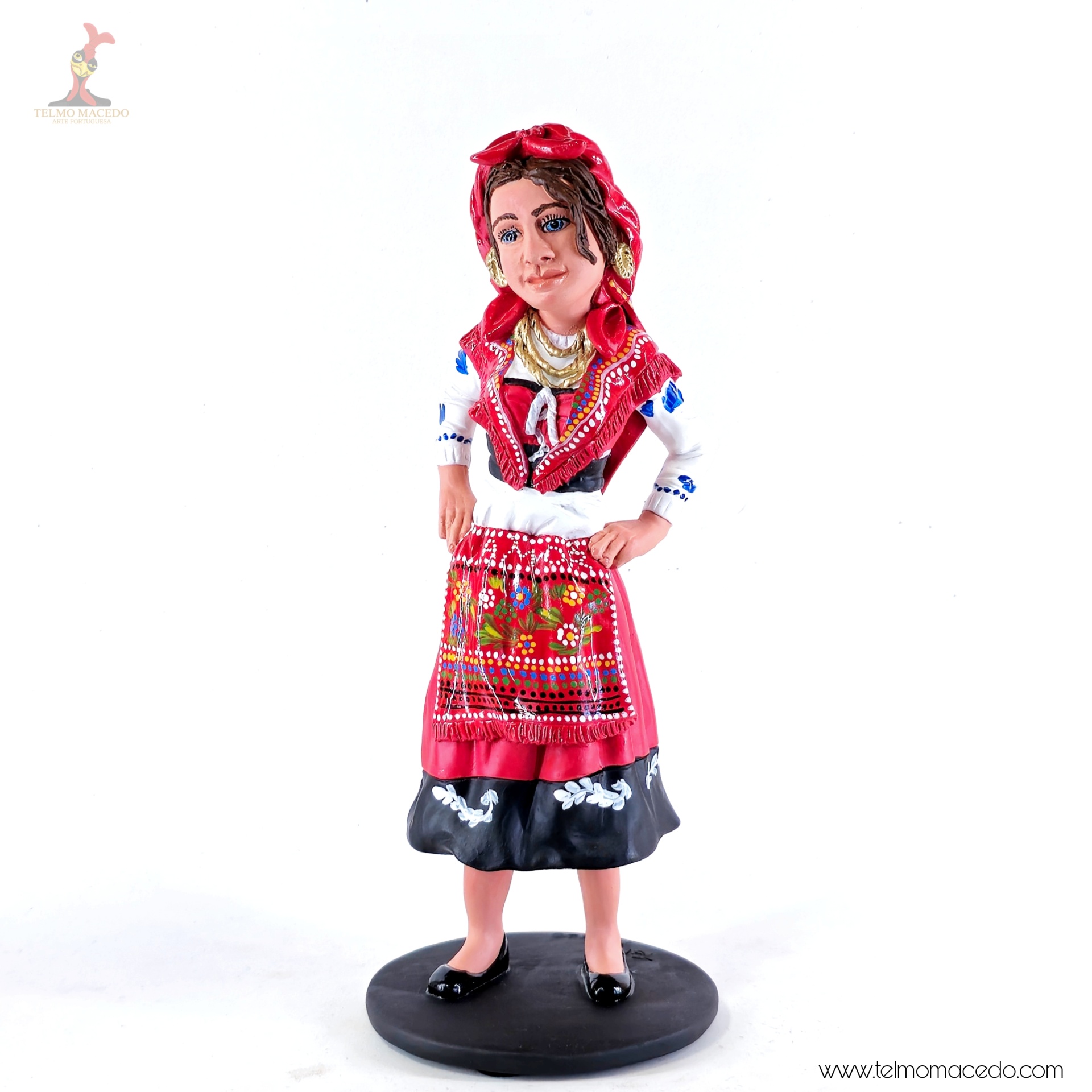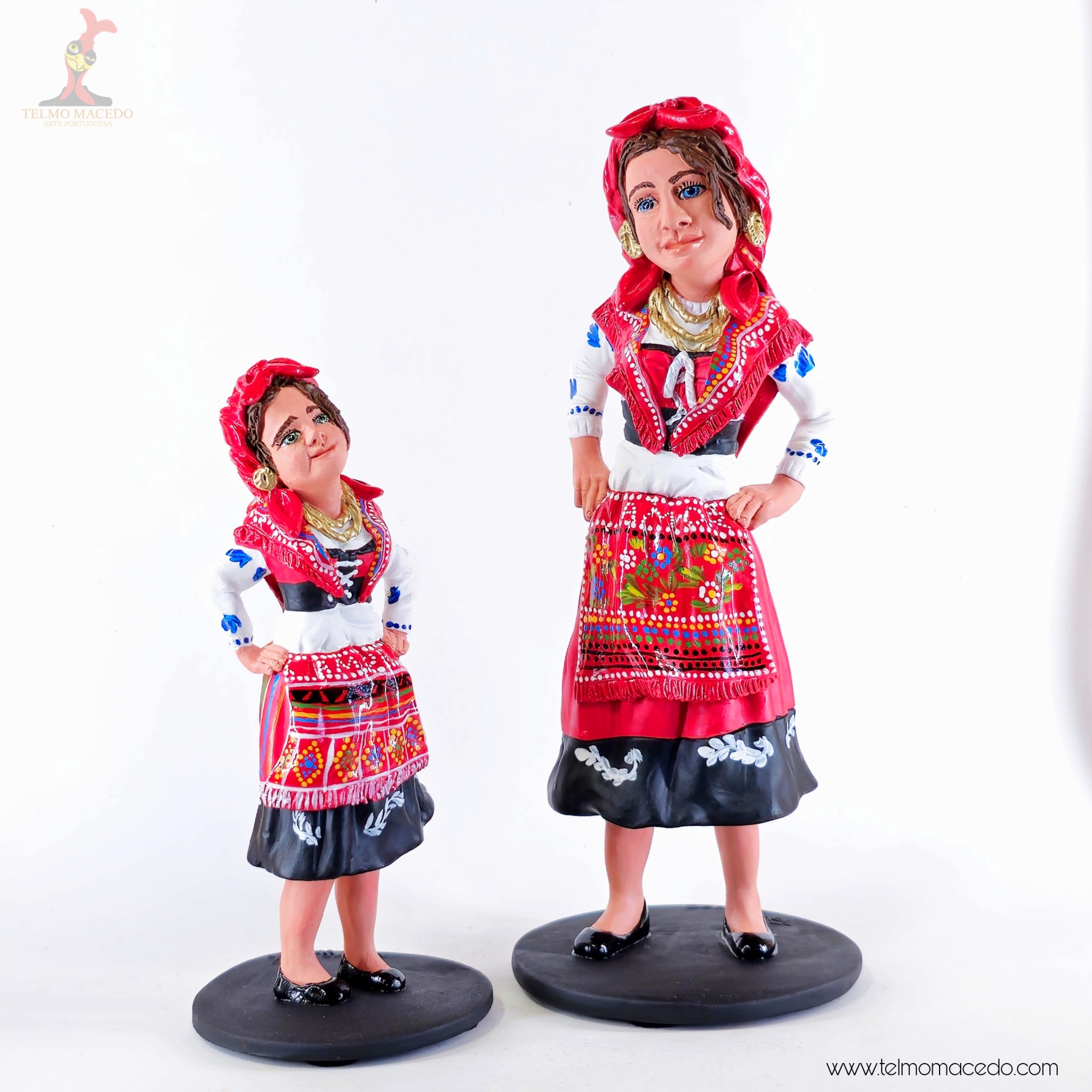 A força e o orgulho da tradição portuguesa, moldados com alma. Estas figuras representam a mulher minhota, vestida com o traje típico, cheia de cor, expressão e identidade. Cada detalhe é feito à mão com amor pelo nosso património.