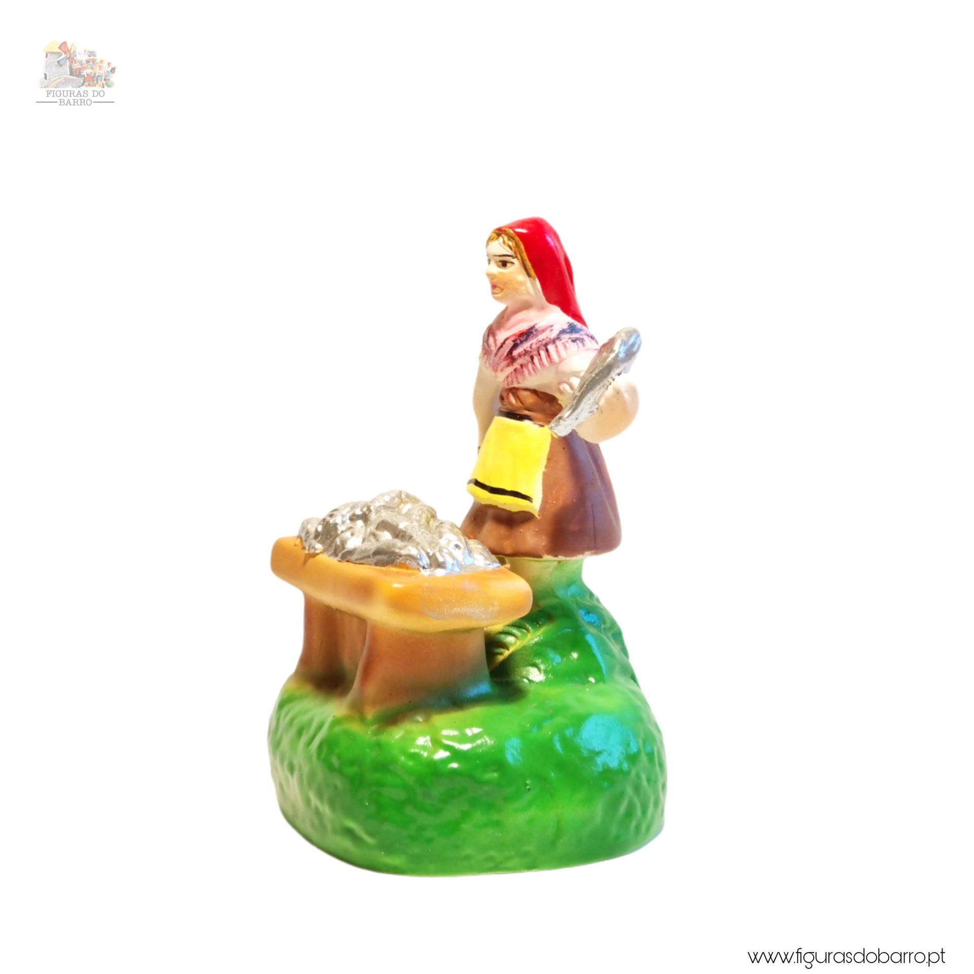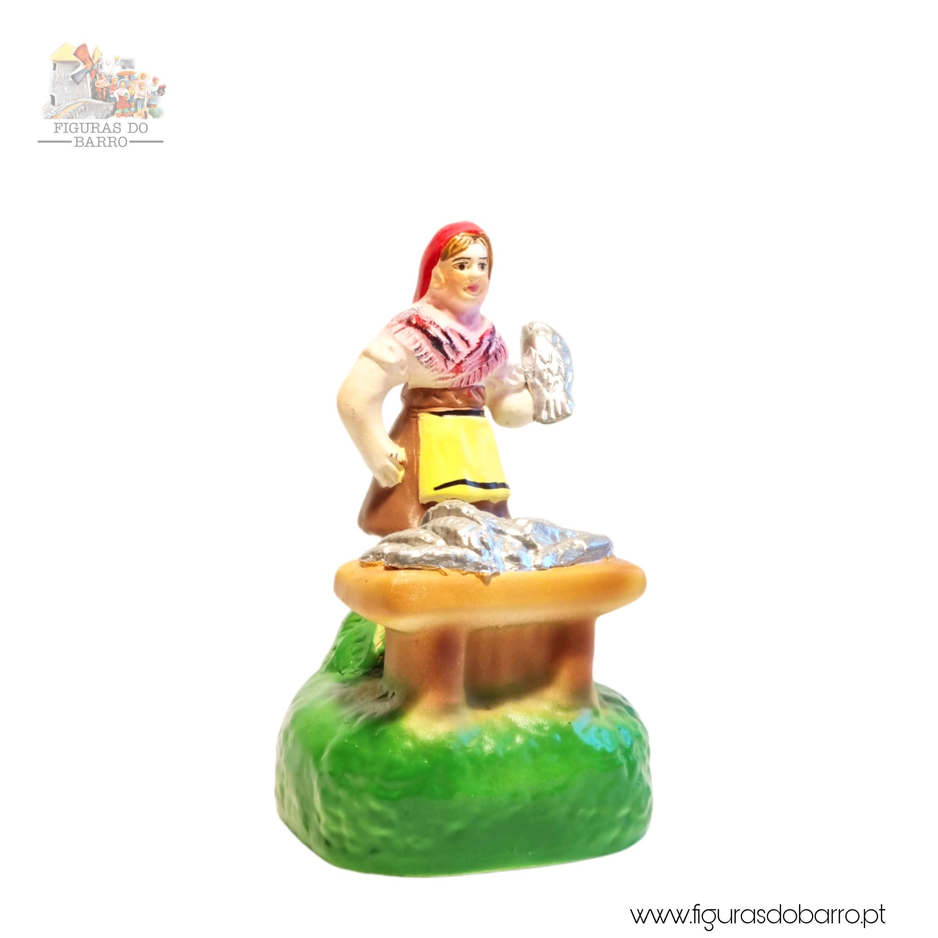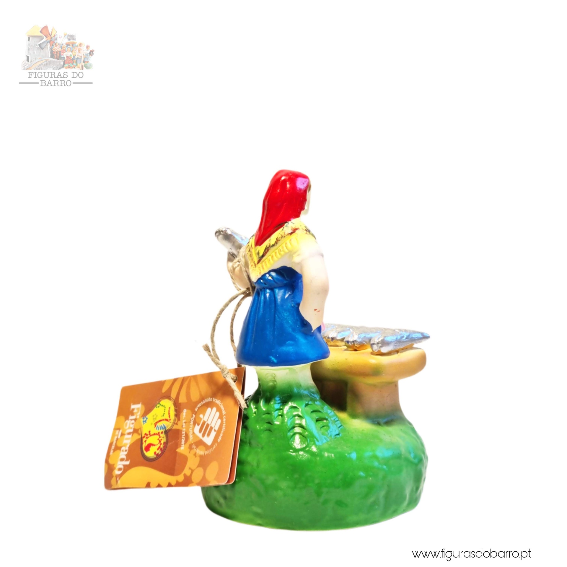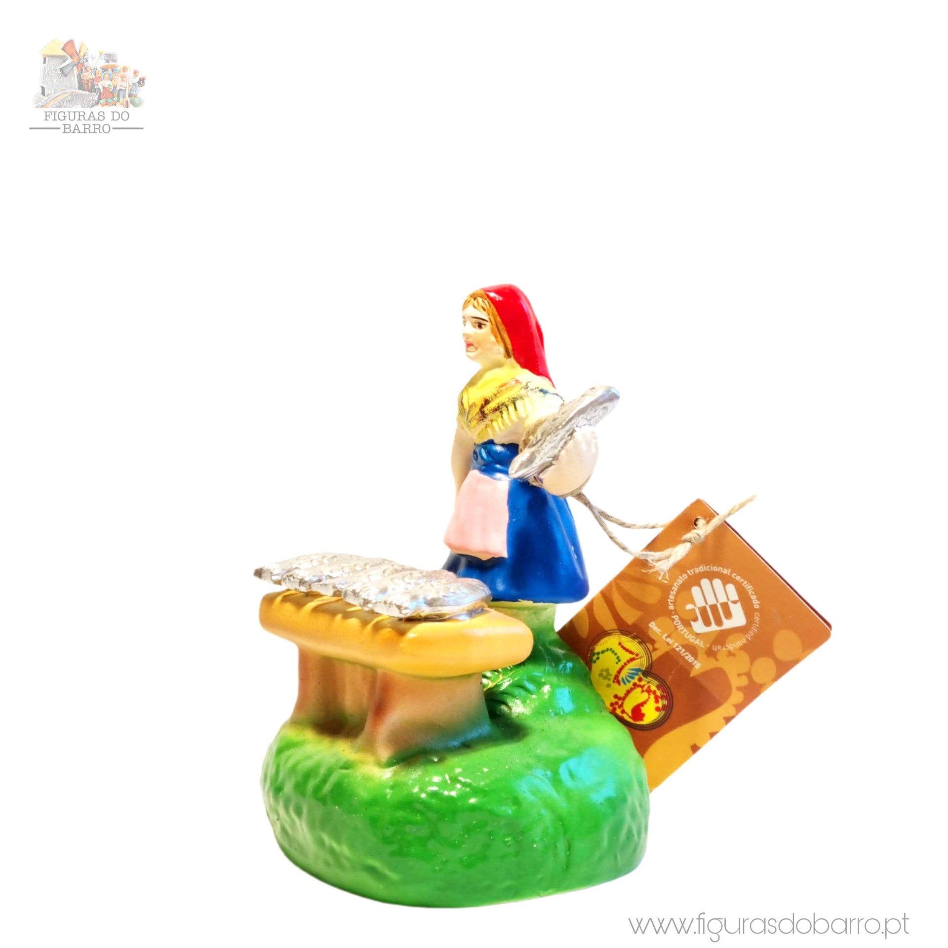 Mulher com banca a vender sardinhas 20,00 € Desconto de %. IVA incluído. Partilhar Cor saia Azul Castanha Vermelha Rosa Lilás Comprar Contactar 1 unidades em stock Figura da mulher a vender sardinhas na banca em cerâmica, ideal para completar a sua cascata de S. João ou o seu presépio. ----- (peças em cerâmica feitas de forma artesanal e pintadas à mão) ----- As peças em cerâmica, certificadas, são da autoria do Artesão João Macedo de Barcelos. Medidas: aproximadamente 12cm de altura. Ref. Interna: 354 Marca Figuras do Barro® Tags cascatacascata de sao joaopresepio artesanalpresepio de barropresepio de ceramicahandmadeceramicceramicaceramicartClaymulherpeixeiramulher peixeirasardinhasvendedora de sardinhasbancamulher a vender na bancamulher com bancavendedoramulher vendedora Características