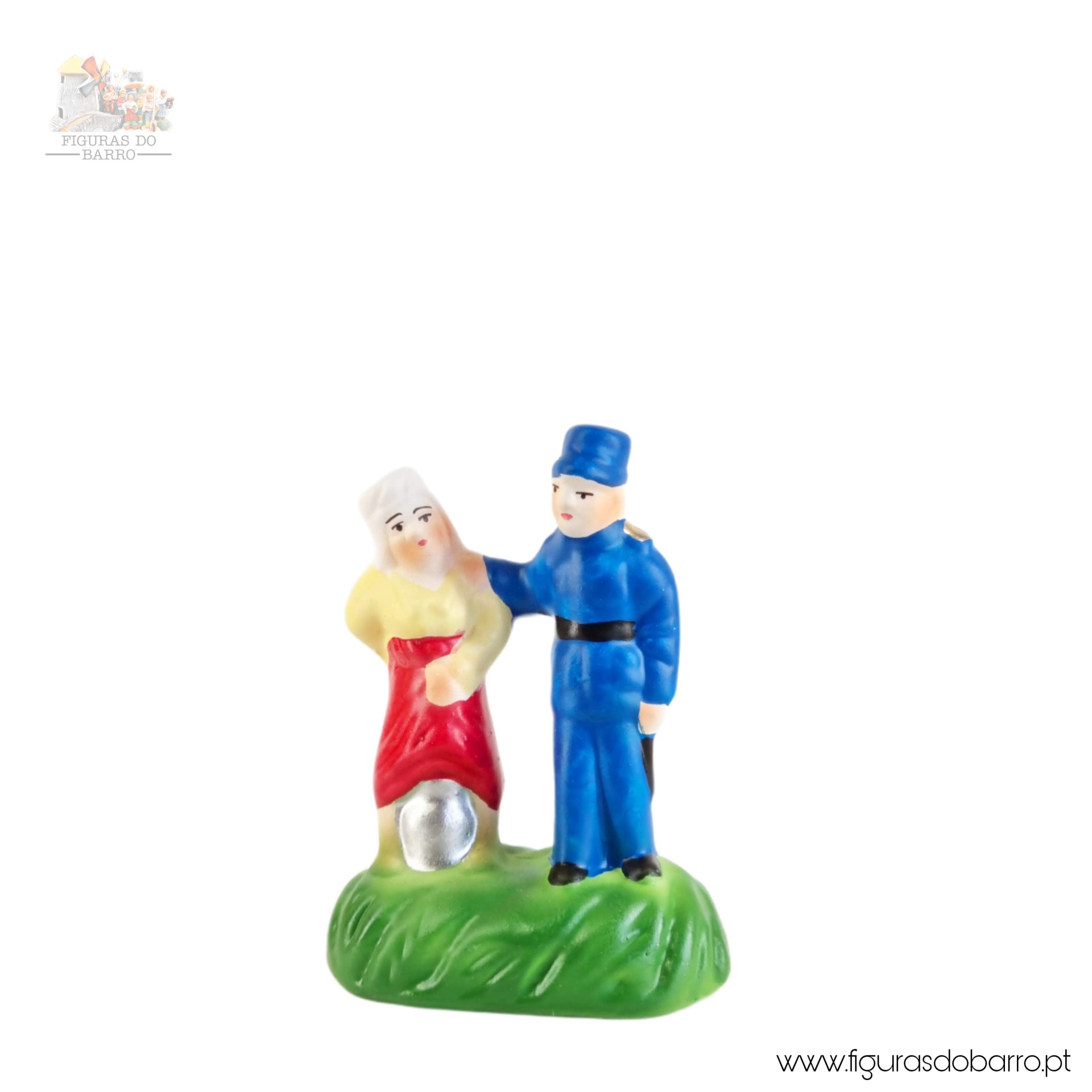 • Figuras cerâmicas de polícia segurando mulheres, pintadas à mão e coloridas, base verde com bola prateada.