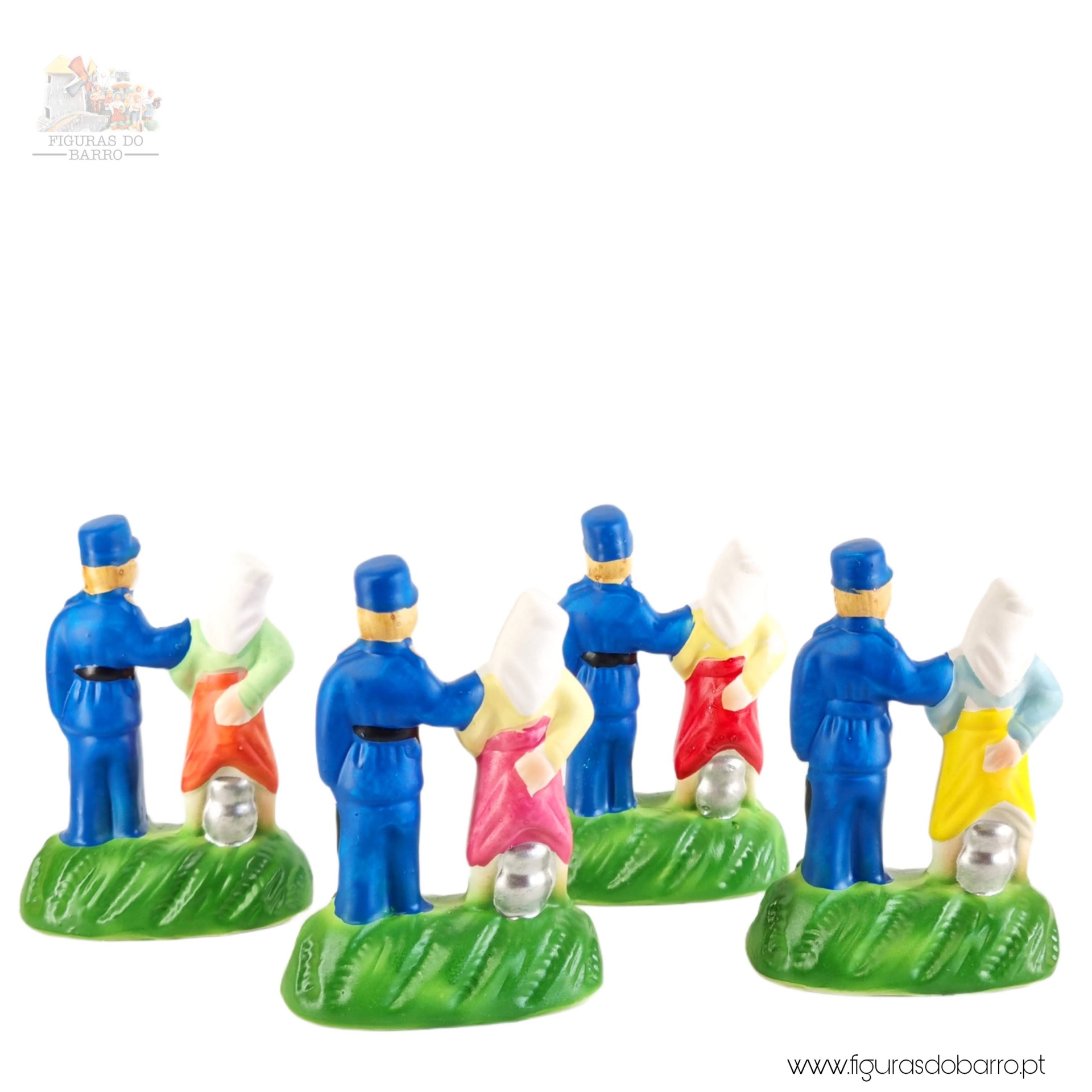 Figuras decorativas de casais com fardas azuis e vestidos coloridos em base verde com bola prateada