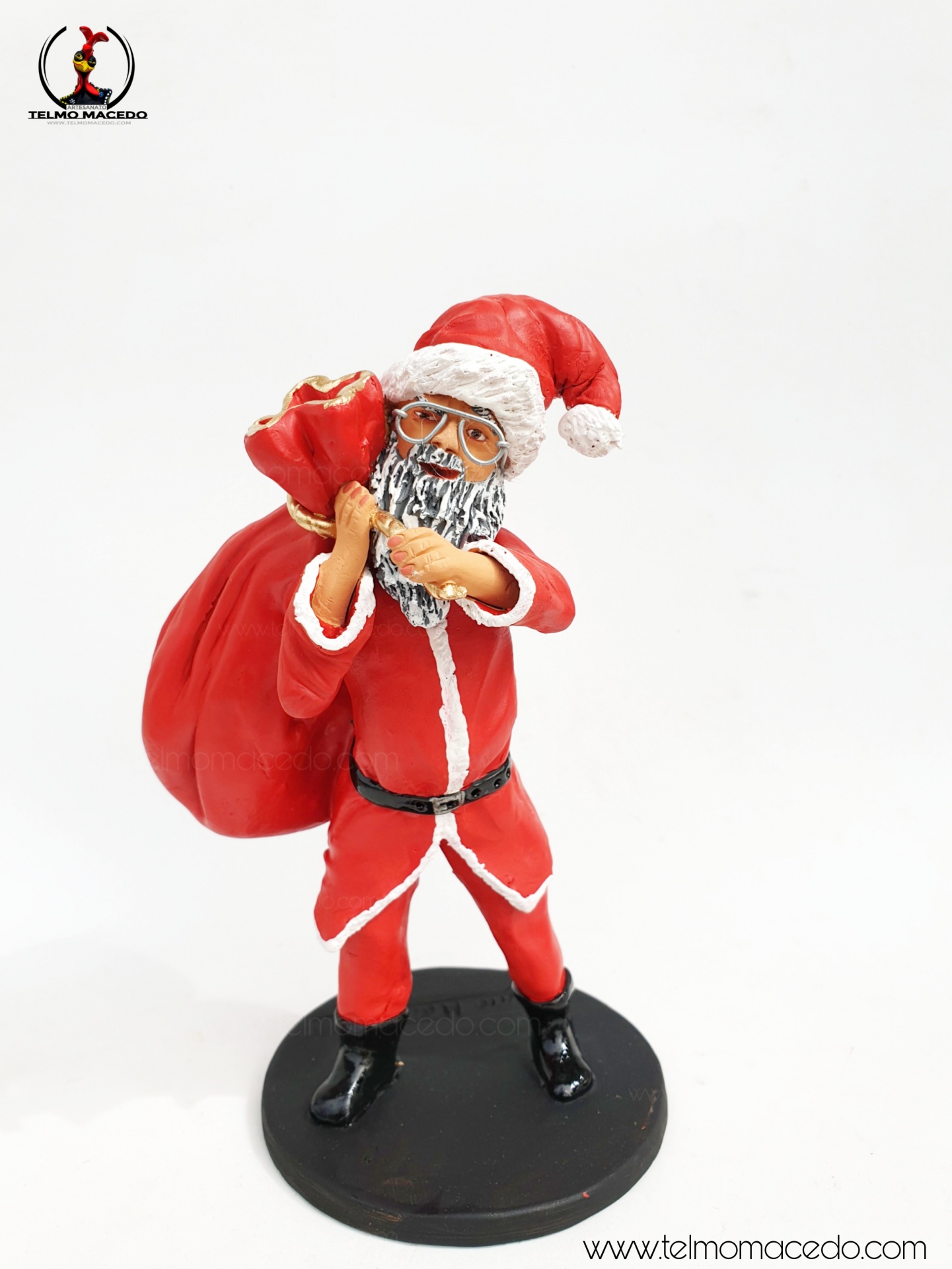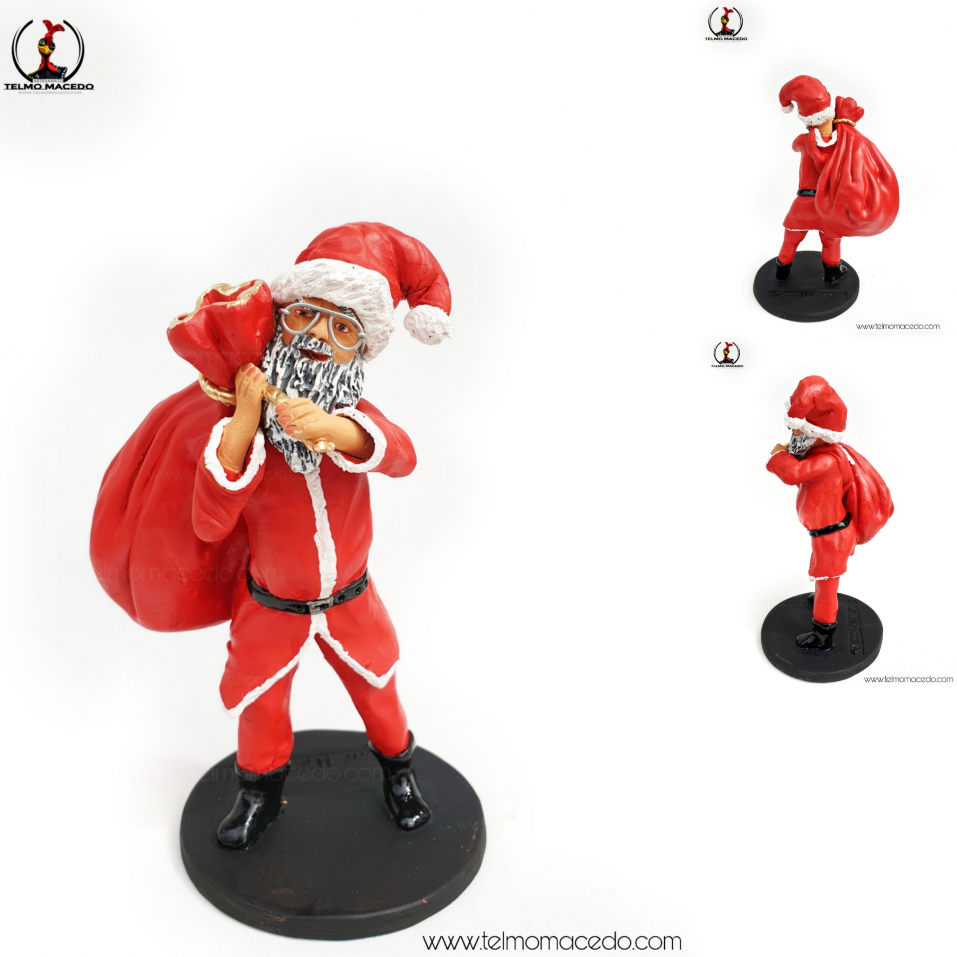 • Estatueta de Pai Natal com saco vermelho e óculos sobre base negra