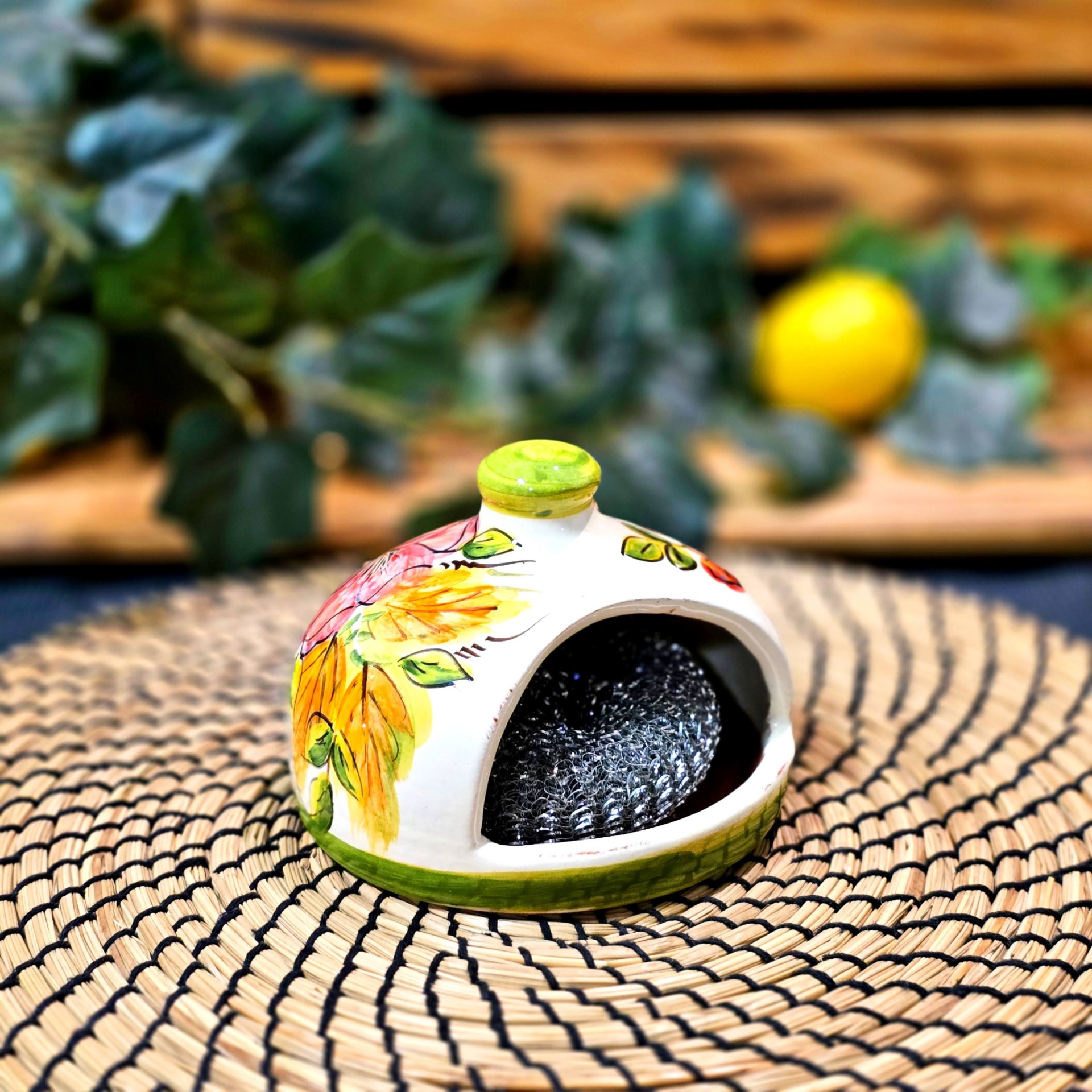 • Suporte em cerâmica decorado com folhas pintadas e porta-esponja de aço sobre base trançada