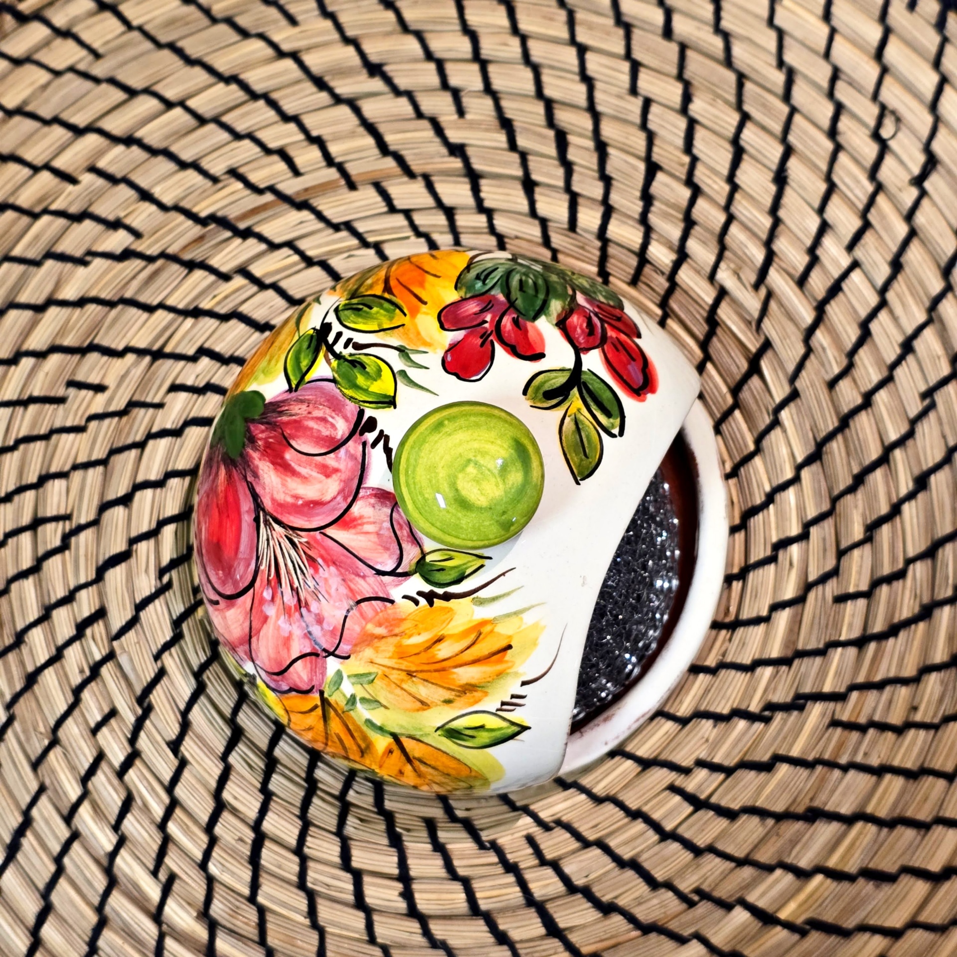 • Suporte cerâmico decorado com flores com rede de esponja metálica dentro