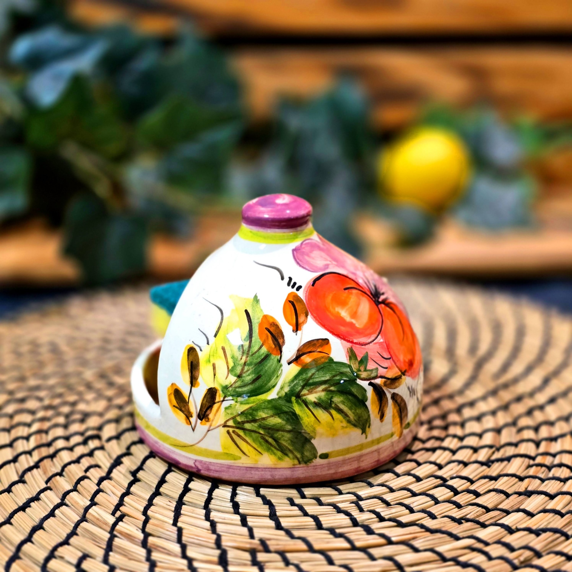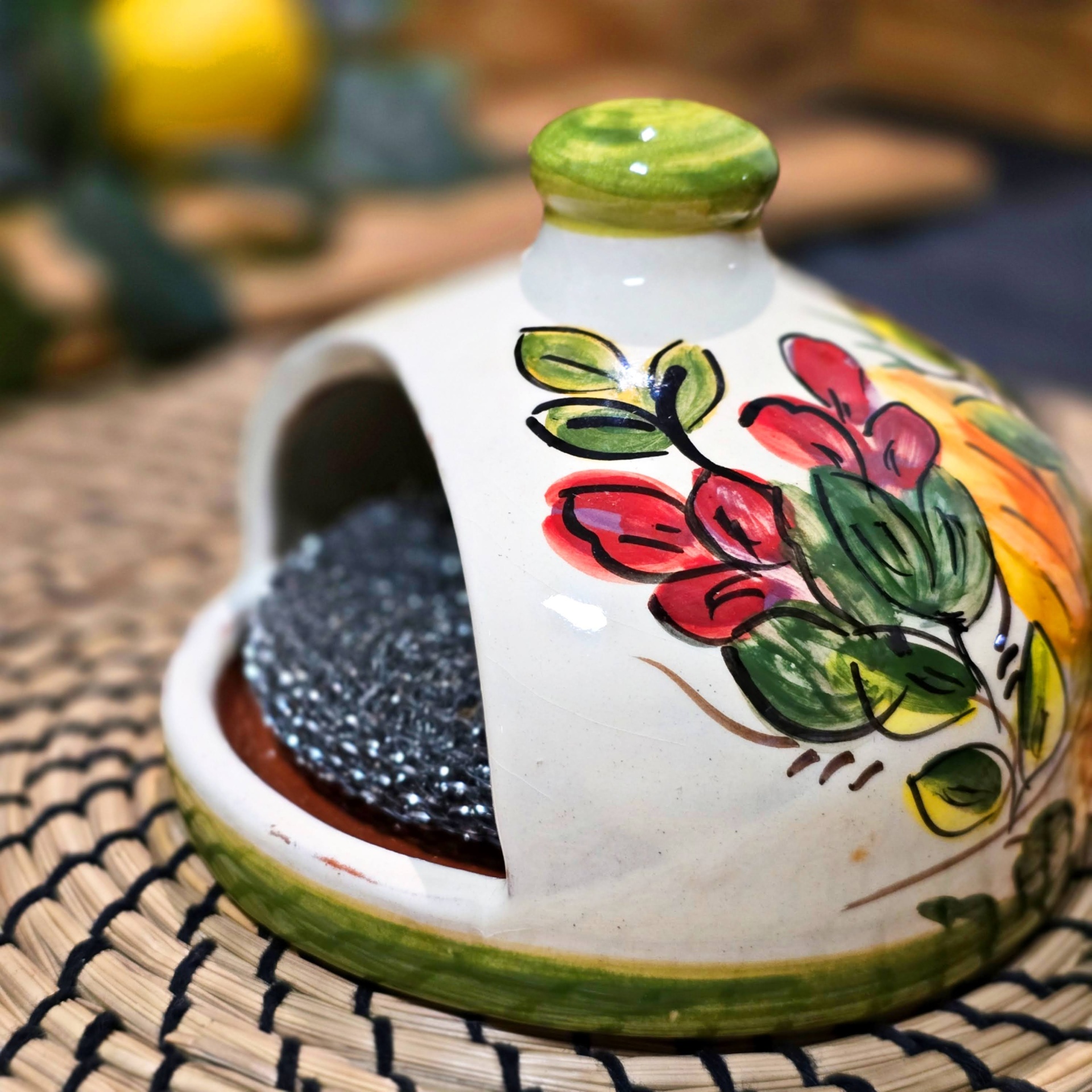 • suporte cerâmica pintado à mão com esponja aço e padrão floral